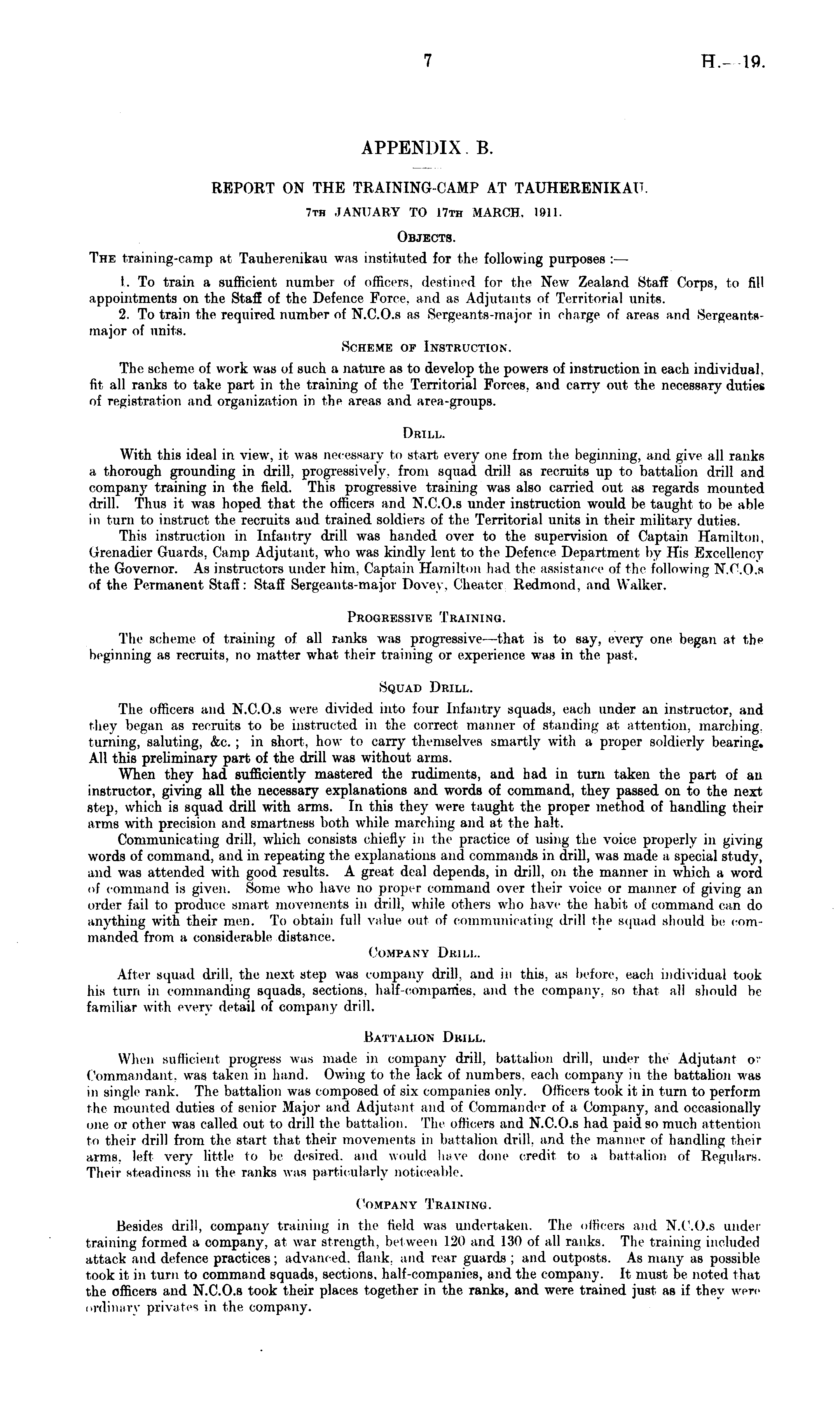 REPORT ON THE TRAINING-CAMP AT TAUHERENIKAU. 7th JANUARY TO 17th MARCH. 1911. Objects. The training-camp at Tauherenikau was instituted for the following purposes : — 1. To train a sufficient numbei of officers, destined for the New Zealand Staff Corps, to fill appointments on the Staff of the Defence Force, and as Adjutants of Territorial units. 2. To train the required number of N.C.O.s as Sergeants-major in charge of areas and Sergeantsmajor of units. Scheme of Instruction. The scheme of work was of such a nature as to develop the powers of instruction in each individual, fit all ranks to take part in the training of the Territorial Forces, and carry out the necessary duties of registration and organization in the areas and area-groups. Drill. With this ideal in view, it was necessary to start every one from the. beginning, and give all ranks a thorough grounding in drill, progressively, from squad drill as recruits up to battalion drill and company training in the field. This progressive training was also carried out as regards mounted drill. Thus it was hoped that the officers and N.C.O.s under instruction would be taught to be able in turn to instruct the recruits and trained soldiers of the Territorial units in their military duties. This instruction in Infantry drill was handed over to the supervision of Captain Hamilton. Grenadier Guards, Camp Adjutant, who was kindly lent to the Defence Department by His Excellency the Governor. As instructors under him, Captain Hamilton had the assistance of the following N.C.O.s of the Permanent Staff: Staff Sergeants-major Dove v. Cheater Redmond, and Walker. Progressiva Training. The scheme of training of all ranks was progressive that is to say, every one began at the beginning as recruits, no matter what their training or experience was in the past. Squad Drill. The officers and N.C.O.s were divided into four Infantry squads, each under an instructor, and they began as recruits to be instructed in the correct manner of standing at attention, marching turning, saluting, &c. ; in short, how to carry themselves smartly with a proper soldierly bearing. All this preliminary part of the drill was without arms. When they had sufficiently mastered the rudiments, and had in turn taken the part of an instructor, giving all the necessary explanations and words of command, they passed on to the next step, which is squad drill with arms. Tn this they were taught the propel method of handling their arms with precision and smartness both while marching and at the halt. Communicating drill, which consists chiefly in the practice of using the voice properly in giving words of command, and in repeating the explanations and commands in drill, was made a special study, and was attended with good results. A great deal depends, in drill, on the manner in which a word of command is given. Some who have no proper command over their voice or manner of giving an order fail to produce smart movements in drill, while others who have the habit, of command can do anything with their men. To obtain lull value out of communicating drill the squad should be com ■ manded from a considerable distance. Company Drill. After squad drill, the nexi Btep was company drill, and in this, as before, each individual took his turn in commanding squads, sections, half-companies, and the company, so that all should be familiar with every detail of company drill. Battalion Drill. When sufficient progress was made in company drill, battalion drill, under the Adjutant or Commandant, was taken in hand. Owing to the lack of numbers, each company in the battalion was in single rank. The battalion was composed of six companies only. Officers took it in turn to perform the mounted duties of senior Major and Adjutant and of Commander of a Company, and occasionally one or other was called out to drill the battalion. The officers and N.C.O.s had paid so much attention to their drill from the start that their movements in battalion drill, and the manner of handling their arms, left very little to lie desired, and would have done credit to a battalion of Regulars. Their steadiness m the ranks was particularly noticeable. Company Training. Besides drill, company training in the field was undertaken. The officers and N.C.O.s under training formed a company, at war strength, between 120 and 130 of all ranks. The training included attack and defence practices; advanced, flank, and rear guards; and outposts. As many as possible took it in turn to command squads, sections, half-companies, and the company. It must be noted i hai the officers and N.C.O.s took their places together in the ranks, and were trained just as if they were ordirtary privates in the company.