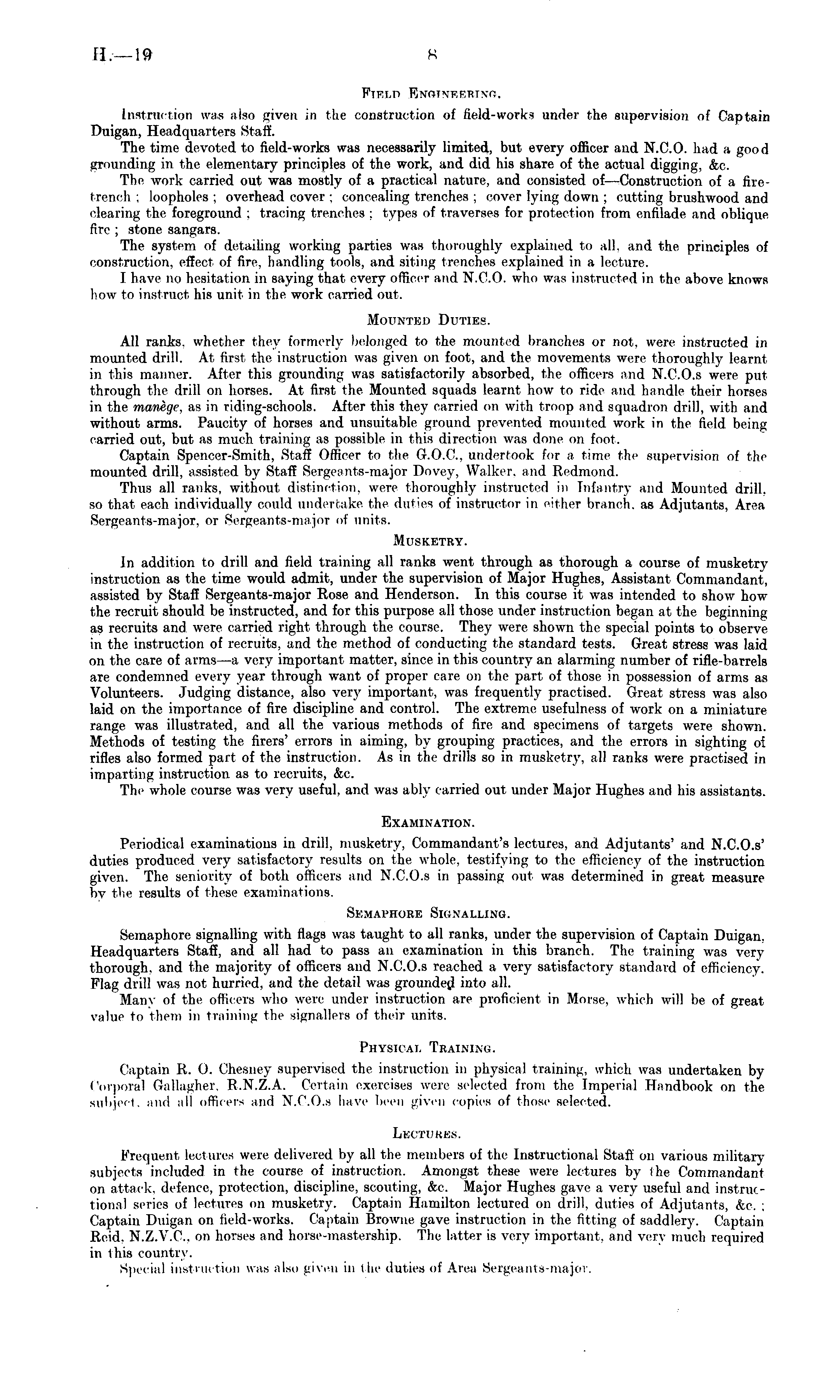 Field Engineering. Instruction was also given in the construction of field-works under the supervision of Captain Duigan, Headquarters Staff The time devoted to field-works was necessarily limited, but every officer and N.C.O. had a good grounding in the elementary principles of the work, and did his share of the actual digging, &c. The work carried out was mostly of a practical nature, and consisted of—Construction of a firetrench ; loopholes: overhead cover; concealing trenches ; cover lying down ; cutting brushwood and clearing the foreground ; tracing trenches ; types of traverses for protection from enfilade and oblique fire ; stone sangars. The system of detailing working parties was thoroughly explained to all, and the principles of construction, effect of fire, handling tools, and siting trenches explained in a lecture. I have no hesitation in saying that every officer and N.C.O. who was instructed in the above knows bow to instruct his unit in the work carried out. Mounted Duties. All ranks, whether they formerly belonged to the mounted branches or not. were instructed in mounted drill. At first the instruction was given on foot, and the movements were thoroughly learnt in this manner. After this grounding was satisfactorily absorbed, the officers and N.C.O.s were put through the drill on horses. At first the Mounted squads learnt how to ride and handle their horses in the manege, as in riding-schools. After this they carried on with troop and squadron drill, with and without arms. Paucity of horses and unsuitable ground prevented mounted work in the field being carried out, but as much training as possible in this direction was done on foot. Captain Spencer-Smith, Staff Officer to the G.0.C.. undertook for a time the supervision of the mounted drill, assisted by Staff Sergeants-major Dovey, Walker, and Redmond. Thus all ranks, without distinction, were thoroughly instructed in Infantry and Mounted drill, so that each individually could undertake the duties of instructor in either branch, as Adjutants, Area Sergeants-major, or Sergeants-major of units. Musketry. In addition to drill and field training all ranks went through as thorough a course of musketry instruction as the time would admit, under the supervision of Major Hughes, Assistant Commandant, assisted by Staff Sergeants-major Rose and Henderson. In this course it was intended to show how the recruit should be instructed, and for this purpose all those under instruction began at the beginning as recruits and were carried right through the course. They were shown the special points to observe in the instruction of recruits, and the method of conducting the standard tests. Great stress was laid on the care of arms —a very important matter, since in this country an alarming number of rifle-barrels are condemned every year through want of proper care on the part of those in possession of arms as Volunteers. Judging distance, also very important, was frequently practised. Great stress was also laid on the importance of fire discipline and control. The extreme usefulness of work on a miniature range was illustrated, and all the various methods of fire and specimens of targets were shown. Methods of testing the firers' errors in aiming, by grouping practices, and the errors in sighting of rifles also formed part of the instruction. As in the drills so in musketry, all ranks were practised in imparting instruction as to recruits, &c. The whole course was very useful, and was ably carried out under Major Hughes and his assistants. Examination. Periodical examinations in drill, musketry, Commandant's lectures, and Adjutants' and N.C.O.s' duties produced very satisfactory results on the whole, testifying to the efficiency of the instruction given. The seniority of both officers and N.C.O.s in passing out was determined in great measure by the results of these examinations. Semaphore Signalling. Semaphore signalling with flags was taught to all ranks, under the supervision of Captain Duigan. Headquarters Staff, and all had to pass an examination in this branch. The training was very thorough, and the majority of officers and N.C.O.s reached a very satisfactory standard of efficiency. Flag drill was not hurried, and the detail was grounded into all. Many of the officers who were under instruction are proficient in Morse, which will be of great value to them in training the signallers of their units. Physical Training. Captain It. (). Chesney supervised the instruction in physical training, which was undertaken by Corporal Gallagher, R.N.Z.A. Certain exercises were selected from the Imperial Handbook on the subject, and all officers and N.C.O.s have been given copies of those selected. Lectures. Frequent lecture-: were delivered by all the members of tie' Instructional Staff on various military subjects included in the course of instruction, imongst these were lectures by the Commandant on attack-, defence, protection, discipline, scouting, &c. Major Hughes gave a very useful and instructional series of lectures on musketry. Captain Hamilton lectured on drill, duties of Adjutants. &c. ; Captain Duigan on field-works. Captain Browne gave instruction in the fitting of saddlery. Captain Reid, N.Z.V.C., on horses and horse-mastership. The latter is very important, and very much required in this country. Special instruction was also given in the duties oi Area Sergeants-major.