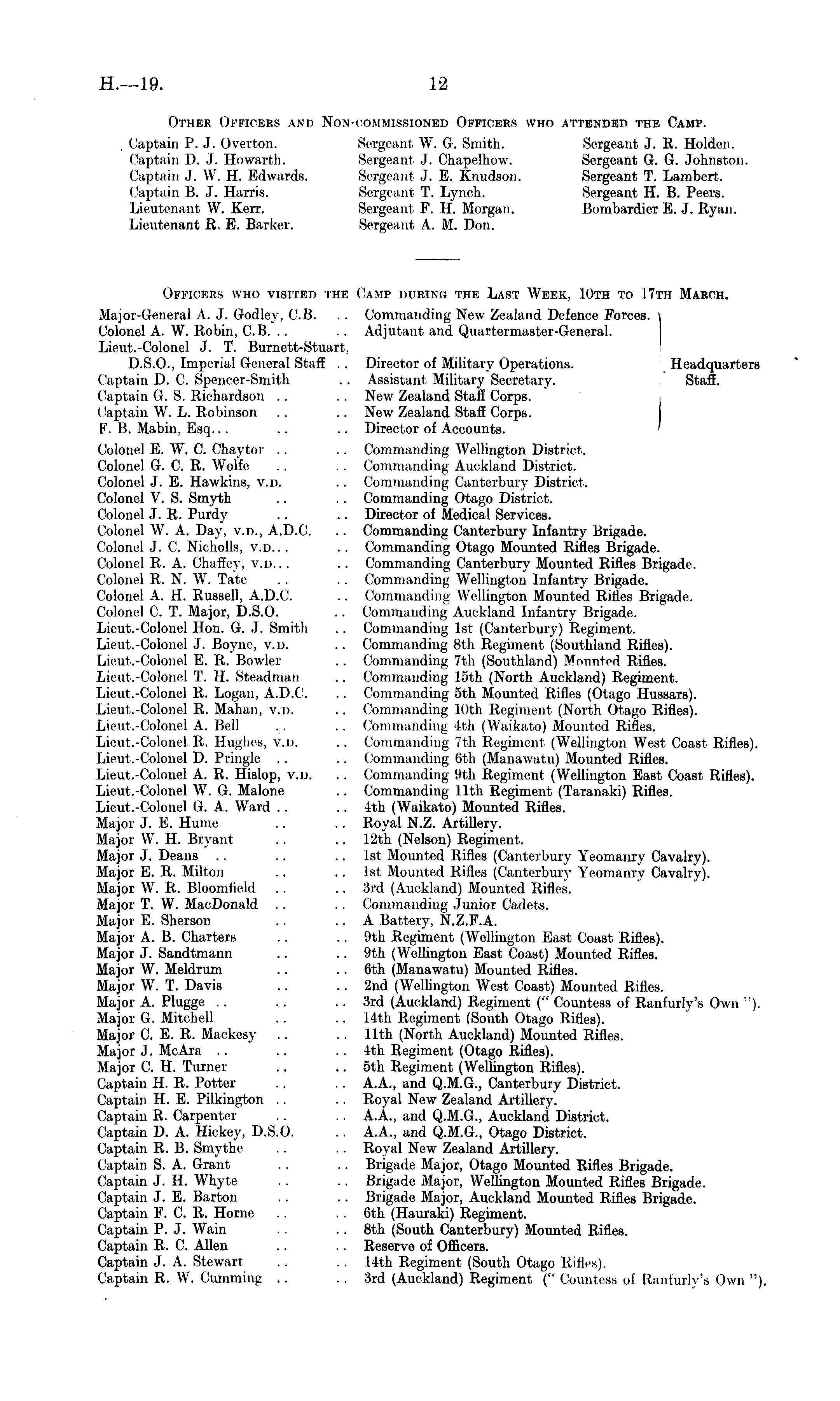 Other Officers and Non-commissioned Officers who attended the Camp. Captain P. J. Overton. Sergeant W. G. Smith. Sergeant J. R. Holden. Captain D. J. Howarth. Sergeant J. Chapelhow. Sergeant G. G. Johnston. Captain .1. W. H. Edwards. Sergeant J. E. Knudson. Sergeant T. Lambert. Captain B. J. Harris. Sergeant T. Lynch. Sergeant H. B. Peers. Lieutenant W. Kerr. Sergeant F. H. Morgan. Bombardier E. J. Ryan. Lieutenant R. E. Barker. Sergeant A. M. Don. Officers who visited the Camp during the Last Week, 10th to 17th March. Major-General A. .). Godley, CB. .. Commanding New Zealand Defence Forces. Colonel A. W T . Robin, C.B. .. .. Adjutant and Quartermaster-General. Lieut.-Colonel J. T. Burnett-Stuart, D.5.0., Imperial General Staff .. Director of Military Operations. Headquarters Captain D. C. Spencer-Smith .. Assistant Military Secretary. Staff. Captain G. S. Richardson .. New Zealand Staff Corps. Captain W. L. Robinson .. .. New Zealand Staff Corps. F. 15. Mabin, Esq... .. .. Director of Accounts. ' Colonel E. W. C. Chaytor .. Commanding Wellington District. Colonel G. C. R. Wolfe .. .. Commanding Auckland District. Colonel J. E. Hawkins, v.d. .. Commanding Canterbury District. Colonel V. S. Smyth . . .. Commanding Otago District. Colonel J. R. Purdy .. .. Director of Medical Services. Colonel W. A. Day, v.d., A.D.C. .. Commanding Canterbury Infantry Brigade. Colonel J. C. Nicholls, v.d. .. .. Commanding Otago Mounted Rifles Brigade. Colonel R. A. Chaffey, v.d.. . .. Commanding Canterbury Mounted Rifles Brigade. Colonel R. N. AY. Tate .. .. Commanding Wellington Infantry Brigade. Colonel A. H. Russell, A.D.C. . . Commanding Wellington Mounted Rifles Brigade. Colonel C. T. Major, D.S.O. .. Commanding Auckland Infantry Brigade. Lieut.-Colonel Hon. G. J. Smith .. Commanding Ist (Canterbury) Regiment. Lieut.-Colonel J. Boyne, v.d. .. Commanding Bth Regiment (Southland Rifles). Lieut.-Colonel E. R. Bowler . . Commanding 7th (Southland) Mounted Rifles. Lieut.-Colonel T. H. Steadman .. Commanding 15th (North Auckland) Regiment. Lieut.-Colonel R. Logan, A.D.C. .. Commanding sth Mounted Rifles (Otago Hussars). Lieut.-Colonel R. Malum, v.d. .. Commanding 10th Regiment (North Otago Rifles). Lieut.-Colonel A. Bell .. .. Commanding 4th (Waikato) Mounted Rifles. Lieut.-Colonel R. Hughes, v.d. .. Commanding 7th Regiment (Wellington West Coast Rifles). Lieut.-Colonel D. Pringle .. .. Commanding 6th (Manawatu) Mounted Rifles. Lieut.-Colonel A. R. Hislop, v.d. . . Commanding 9th Regiment (Wellington East Coast Rifles). Lieut.-Colonel W. G. Malone .. Commanding 1 lth Regiment (Taranaki) Rifles. Lieut.-Colonel G. A. Ward . . .. 4th (Waikato) Mounted Rifles. Major J. E. Hume .. . . Royal N.Z. Artillery. Major W. H. Bryani .. .. 12th (Nelson) Regiment. Major J. Deans .. .. Ist Mounted Rifles (Canterbury Yeomanry Cavalry). Major E. R. Milton .. .. Ist Mounted Rifles (Canterbury Yeomanry Cavalry). Major W. R. Bloomfield .. .. 3rd (Auckland) Mounted Rifles. Major T. W. Mac Donald .. .. Commanding Junior Cadets. Major E. Sherson .. .. A Battery, N.Z.F.A. Major A. B. Charters .. .. 9th Regiment (Wellington East Coast Rifles). Major J. Sandtniann .. .. 9th (Wellington East Coast) Mounted Rifles. Major W. Meldrum .. .. 6th (Manawatu) Mounted Rifles. Major W. T. Davis .. .. 2nd (Wellington West Coast) Mounted Rifles. Major A. Pluggc .. .. .. 3rd (Auckland) Regiment (" Countess of Ranfurly's Own "). Major G. Mitchell .. .. 14th Regiment (South Otago Rifles). Major C. E. R. Mackesy .. .. 11th (North Auckland) Mounted Rifles. Major J. McAra .. .. 4th Regiment (Otago Rifles). Major C. H. Turner .. .. sth Regiment (Wellington Rifles). Captain H. R. Potter .. A.A., and Q.M.G., Canterbury District. Captain H. E. Pilkington .. .. Royal New Zealand Artillery. Captain R. Carpenter .. .. A.A., and Q.M.G., Auckland District. Captain D. A. Hickey, D.S.O. .. A.A., and Q.M.G., Otago District. Captain R. B. Smythe .. .. Royal New Zealand Artillery. Captain S. A. Grant .. .. Brigade Major, Otago Mounted Rifles Brigade. Captain J. H. Whyte .. Brigade Major, Wellington Mounted Rifles Brigade. Captain J. E. Barton .. .. Brigade Major, Auckland Mounted Rifles Brigade. Captain F. C. R. Home .. .. 6th (Hauraki) Regiment. Captain P. J. Wain .. Bth (South Canterbury) Mounted Rifles. Captain R. C. Allen .. Reserve of Officers. Captain J. A. Stewart .. .. 14th Regiment (South Otago Ritles). Captain R. W. dimming . . 3rd (Auckland) Regiment (" Countess of Ranfurly's Own ")