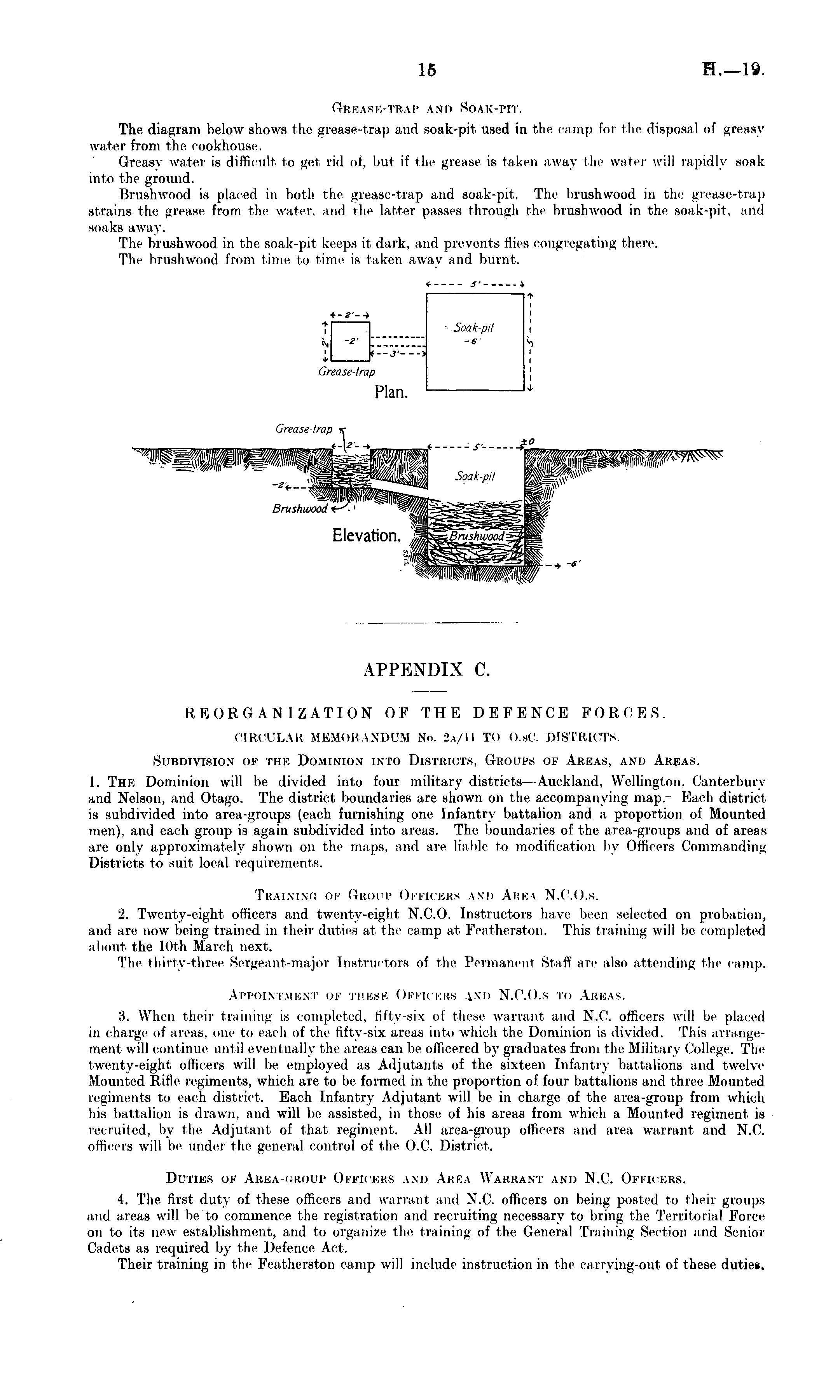 APPENDIX C. REORGANIZATION OF THE DEFENCE FORCES. CIRCULAR MEMORANDUM No. la/II TO O.sC. DISTRICTS. Subdivision of the Dominion into Districts, Groups of Areas, and Areas. I. The Dominion will be divided into four military districts- Auckland. Wellington. Canterbury and Nelson, and Otago. The district boundaries ate shown on the accompanying map; Each district is subdivided into area-groups (each furnishing one Infantry battalion and a proportion of Mounted men), and each group is again subdivided into areas. The boundaries of the area-groups and of areas are only approximately shown on the maps, and are liable to modification by Officers Commanding Districts to suit local requirements. Training of Group Officers and Are* N.C.O.s. i. Twenty-eight officers and twenty-eight N.C.O. Instructors have been selected on probation, and arc now being trained in their duties at the camp at Featherston. This training will be completed about the loth March next. The thirty-three Sergeant-major Instructors of the Permanent Staff are also attending the cam]). Appointment ok these Officers vn'd N.C.O.s to Areas. 3. When then- training is completed, fifty-six of these warrant and N.C. officers will be placed in charge of areas, one to each of the fifty-six areas into which the Dominion is divided. This arrangement will continue until eveni nally the areas can be officered by graduates from the Military <lollege. The twenty-eight officers will lie employed as Adjutants of the sixteen Infant iy battalions and twelve Mounted Rifle regiments, which are to be formed in the proportion of four battalions and three Mounted regiments to each district. Each Infantry Adjutant will be in charge of the area-group from which his battalion is drawn, and will be assisted, in those of his areas from which a Mounted regiment is recruited, by the Adjutant of that regiment. All area-group officers and area warrant and N.C. officers will be under the general control of the O.C. District. Duties ok Area-group Officers and Area Warrant and N.C. Officers. 4. The first duty of these officers and warrant and N.C. officers on being posted to their groups and areas will be to commence the registration and recruiting necessary to bring the Territorial Force on to its new establishment, and to organize the training of the General Training Section and Senior Cadets as required by the Defence Act. Their training in the Featherston camp will include instruction in the carrying-out of these duties.