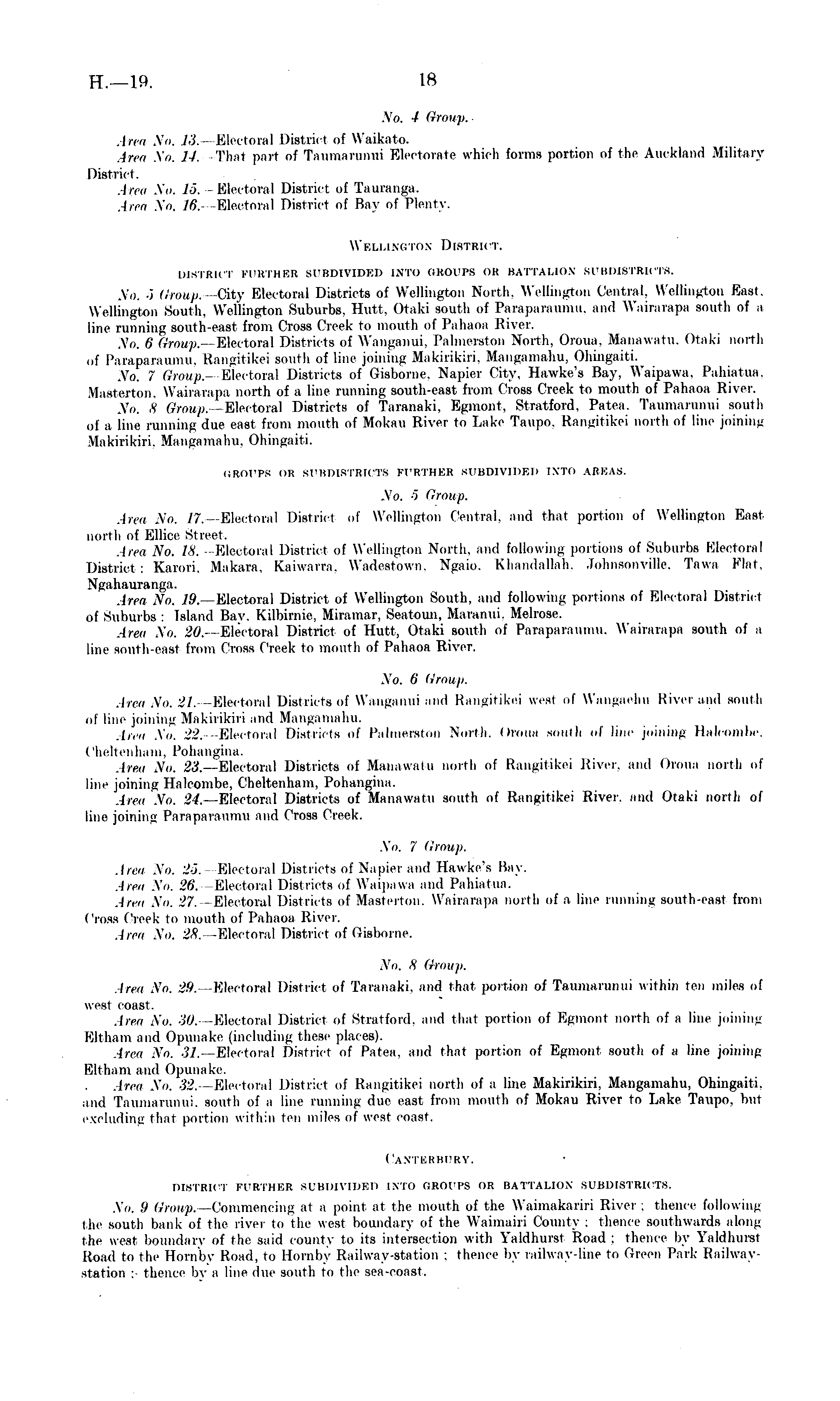 No. 1 thou/). Area So. 13. Electoral District of Waikato. Area No. 14. Thai part of Taumarunui Electorate which forms portion of the Auckland Military District. Area So. 15. Electoral District of Tauranga. Area So. 16. Eleotoral District of Ray of Plenty. Wellington District, district further subdivided into groups ob battalion subdistricts. No. ■> Crimp. City Electoral Districts of Wellington North. Wellington Central. Wellington Fasl. Wellington South. Wellington Suburbs. Hutt. Otaki south of Paraparaumu. and Wairarapa south of a line running south-east from Cross Creek to mouth of Pahaoa River. No. Ii Group. Electoral Districts of Wanganui. Palmerston North, Oroua. Manawatu. Otaki north of I'araparauniii. Rangitikei SOUth of line joining Makirikiri. Mangamahu, Ohingaiti. So. 7 (Iron/).- Electoral Districts of (iisborne. Napier City. Hawke's Bay. Waipawa. I'ahiatua. Masterton. Wairarapa north of a line running south-east from Cross Creek to mouth of Pahaoa River. No. 8 Group. Electoral Districts of Taranaki. Egmont, Stratford. Patea. Taiiniariinui south of a line running due east from mouth of Mokarj River to Lake Taupo. Rangitikei north of line joining Makirikiri. Mangamahu, Ohingaiti. GROUPS oil SUBDISTRICTS FURTHER SUBDIVIDED INTO AREAS. .Yo. 5 Croup. Area No. 17. - Electoral District of Wellington Central, and thai portion of Wellington Fast north of Ellice Street. Area No. IS. Electoral District of Wellington North, and following portions of Suburbs Electoral District : Karori. Makara. Kaiwarra. Wadestown. Ngaio. Khandallah. .lolinsonville. Tnwa Flat. Ngahauranga. Area So. I!/. Electoral District of Wellington South, and following portions of Electoral District of Suburbs : Island Bay, Kilbirnie. Minimal. Seatoun. Maranui. Melrose. Area So. 20. Electoral District of Hutt, Otaki south of Paraparaumu, Wairarapa south of a line south east from Cross Creek to mouth of Pahaoa River. No. 6 Crou/j. Area So. :'l. Electoral Districts of Wanganui and Rangitikei west of Wangaehii River and south of line joining Makirikiri and Mangamahu. Area So. 22. Electoral Districts of Palmerston North. Oroua south of line joining Haloombe, I helienhani. I'ohangiiia. Area So. 23. —Electoral Districts of Manawatu north of Rangitikei River, and Oroua north of line joining Halcombe. Cheltenham. Pohangina. Area No. 21.— Electoral Districts of Manawatu south ol Rangitikei River, and Otaki north of line joining Paraparaumil and Cross Creel;. No. i Group. Area So. 2-J. Electoral Districts of Napier and Hawke's Bay. Area So. 26. Electoral Districts of Waipawa and Pahiatua. Area So. 27. Electoral Districts of Masterton. Wairarapa north of a line running south-east from Cross Creek to mouth of Pahaoa River. Area So. 28. -Electoral District of Gisborne. No. S (houp. Area So. 2V. Electoral District of Taranaki. and that portion of Taumarunui within ten miles of west coast. Area So. -if). -Electoral District of Stratford, and that portion of Egmont north of a line joining Eltham and Opunake (including these places). Area So. 31.— Electoral District of Patea. and that portion of Egmont south of a line joining Kb ham and (Ipunake. Area So. :',2. Electoral District of Rangitikei north of a line Makirikiri. Mangamahu. Ohingaiti. and Taumarunui. south of a line running due east from mouth of Mokau River to Lake Taupo. but excluding that portion within ten miles of west coast. Canterbury. district further subdivided into groups or battalion subdistrictB. No. U Croup. Commencing at a point at the mouth of the Waimakariii River: thence following the south fiank of the river to the west boundary of the Waimairi County : thence southwards along the west boundary of the said county to its intersection with Yaldhurst Road : thence by Yaldhurst Road to the Hornby Road, to Hornby Railway-station : thence by railway-line to Green Park Railwaystation ; thence by a line due south to the sea-coast.