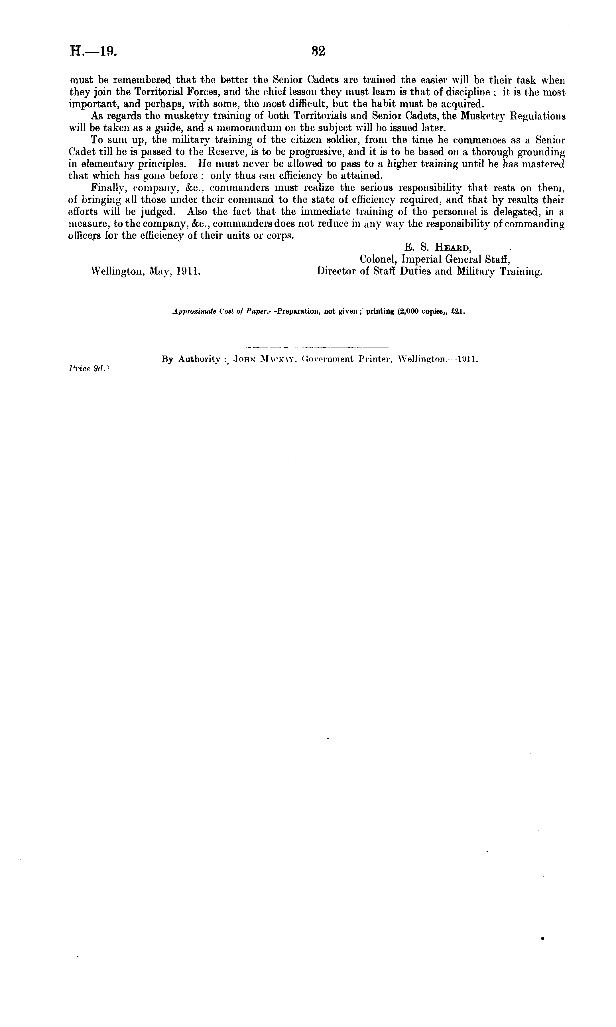 must be remembered that the better the Senior Cadets arc trained the easier will be their task when they join the Territorial Forces, and the chief lesson they must learn is that of discipline ; it is the most important, and perhaps, with some, the most difficult, but the habit must be acquired. As regards the musketry training of both Territorials and Senior Cadets,the Musketry Regulations will be taken as a guide, anil a memorandum on the subject will bis issued later. To sum up, the military training of the citizen soldier, from the time he commences as a Senior Cadet till he is passed to the Reserve, is to be progressive, and it is to be based on a thorough grounding in elementary principles. He must never be allowed to pass to a higher training until he has mastered I hat which has gone before : only thus can efficiency be attained. Finally, company, &c. commanders must realize the serious responsibility that rests on them. of bringing all those under their command to the state of efficiency required, and that by results their efforts will be judged. Also the fact that the immediate training of the personnel is delegated, in a measure, to the company, &c, commanders docs not reduce in any way the responsibility- of commanding officers lor the efficiency of their units or corps. E. S. Heard, Colonel, Imperial General Staff, Wellington. May. Dill. Director of Staff Duties and Military Training. Approsrimate VoH of Paper. —Preparation, not given; printing (2,000 uopiee,, £21.
