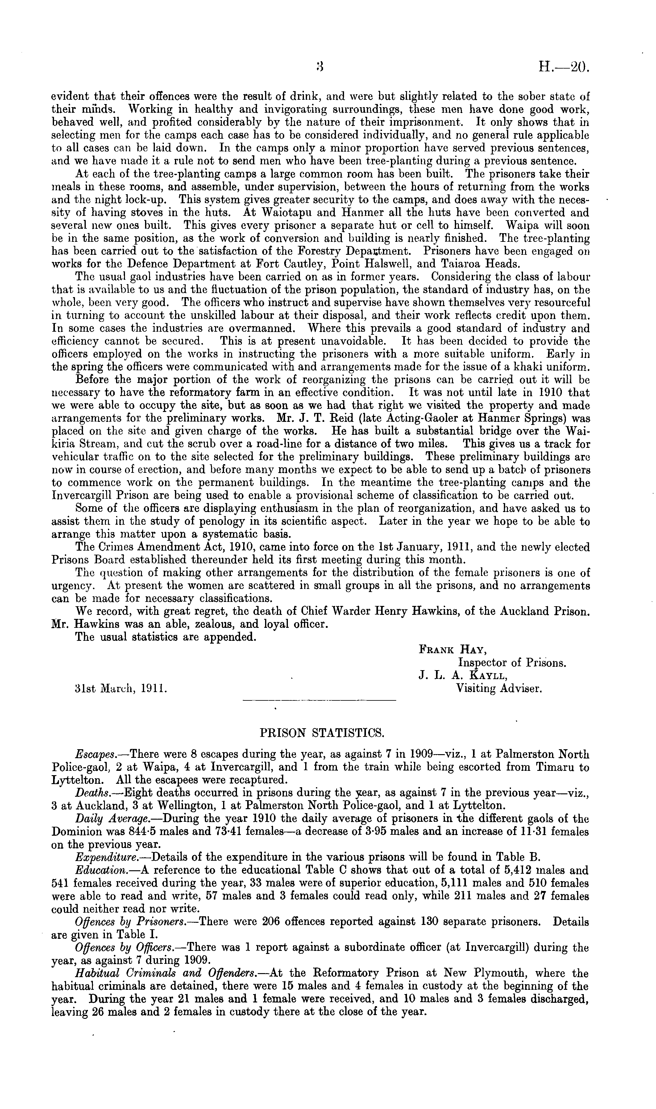 evident that their offences were the result of drink, and were but slightly related to the sober state of their minds. Working in healthy and invigorating surroundings, these men have done good work, behaved well, and profited considerably by the nature of their imprisonment. It only shows that in selecting men for the camps each case has to be considered individually, and no general rule applicable to all cases can be laid down. In the camps only a minor proportion have served previous sentences, and we have made it a rule not to send men who have been tree-planting during a previous sentence. At each of the tree-planting camps a large common room has been built. The prisoners take their meals in these rooms, and assemble, under supervision, between the hours of returning from the works and the night lock-up. This system gives greater security to the camps, and does away with the necessity of having stoves in the huts. At Waiotapu and Hanmer all the huts have been converted and several new ones built. This gives every prisoner a separate hut or cell to himself. Waipa will soon be in the same position, as the work of conversion and building is nearly finished. The tree-planting has been carried out to the satisfaction of the Forestry Department. Prisoners have been engaged on works for the Defence Department at Fort Cautley, Point Halswell, and Taiaroa Heads. The usual gaol industries have been carried on as in former years. Considering the class of labour that is available to us and the fluctuation of the prison population, the standard of industry has, on the whole, been very good. The officers who instruct and supervise have shown themselves very resourceful in turning to account the unskilled labour at their disposal, and their work reflects credit upon them. In some cases the industries are overmanned. Where this prevails a good standard of industry and efficiency cannot be secured. This is at present unavoidable. It has been decided to provide the officers employed on the works in instructing the prisoners with a more suitable uniform. Early in the spring the officers were communicated with and arrangements made for the issue of a khaki uniform. Before the major portion of the work of reorganizing the prisons can be carried out it will be necessary to have the reformatory farm in an effective condition. It was not until late in 1910 that we were able to occupy the site, but as soon as we had that right we visited the property and made arrangements for the preliminary works. Mr. J. T. Rcid (late Acting-Gaoler at Hanmer Springs) was placed on the site and given charge of the works. He has built a substantial bridge over the Waikiria Stream, and cut the scrub over a road-line for a distance of two miles. This gives us a track for vehicular traffic on to the site selected for the preliminary buildings. These preliminary buildings are now in course of erection, and before many months we expect to be able to send up a batch of prisoners to commence work on the permanent buildings. In the meantime the tree-planting camps and the Invercargill Prison are being used to enable a provisional scheme of classification to be carried out. Some of the officers are displaying enthusiasm in the plan of reorganization, and have asked us to assist them in the study of penology in its scientific aspect. Later in the year we hope to be able to arrange this matter upon a systematic basis. The Crimes Amendment Act, 1910, came into force on the Ist January, 1911, and the newly elected Prisons Board established thereunder held its first meeting during this month. The question of making other arrangements for the distribution of the female prisoners is one of urgency. At present the women are scattered in small groups in all the prisons, and no arrangements can be made for necessary classifications. We record, with great regret, the death of Chief Warder Henry Hawkins, of the Auckland Prison. Mr. Hawkins was an able, zealous, and loyal officer. The usual statistics are appended. Frank Hay, Inspector of Prisons. J. L. A. Kayll, 31st March, 1911. Visiting Adviser.