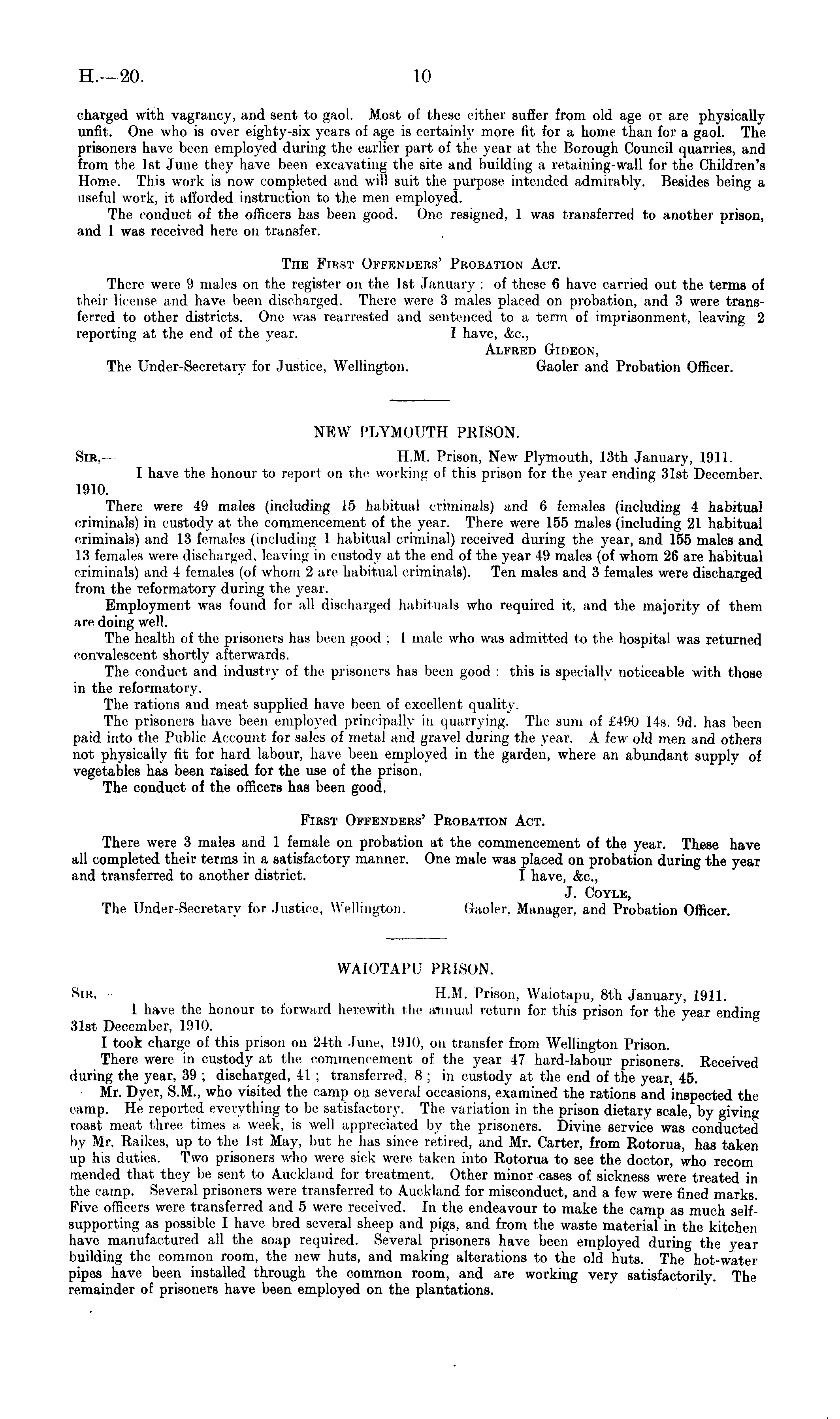 NEW PLYMOUTH PRISON. Sir. H.M. Prison, New Plymouth, 13th January, 1911. I have the honour to report on the working of this prison for the year ending 31st December. 1910. There were 49 males (including 15 habitual criminals) and (i females (including 4 habitual criminals) in custody at the commencement of the year. There were 155 males (including 21 habitual criminals) and L 3 females (including 1 habitual criminal) received during the year, and 155 males and 13 females were discharged, leaving in custody at the end of the year 111 males (of whom 26 are habitual criminals) and 4 females (of whom i tire habitual criminals). Ten males and 3 females were discharged from the reformatory during tin- year. Employment was found for all discharged habituals who required it. and the majority of them are doing well. The health of the prisoners has been good ; I male who was admitted to the hospital was returned convalescent shortly afterwards. The conduct and industry of the prisoners has been good : this is specially noticeable with those in the reformatory. The rations and meat supplied have been of excellent quality. The prisoners have been employed principally in quarrying. The sum of £490 14s. 9d. has been paid into the Public Account for sales of metal and gravel during the year. A few old men and others not physically fit for hard labour, have been employed in the garden, where an abundant supply of vegetables has been raised for the use of the prison, The conduct of the officers has been good. First Offenders' Probation Act. There were 3 males and 1 female on probation at the commencement of the year. These have all completed their terms in a satisfactory manner. One male was placed on probation during the year and transferred to another district. I have, &c, J. Coyle, The Under-Secretary lor Justice, Wellington. Gaoler, Manager, and Probation Officer.