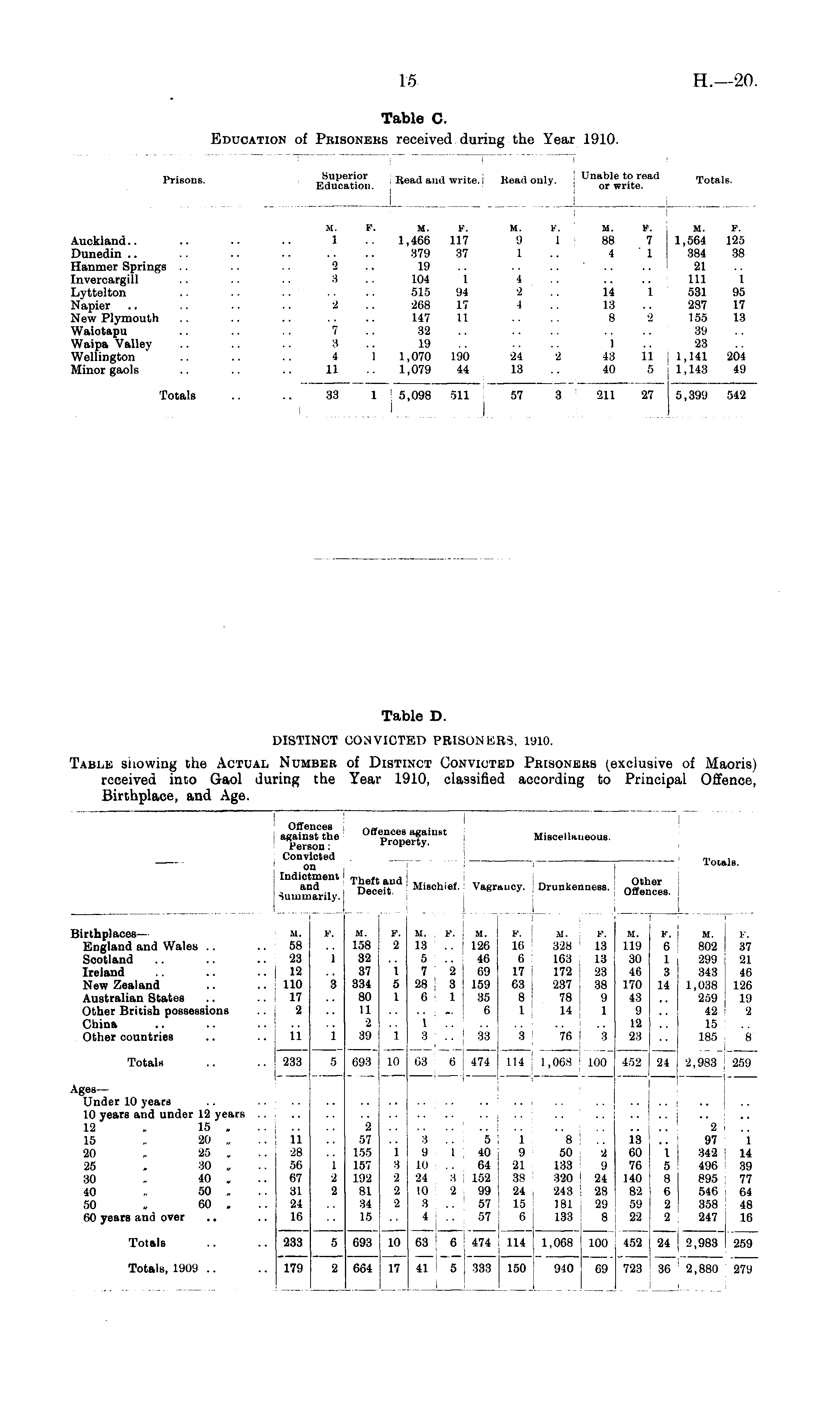 Table D. DISTINCT CONVICTED PRISONERS, 1910. Table showing the Actual Number of Distinct Convicted Prisoners (exclusive of Maoris) received into Gaol during the Year 1910, classified according to Principal Offence, Birthplace, and Age.
