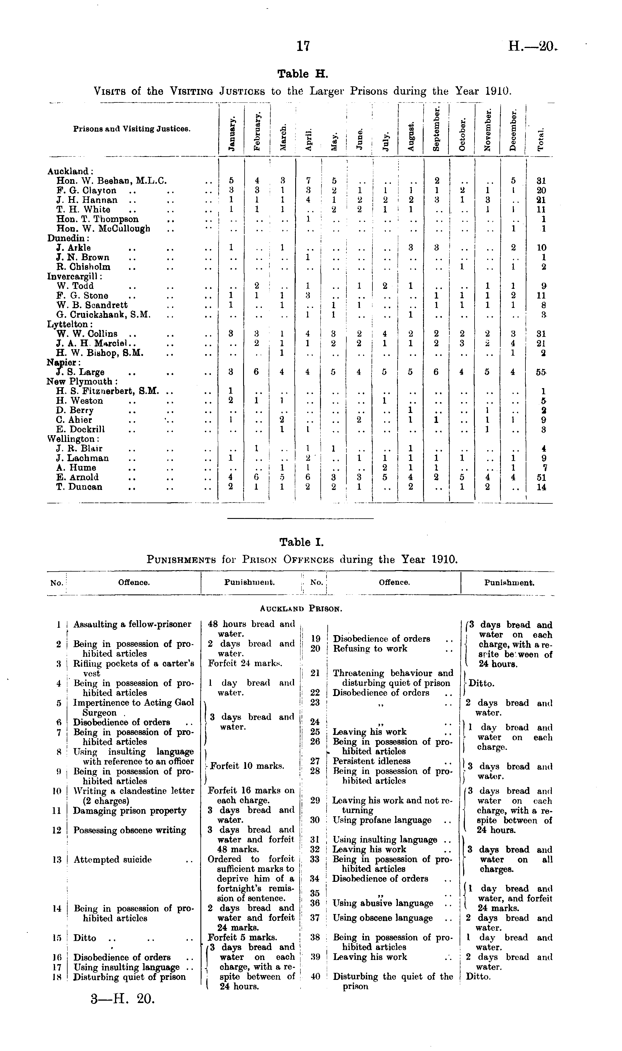 Table H. Visits of the Visiting Justices to the Larger Prisons during the Year 1910.