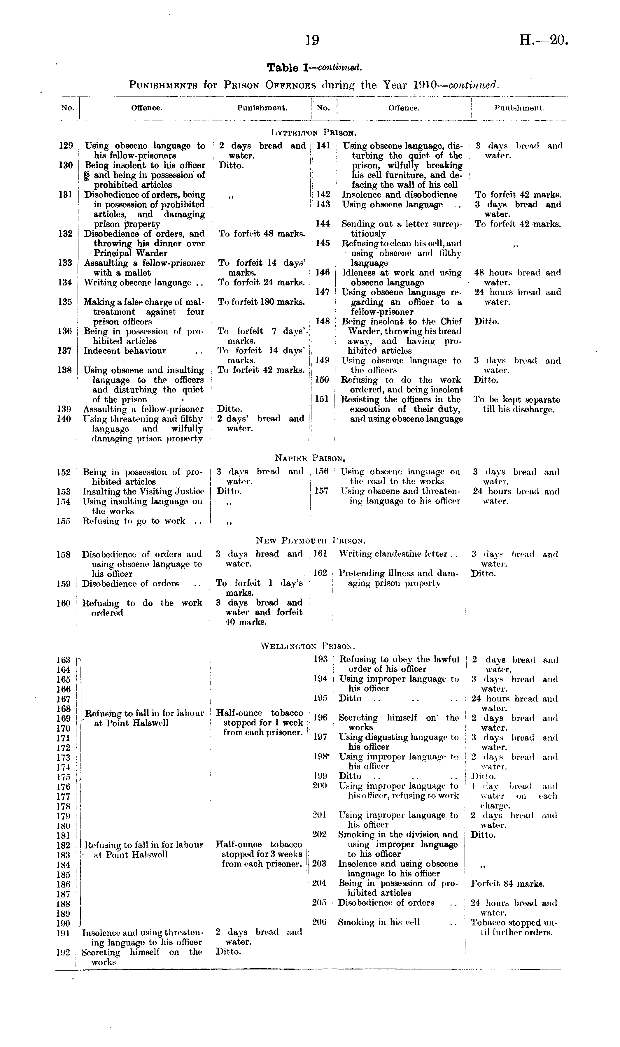 No. Offence. Punishment. No. Offence. Punishment. No. Lyttelton Prison. 129 Using obsoene language to 2 days bread and II 141 Using obscene language, dis- 3 days bread and his fellow-prisoners water. turning the quiet of the water. 130 Being insolent to his offioer Ditto. prison, wilfully breaking jj> and being in possession of his cell furniture, and deprohibited artioles facing the wall of his cell 131 Disobedience of orders, being .. 142 insolence and disobedience To forfeit 42 marks. in possession of prohibited 143 Using obscene language . . 3 days bread and articles, and damaging water. prison property 144 Sending out a letter surrep- To forfeit 42 marks. 132 Disobedience of orders, and To forfeit 48 marks. titiously throwing his dinner over 145 Refusing to clean his oell, and Principal Warder using obscene and filthy 133 , Assaulting a fellow-prisoner To forfeit 14 days' j language with a mallet marks. 146 Idleness at work and using 48 hours bread and 134 Writing obscene language .. To forfeit 24 marks. obscene language water. 147 Using obscene language re- 21 hour! bread and 135 , Making a false charge of mal- To forfeit 180 marks. garding an officer to a water. treatment against four i fellow-prisoner prison officers 148 Being insolent to the Chief Ditto. 136 Being in possession of pro- To forfeit 7 days'. Warder, throwing his bread hibited articles marks. away, and having pro137 Indecent behaviour .. To forfeit 14 days' ', hibited artioles marks. 149 I'sing obscene language to 3 days bread and 138 Using obsoene and insulting To forfeit 42 marks. the officers ter. language to the officers ISO Refusing to do the work Ditto. and disturbing the quiet ordered, and being ins, of the prison • 151 Resisting the officers in the To be kept separate 139 Assaulting a fellow-prisoner Ditto. execution of their duty, till his discharge. 140 Using threatening and filthy 2 days' bread and and using obscene language language and wilfully water, damaging prison property ' Napier Prison, 152 Being in possession of pro- I 3 days bread and 156 Using obscene language on 3 days bread and hibited ;ii t water. oad to the works water. 153 Insulting tho Visiting Justice Ditto. 157 Using obscene and threaten- 24 hours bread and 154 Using insulting language on ,, ing language to hi- officer water. t he works 166 Refusing to go to work .. ,, New Plymouth Prison. 158 Disobedience of orders and 3 days bread and 161 Writing clandestine letter . . 3 da I and using obscene language to water. water. his officer 162 I Pretending illness and dam- Ditto. 159 Disobedienoe of orders .. To forfeit 1 day's aging prison property marks. 160 Refusing to do I lie work 3 days bread and ordered water and forfeit 40 marks. Wellington Prison. 163 h 103 Refusing to obey the lawful 2 days bread and I til order of his officer water. 165 194 Using improper language to 3 days bread and Jtiti his officer water. 167 195 Ditto .. .. .. 24 hours bread and }j» Refusing to bill in for labour Halt-ounce tobacco |;) ,. 2 bread and 170 at Point Halswell stopped for 1 week work / £ ;_; from each prisoner. .,._ r . . ,. , ., , . , . 1/1 ' 19/ I sing disgusting language tn .{ days bread and 172 his officer water. J7:{ 198" Using improper language to 2 days lire,el and 17 -, his offioer ter. 17:, 199 Ditto .. .. Ditto. I7C, 200 Using improper language to I ilaj bread and 177 his offioer, refusing to work water on 17.s urge. I7!i 201 Using improper language to 2 days bread and 180 bis i ■! ■ wat 1S1 202 Smoking in the division and Ditto. 182 Refusing to fall in for labour Half-ounce tobacco using improper language 183 i Point Halswell stopped for 3 weeks to Ids officer Ks4 I from eaoh prisoner. 203 Insolenoe and using obscene ,, 185 ! I language to his officer 186 204 Being in possession of pro- Forfeit 84 marks. [87 hibited articles 188 i 295 Disobedienoe of orders .. 24 boms bread and [89 water. [90 206 Smoking in his oell .. Tobacco stopped un191 Insolenoe and using threaten- 2 days bread and til further orders. ing language to his offioer water. 192 Secreting himself on the Ditto. works