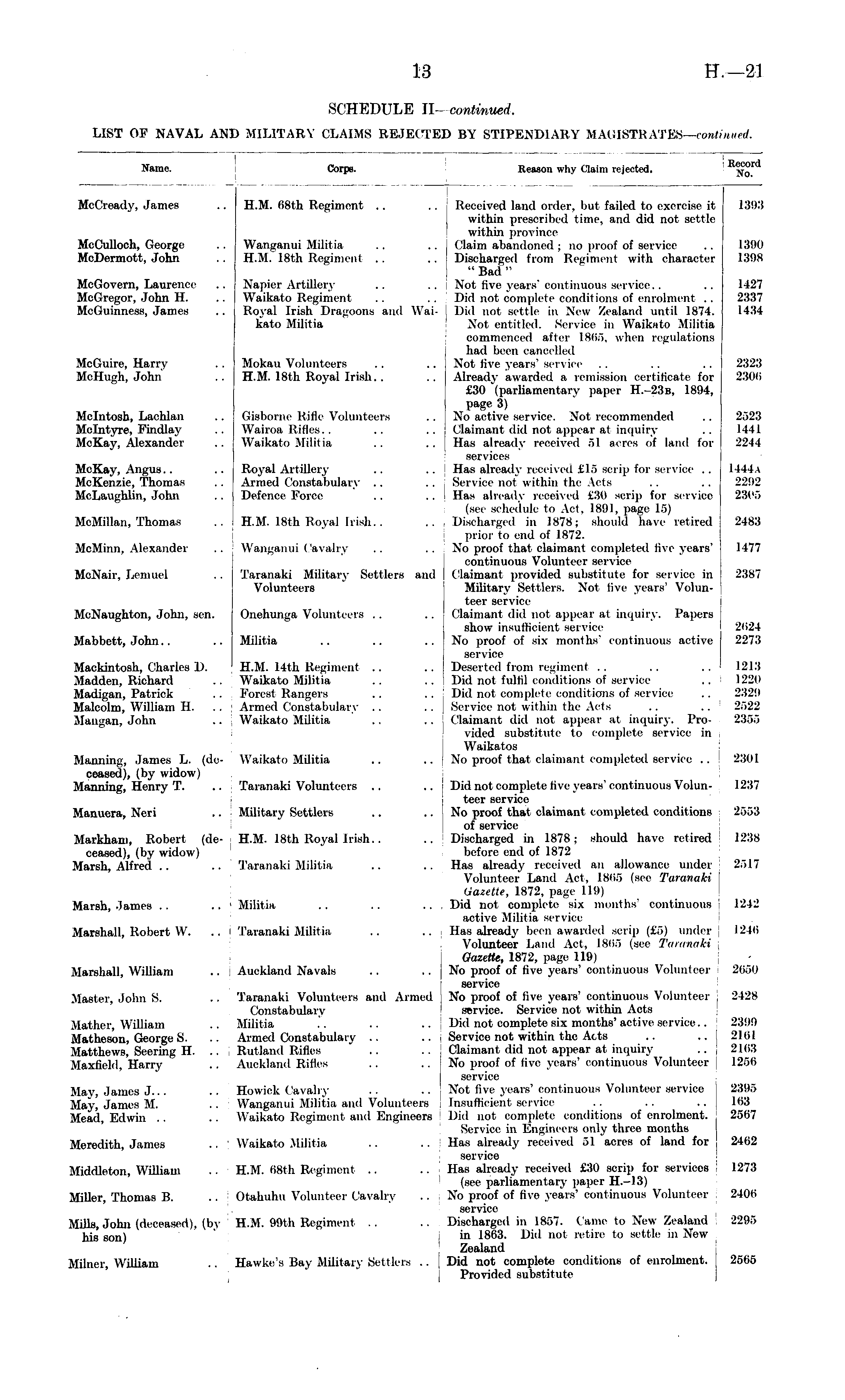 Name. Corps. Reason why Claim rejected. No :ecorc No. McCready, James .. H.M. 08th Regiment .. .. Received land order, but failed to exercise it 1393 within prescribed time, and did not settle within province McCulloch, George .. Wanganui Militia .. .. Claim abandoned; no proof of service .. 1390 McDermott, John .. H.M. 18th Regimen! .. .. Discharged from Regiment with character 1398 " Bad " McGovern, Laurence .. Napier Artillery .. .. Not five years'continuous servioe.. .. 1427 McGregor, John H. .. WaiUato Regiment .. .. Did not complete conditions of enrolment .. 2337 McGuinness, James .. Royal Irish Dragoons and Wai- Did not settle in New Zealand until 187-1. 1434 kato Militia Not entitled. Servioe in Waikato Militia commenced after 18(if>, when regulations had been Cancelled McGuire, Harry .. Mokau Volunteers .. .. Not five years'service .. .. .. 2:i2.'i McHugh, John .. H.M. 18th Royal Irish. . .. Already awarded a remission certificate for 2306 £30 '(parliamentary paper H.-23B, 1894, page 3) Molntosh, Lachlan .. Gieborne Rifle Volunteers .. No active service. -Not recommended .. 2.">2.'> Mclntyre, Findlay .. Wairoa Rifles .. .. .. Claimant did nut appear at inquiry .. 1441 McKay, Alexander .. Waikato Militia .. .. Has already received 51 acres of land tor 2244 services McKay, Angus.. .. Royal Artillery .. .. Has already received £15 sorip for service .. 1444a MeKenzie, Thomas .. Armed Constabulary .. .. Service nol within the Acts .. .. 22i)2 McLaughlin, John .. Defence Force .. .. Has already received £30 si-iip for service 2305 (see schedule to Act. 1891, page 15) McMillan, Thomas .. H.M. 18th Royal Irish. . .. Discharged in 1878; should haw retired 2483 prior to end of 1872. McMinn, Alexander .. Wangaim i ( a \ a 11 \ .. .. Xo proof that claimant completed five years' 1477 continuous Volunteer (service MeNair, Lemuel .. Taranaki Military Settlers and Claimant provided substitute for service in 2387 Volunteers .Military Settlers. Not live years' Volunteer service MoNaughton, John, sen. Onehunga Volunteers .. .. Claimant did not appear at inquiry. Papers show insufficient service 2(124 Mabbett, John.. .. Militia .. .. .. No proof of six months' continuous active 2273 service Mackintosh, Charles D. H.M. 14th Regiment .. .. Deserted from regiment .. .. .. 1213 Madden, Richard .. Waikato Militia .. .. ■ Did not fulfil conditions of service .. i 1220 Madigan, Patrick .. Forest Hangers .. .. Did not oomplete conditions of servioe .. 232!) Malcolm, William H. .. Armed Constabulary .. .. Service not within the Ads .. .. 2522 Mangan, John .. Waikato Militia .. .. Claimant did not appear at inquiry. Pro- 2355 vided substitute to complete service in Waikatos Manning, James L. (de- Waikato Militia .. .. No proof that claimant completed service .. 2301 ceased), (by widow) Manning, Henry T. .. Taranaki Volunteers .. .. Did not oomplete five years'continuous Volun- 1237 teer service Manuera, Neri .. Military Settlers .. .. No proof that claimant completed conditions 2.v>:) of service Markham, Robert (de- H.M. 18th Royal Irish.. .. Discharged in 1878; should have retired! 1238 ceased), (by widow) before end of 1872 Marsh, Alfred .. .. Taranaki Militia .. .. Has already received an allowance under -."• 17 Volunteer Land Act. Lsim (see Turanaki Gazette, 1872, page 119) Marsh, James .. .. ' Militia .. .. .. Did not complete six months" continuous 1242 active Militia servioe Marshall, Robert W. .. i Taranaki Militia .. .. Has already been awarded scrip (£6) under 1246 Volunteer Land Act, 18(>r> (see Taranaki Gazette, 1872, page 119) Marshall, William .. Auckland Navals .. .. No proof of five years'continuous Volunteer 2(i.">0 servioe Master, John S. .. Taranaki Volunteers and Aimed No proof of five years' continuous Volunteer 2428 Constabulary service. Service not within Acts Mather, William .. Militia .. .. .. Did not oomplete six months' active service .. 2399 Matheson, George S. .. Armed Constabulary .. .. Service not within the Acts .. .. 21 til Matthews, Seering H. .. Rutland Rifles .. .. Claimant did not appear at inquiry .. \ 2163 Maxfield, Harry .. Auckland Rifles .. .. No proof of five years'continuous Volunteer 1256 service May, James J. .. .. Howick Cavalry .. .. Not five years'continuous Volunteer service 2395 May, James M. .. Wanganui Militia and Volunteers Insufficient service .. .. .. H>"> Mead, Edwin .. .. Waikato Regiment and Engineers Did not complete conditions of enrolment. 2567 Service in Engineers only three months Meredith, James .. ' Waikato .Militia .. .. Has already received .~il acres of land for 2462 service Middleton, William .. H.M. 68th Regiment .. .. Has already received £30 scrip for services 1273 (see parliamentary paper H.-13) Miller, Thomas B. .. Otahuhu Volunteer Cavalry .. No proof of five years'continuous Volunteer 240(i servile Mills, John (deceased), (by H.M. 99th Regiment .. .. Discharged in L857. < a me to New Zealand 2295 his son) in 1863. Did not retire to settle in New Zealand Milner. William .. Hawke's Bay Military Settlers .. Did not complete conditions of enrolment. 2505 Provided substitute