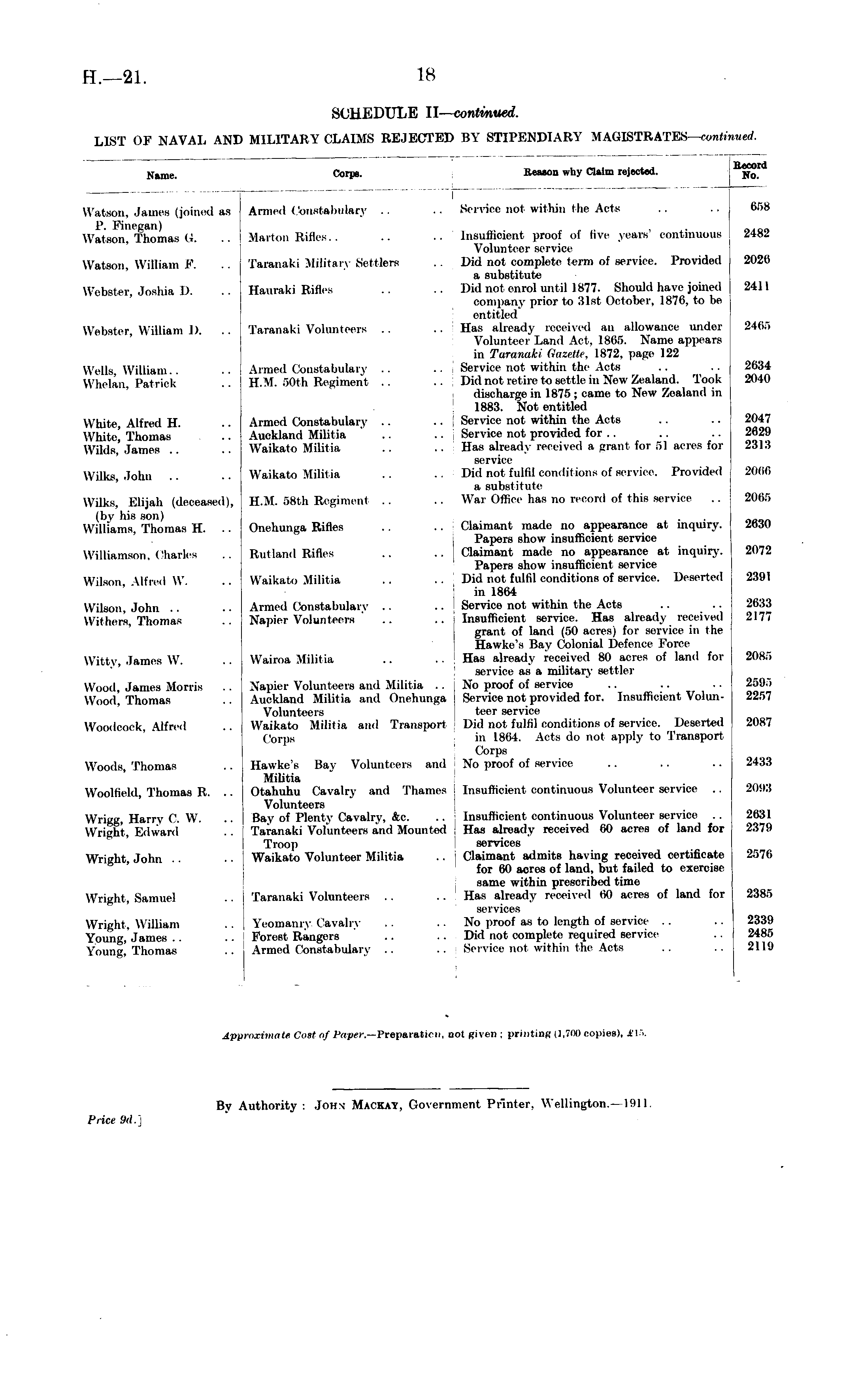 Corp*. Beaton why Claim rejected. Eecord No. Name. Watson, James (joined as P. Finegan) Watson. Thomas (i. Aimed Constabulary .. .. Service not.within the Acts Marton Hides.. .. .. Insufficient proof of five years' oontinuous Volunteer service Taranaki Military Settlers .. Bid not complete term of service. Provided a substitute Hauraki Rifles .. .. Did not enrol until 1877. Should have joined company prior to 31st Oetober, 1876. to be entitled' Taranaki Volunteers .. .. Has already received an allowance under Volunteer Land Act, 1805. Name appears in Taranaki Gazelle, 1872, page 122 Armed Constabulary .. .. Service not within the Acts H.M. 50th Regiment .. .. Did not retire to settle in New Zealand. Took discharge in 1875; came to New Zealand in 1883. Not entitled Aimed Constabulary .. ■■ Service not within the Aits Auckland Militia .. .. Service not provided for .. Wiiikato Militia .. .. Has already received a grani for ">l acres for service Waikato Militia .. .. Did not fulfil conditions of service. Provided a substitute H.M. 58th Regiment .. .. War Office has no record of this service 658 2482 Watson, William F. 2020 Webster, Joshia D. 2411 Webster, William I). 24ti.". Wells, William.. Win-Ian, Patrick 2034 2040 White, Alfred H. White, Thomas Wilds, .lames . . 2047 2629 231:5 Wilks, John .. 2000 Wilks, Elijah (deceased), (by his son) Williams. Thomas H. 2oor> Onehunga Rifles .. .. Claimant made no appearance at inquiry. Papers show insufficient service Rutland Rifles .. .. Claimant made no appearance at inquiry. Papers show insufficient service Waikato Militia .. .. Did not fulfil conditions of service. Deserted in 1864 Armed Constabulary .. .. Service not within the Acts Napier Volunteers .. .. Insufficient service. Has already received grant of land (50 acres) for service in the Hawke's Bay Colonial Defence Force Wairoa Militia .. .. Has already received 80 acres of land for service as a military settler Napier Volunteers and Militia .. No proof of service Auckland Militia and Onehunga Service not provided for. Insufficient VolunVolunteers teer service Waikato Militia and Transport Did not fulfil conditions of service. Deserted (jorpg in 1864. Acts do not apply to Transport Corps Hawke's Bay Volunteers and No proof of service Militia Otahuhu Cavalry and Thames Insufficient continuous Volunteer service .. Volunteers Bay of Plenty Cavalry, &e. .. Insullieient continuous Volunteer service . . Taranaki Volunteers and Mounted Has already received 60 acres of land for Troop services Waikato Volunteer Militia .. Claimant admits having received certificate for 60 acres of land, but failed to exercise same within prescribed time Taranaki Volunteers .. .. j Has already received (>0 acres of land for services Yeomanry Cavalry .. No proof as to length of service Forest Rangers .. .. Did not complete required service Armed Constabulary .. .. Bervioe not within the Acts 2630 Williamson, Charles 2072 Wilson, Alfred W. 2391 Wilson. .lohn Withers. Thomas 2033 2177 Witty. .lames W. 2085 Wood, James Morris Wood, Thomas 2895 2257 Woodoock, Alfred 2087 Woods, Thomas 2433 Woolfield. Thomas R, . . 2093 Wrigg, Harry C. W. Wright. Edward 2031 2379 Wright, John 2576 Wright, Samuel 2385 Wright. William Young, James Young, Thomas 2330 2485 2119