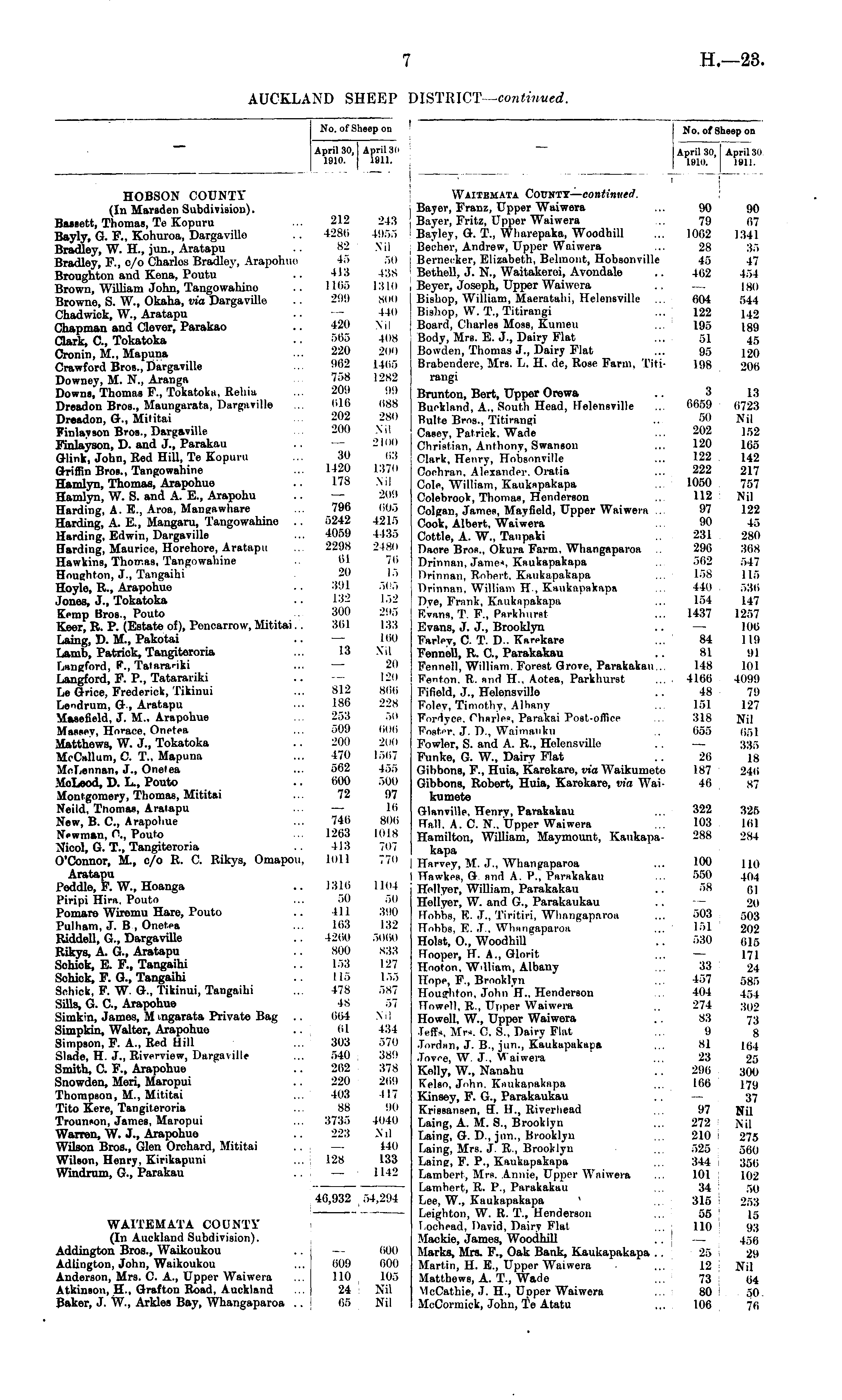 No. of Sheep on April 30, April 30 1910. 1911. HOBSON COUNTY (In Marsden Subdivision). Baseett, Thomas, Te Kopuru ... 212 243 Bayly, G. F., Kohuroa, Dargavillo .. 4286 1055 Bradley, W. H., jun., Aratapu .. 82 Nil Bradley, F., c/o Charlos Bradley, Arapohuo 16 50 Broughton and Kena, Poutu .. ■* 13 Brown, William John, Tangowahino .. 1165 1310 Browne, S. W., Okaha, via Dargaville .. 299 si K i Chadwick, W., Aratapu .. — 140 Chapman and Clever, Parakao .. 420 Nil Clark, C., Tokatoka .. 565 408 Cronin, M., Mapuna ... 220 200 Crawford Bros., Dargaville ... 962 1466 Downey, M. N., Aranga 758 12S2 Downs, Thomas F., Tokatoka, Rehia ... 209 99 Dreadon Bros., Maungarata, Dargaville ... 616 688 Dreadon, G., Mititai ... 202 280 Finlayson Bros., Dargaville 200 Nil Finlayson, D. and J., Parakau .. — 2loo Glink, John, Red Hill, Te Kopuru ... 30 63 Griffin Bros., Tangowahine ... 1420 1370 Hamlyn, Thomas, Arapohue 178 Ml Hamlyn, W. S. and A. E., Arapohu 209 Harding, A. E., Aroa, Mangawhare ... 796 Harding, A. E., Mangaru, Tangowahino 5242 4215 Harding, Edwin, Dargaville ... 405!) 1435 Harding, Maurice, Horehore, Aratapu ... 229S 2480 Hawkins, Thomas, Tangowahine 61 76 Houghton, J., Tangaihi 20 15 Hoyle, R., Arapohuo .. 301 605 Jones, J., Tokatoka .. 132 152 Kemp Bros., Pouto 300 295 Keer, R. P. (Estate of), Poncarrow, Mititai.. 361 I :i:t Laing, D. M., Pakotai .. 160 Lamb, Patrick, Tangiteroria ... 13 Nil Langford, F., Tatarariki ... — 20 Langford, F. P., Tatarariki .. 120 Le Grice, Frederick, Tikinui ... 812 866 Lendrum, G, Aratapu ... 186 228 Masefield, J. M.. Arapohue ... 253 50 Massey, Horace, Onetea ... 509 606 Matthews, W. J., Tokatoka .. 200 200 McCallum, C. T., Mapuna ... 470 1667 McLennan, J., Onetea ... 502 155 McLeod, D. L., Pouto .. 600 500 Montgomery, Thomas, Mititai ... 72 07 Neild, Thomas, Aratapu ... 1(1 New, B. C, Arapohue ... 746 806 Newman, C., Pouto ... 1263 1018 Nicol, G. T., Tangiteroria 113 707 O'Connor, M, c/o R. C. Rikys, Omapou, loll 770 Aratapu Peddle, F. W., Hoanga .. 1316 I I (> I Piripi Hira. Pouto ... 50 50 Pomare Wiremu Hare, Pouto .. 411 390 Pulham, J. B , Onetea ... 163 132 Riddell, G., Dargaville .. 4260 6060 Rikys, A. G., Aratapu .. 800 833 Schick, E. F., Tangaihi .. 153 127 Schick, F. G., Tangaihi .. 115 155 Schick, F. W. G., Tikinui, Tangaihi ... 478 5X7 Sills, G. C, Arapohue 48 57 Simkin, James, Mmgarata Private Bag 664 Nil Simpkin, Walter, Arapohue 61 134 Simpson, F. A., Red Hill ... 303 570 Slade, H. J., Riverview, Dargaville ... 540 380 Smith, C. F., Arapohue .. 262 37S Snowden, Meri, Maropui .. 220 260 Thompson, M., Mititai ... 403 '17 Tito Kere, Tangiteroria ... 88 oo Trounson, James, Maropui ... 3735 4040 Warren, W. J., Arapohue 223 Nil Wilson Bros., Glen Orchard, Mititai . . 140 Wilson, Henry, Kirikapuni ... 128 133 Windrum, G., Parakau .. j —I 1142 46,932 54,294 I ' WAITEMATA COUNTY (In Auckland Subdivision). Addington Bros., Waikoukou .. — 600 Adlington, John, Waikoukou ... 609 600 Anderson, Mrs. C. A., Upper Waiwera ... 110 105 Atkinson, H., Grafton Road, Auckland ... 24 Nil Baker, J. W., Arkles Bay, Whangaparoa .. 65 Nil