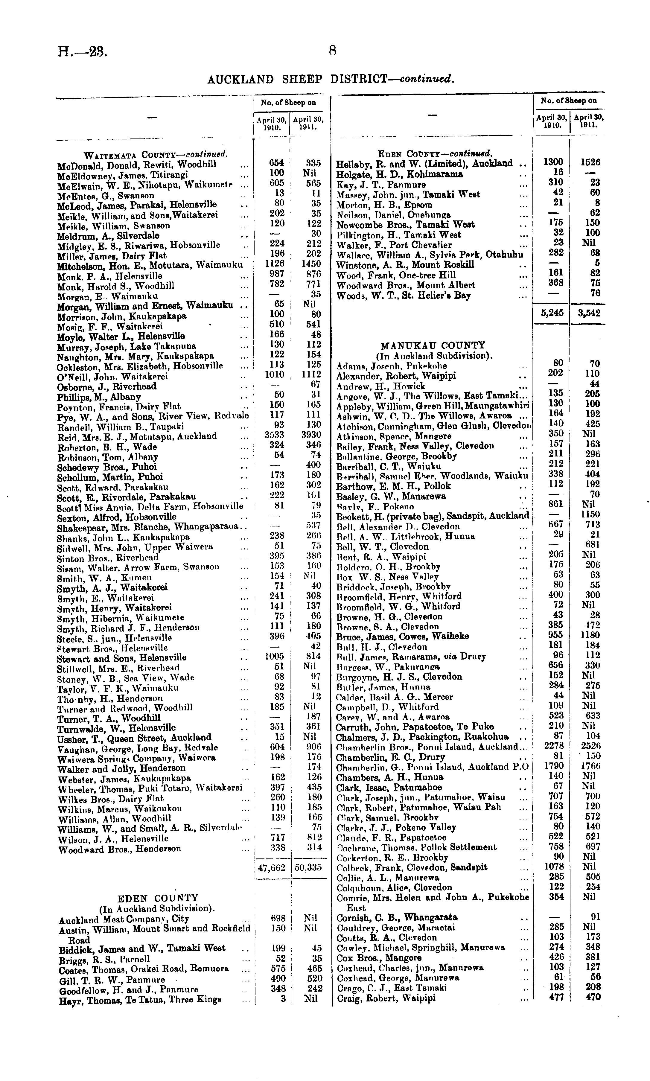 No. of Sheep on — April 30,1 April 30, 1910. 1911. Waitbmata County— continued. McDonald, Donald, Rewiti, Woodhill ... 654 335 McEldowney, James. Titirangi ... 100 Nil McElwain, W. E., Nihotapu, Waikumete ... 005 565 MeEntee, G., Swanson McLeod, James, Parakai, Helensville .. 35 Meikle, William, and Sons.Waitakerei ... 202 Meikle, William, Swanson ... 120 122 Meldrum, A., Silverdale • • — 30 Midgley, E. S., Riwariwa, Hobsonville ... 224 212 Miller/James, Dairy Flat ... 196 202 Mitchelson, Hon. E., Motutara, Waimauku 1126 1450 Monk. P. A., Helensville ... 9°7 876 Monk, Harold S., Woodhill ... 782 771 Morgan, E. Waimauku ... 35 Morgan, William and Ernest, Waimauku .. 65 Nil Morrison, John, Knukapakapa ... 100 80 Mosig, F. F., Waitakerei • ■■■ 510 541 Moyle, Walter L., Helensville .. 166 48 Murray, Joseph, Lake Takapuna •■• 112 Naughton, Mrs. Mary, Kaukapakapa ... 154 Ockleston, Mrs. Elizabeth, Hobsonville ... 113 125 O'Neill, John. Waitakerei 1010, 1112 Osborne, J., Riverhead • ■ Phillips, M., Albany 50 31 Povnton, Francis, Dairy Flat 150 165 Pye, W. A., and Sons, River View, Red vale 117 111 Randell, William B., Taupaki 93 130 Reid Mrs. E. J., Motutapu, Auckland ... 3533 3030 Roherton, B. H., Wade ... 324 340 Robinson, Tom, Albany 54 74 Schedewy Bros., Puhoi • • — 400 Scholium, Martin, Puhoi •• 173 180 Scott, Edward, Parakakau ... 162 302 Scott, E., Riverdale, Parakakau .. 222 101 Scottl Miss Annie. Delta Farm, Hobsonville | 81 79 Sexton, Alfred, Hobsonville .. 35 Shakespear, Mrs. Blanche, Whangaparaoa.. 537 Shanks, John L., Kaukapakapa ... 238 266 Sidwell, Mrs. John, Upper Waiwera ... 51 75 Sinton Bros., Riverhead 395 386 Sisam, Walter, Arrow Farm, Swanson ... 153 160 Smith, W. A., Kumeii ... 154 Nil Smyth, A. J., Waitakerei 71 40 Smyth, E., Wnilnkerei ... 241 308 Smvth, Henry, Waitakerei ... 141 137 Smyth, Hibernia, Waikumete ... 75 66 Smyth, Richard J. F., Henderson ... HI 180 Steele. S.. jun., Helensville 396 405 Stewart. Bros., Helensville ... — : 42 Stewart and Sons, Helensville .. 1005 814 Stillwell, Mrs. E., Riverhead ... 51 Nil Stoney, W. B, Sea View, Wade ... 68 97 Taylor, V. F. K., Waimauku ... 92 81 Thonby, H., Henderson ... 83 12 Turner and Kedwood, Woodhill ... 185 Nil Turner, T. A., Woodhill — 187 Turnwalde, W., Helensville . . 351 301 Ussher, T., Queen Street, Auckland .. 15 Nil Vaughan, George, Long Bay, Redvale 604 006 Waiwera Springs Company, Waiwera 198 176 Walker and Jolly, Henderson — 174 Webster, James, Knukapakapa 162 126 Wheeler, Thomas, Puki Totaro, Waitakerei 397 435 Wilkes Bros, Dairy Flat ... 260 180 WilkinB, Marcus, Waikoukou ... 110 185 Williams, Allan, Woodhill 139 | 165 Williams, W., and Small, A. R., Silverdale 75 Wilson, J. A., Helensville ... 717 812 Woodward Bros., Henderson 338 314 47,662 50,335 EDEN COUNTY (In Auckland Subdivision). Auckland Meat Company, City 698 j Nil Austin, William, Mount Smart and Rockfield j 150 [ Nil Road Biddick, James and W., Tamaki West .. 199 : 45 Briggs, R. S., Parnell 52! 35 Coates, Thomas, Orakei Road, Remuera ... 575 465 Gill, T. R. W., Panmure ... 490 520 Goodfellow, H. and J., Panmure 348 242 Hayr, Thomas, Te Tatua, Three Kings ,., 3 Nil