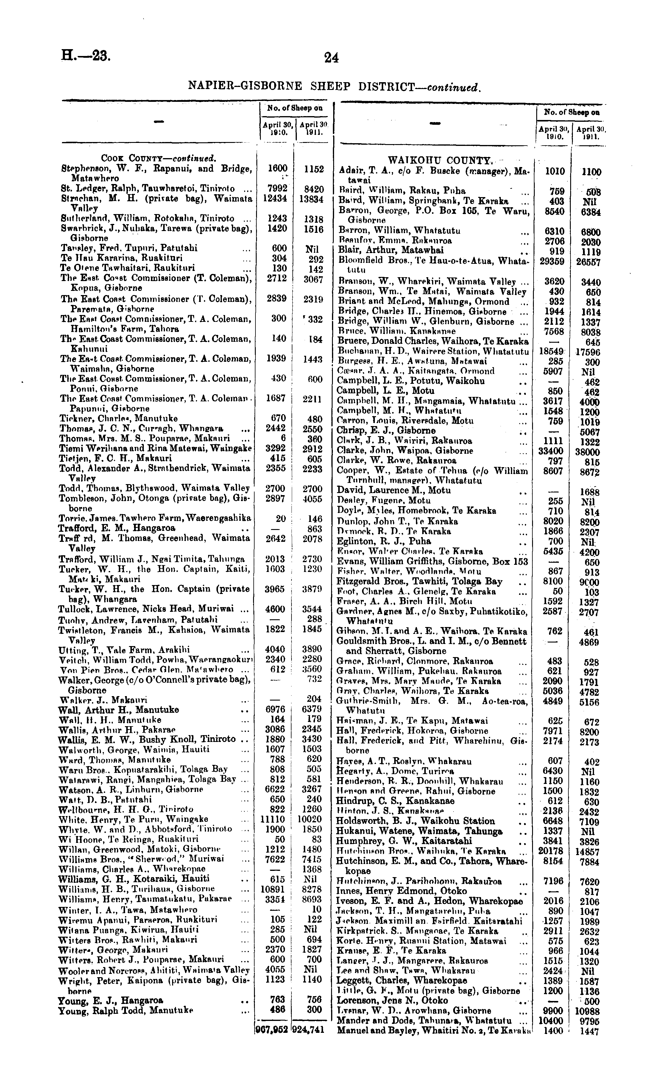 No. of Sheep on April 30, 1910. April 30 1911. WAIKOHU COUNTY. Adair, T. A., c/o F. Buscke (manager), Matawai Baird, William, Rakau, Puha " ... Ba'rd, William, Springhank, Te Knraka Ban-on, George, P.O. Box 165, Te Waru, Gisborne Barron, William, Whatatutu Beaufov, Emma. Rakauroa Blair, Arthur, Matawhai Blonmfield Bros., Te Hau-o-te-Atua, Whatatutu 1010 759 403 8540 1100 508 Nil 6384 6310 2706 919 29359 6800 2030 1119 26557 Branson, W., Wharekiri, Waimata Valley ... Branson, Wm., Te Mntni, Waimata Valley Briant and McLeod, Mahnnga, Ormond ... Bridge, Charles II., Hinemoa, Gisborne Bridge, William W., Glenburn, Gisborne ... Bruce, William. Kanakanne Bruere, Donald Charles, Waihora, Te Karaka Buchanan, H. D., Wairere Station, Whatatutu Burgess, H. E., Awatuna, Matawai Ctesnr. J. A. A., Kaifangata. Ormond Campbell, L. E., Potutu, Waikohu Campbell, L. E., Motu Campbell, M. II., Mangamaia, Whatatutu ... Campbell, M. H., Whatatutu Cnrron, Louis, Riversdale, Motu Chrisp, E. J., Gisborne .. Clark, J. B., Wairiri, Rakauroa Clarke, John, Waipoa, Gisborne Clarke, W. Rowe, Rakauroa Cooper, W., Estate of Tehua (c/o William Tiirnbiill, manager). Whatatutu David, Laurence M., Motu Dealey, Fugene, Motu Doyle, MGes, Homebrook, Te Karaka Dunlop, John T., Te Karaka Dvmoek, R. D.. Te Karaka Eglinton, R. J., Puha Fnsor, Wnher Charles. Te Karaka Evans, William Griffiths, Gisborne, Box 153 Fisher, Walter, Woodlands. Motu Fitzgerald Bros., Tawhiti, Tolaga Bay Foot, Charles A., Glenelg, Te Karaka Fraser, A. A., Birch Hill. Motu Gardner, Agnes M., c/o Saxby, Puhatikotiko, Whatatutu Gihson, M.T.and A. E.. Waihora. Te Karaka Gouldsmith Bros., L. and I. M., c/o Bennett and Sherratt, Gisborne Grace, Richard, Clonmore, Rakauroa Graham. William, Pukehau. Rakauroa Graves, Mrs. Mary Maude, Te Karaka Gray, Charles, Waihora, Te Karaka Guthrie-Smith, Mrs. G. M., Ao-tea-roa, Whatutu Hai-man, J. E., Te Kapu, Matawai Hall, Frederick, Hokoroa, Gishorne Hall. Frederick, and Pitt, Wharehinu, Gisborne Hayes, A. T, Roslyn. Whakarau Hegarty, A., Dome, Turiroa Henderson, R. R., Donnhill, Whakarau Mepeon and Greene, Rahui, Gisborne Hindrup, C. S., Kanakanae Hinton. J. S., Kanakanae Holdsworth, B. J., Waikohu Station Hukanui, Watene, Waimata, Tahunga Humphrey, G. W., Kaitaratahi Huteliiiipon Bros.. Wnihnka, 'Te Karaka Hutchinson, E. M., and Co., Tahora, Wharekopae TTiitchin a on, J.. Parihohonu, Rakauroa Innes, Henry Edmond, Otoko Iveson, E. F. and A., Hedon, Wharekopae Jackson, T. H., Mangatarehii, Puha Jiekson Masimill an Fairfield Kaitaratahi Kirkpatrick. S.. Mnngnoae, Te Karaka Korle. Henry, Runniii Station, Matawai Kranse, E. F., Te Karaka Laneer, 3, J., Mangnrere, Rakauroa Lee and Shaw, Tawn, Whakarnu Leggett, Charles, Wharekopae 1 inle, G. F., Motu (private bag), Gisborne Lorenson, Jens N., Otoko Lysnar, W. D., Arowhana, Gisborne Mander and Dods, Tahunaia, Whatatutu ... Manuel and Bayley, Whaitiri No. 2, Te Karaka 3620 430 932 1944 2112 7568 18549 285 5907 3440 650 814 1614 1337 8038 645 17596 300 Nil 462 462 4000 1200 I 1019 I 5067 1322 38000 815 8672 850 3617 ! 1548 759 1111 33400 797 8607 255 710 8020 1866 700 5435 1688 Nil 814 8200 2307 Nil 4200 650 913 9C00 103 1327 2707 867 8100 50 1592 2587 762 461 4869 483 621 2090 5036 4849 528 927 1791 4782 5156 625 7971 2174 672 8200 2173 607 6430 1150 1500 612 2136 6648 1337 3841 20178 8154 402 Nil 1160 1832 630 2432 7109 Nil 3826 14857 7884 7196 2016 890 1257 2911 575 I 966 1515 j 2424 ■ 1389 1200 | 7620 817 2106 1047 1989 2632 623 1044 1320 Nil 1587 1136 500 10988 9796 1447 9900 j 10400 I 1400 I
