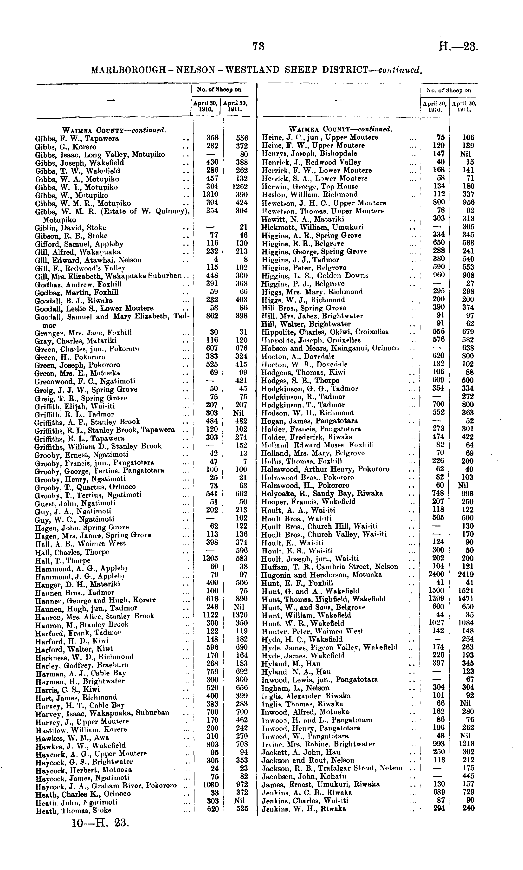 No. of Sheep on April-10, I April * 1910. 1911. April 30, 1911, Waimea County— continued. Heine, J. C., jun., Upper Moutere Heine, F. W., Upper Moutere Henrys, Joseph, Bishopdale Henrick, J., Redwood Valley Herrick, F. W., Lower Moutere Herrick, S. A., Lower Moutere Herwin, George, Top House Heslop, William, Richmond Hewetson, J. H. C, Upper Moutere Hewetson, Thomas, Unper Moutere Hewitt, N. A., Matariki Hickmott, William, Umukuri Higgins, A. E., Spring Grove ITiggins, E. R., Belgrove Higgins, George, Spring Grove Higgins, J. J., Tadmor Higgins, Peter, Belgrove Higgins, L. S., Golden Downs Higgins, P. J., Belgrove Higgs, Mrs. Mary. Richmond Higgs, W. J., Uichmond Hill Bros., Spring Grove Hill. Mrs. Jabez, Brightwater HU1, Walter, Brightwater Hippolite, Charlos, Okiwi, Croixolles Hinpolitc, Ji'seph, Croixelles ... . Hobson and Mears, Kainganui, Orinoco .. • Hocton, A., Dovedale Hocton, W R., Dovedale Hodgens, Thomas, Kiwi Hodges, S. B., Thorpe Hodgkinson, G. G., Tadmor Hodgkinson, R., Tadmor Hodgkinson. T., Tadmor Hodson, W. II.. Richmond Hogan, James, Pangatotara Holder, Francis, Pangatotara Holder, Frederick, Riwaka Holland Edward Moses. Foxhill Holland, Mrs. Mary, Belgrove Hnllis, 'Thomas. Foxhill Holmwood, Arthur Henry, Pokororo Holmwood Bro J .. Pokororo Holmwood, H., Pokororo Holyoake, R., Sandy Bay, Riwaka Hooper, Francis, Wakefield Hoult, A. A., Wai-iti Honlt Bros., Wai-iti Hoult Bros., Church Hill, Wai-iti Hoult Bros., Church VaUoy, Wai-iti Hoult, E., Wai-iti Hoult, E. 8.. Wai-iti Hoult, Joseph, jun., Wai-iti Huffam, T. B., Cambria Street, Nelson Hugonin and Henderson, Motueka Hunt, E. F., FoxhUl Hunt, G. and A.. Wakefield Hunt, Thomas, Highfield, Wakefield Hunt, W., and Sons, Belgrove Hunt, William, Wakefield Hunt, W. R., Wakefield Hunter. Peter, Waimea West Hyde, H. C, Wakefield Hyde. James, Pigeon Valley, Wakefield Hyde, James. Wakefield Hyland, M., Hau Hyland N. A., Hau Inwood, Lewis, jun., Pangatotara Ingham, L., Nelson Inglis, Alexander. Riwaka Ingli", Thomas, Riwaka Inwood, Alfred, Motueka Inwoo-I, H. and L., Pangatotara Inwood, Henry, Pangatotara Inwood, W., Pangatotara Irvine. Mrs. Rohine. Brightwater ... j Jackett, A. John, Hau .. | Jackson and Rout, Nelson Jackson, R. B., Trafalgar Street, Nelson .. Jacobscn, John, Kohatu James, Ernest, Umukuri, Riwaka .lectins, A. C. B.. Riwaka Jenkins, Charles, Wai-iti Jenkins, W. H., Riwaka 75 120 147 40 168 58 134 112 800 78 303 334 650 288 380 590 960 295 200 390 91 91 555 576 620 132 106 609 354 700 552 273 474 82 70 226 62 82 60 748 207 118 505 124 3C0 202 104 2400 41 1500 1309 GOO 44 1027 142 174 226 397 304 101 66 162 86 196 48 993 250 118 130 689 87 294 106 139 Nil 15 141 71 180 337 956 92 318 305 345 588 241 540 553 908 27 298 200 374 97 62 679 582 638 800 102 88 500 334 272 800 363 52 301 422 64 69 200 40 103 Nil 998 250 122 500 130 170 90 50 200 121 2419 41 1521 1471 650 35 1084 148 254 263 193 345 123 67 304 92 Nil 280 76 262 Nil 1218 302 212 175 445 157 729 90 240