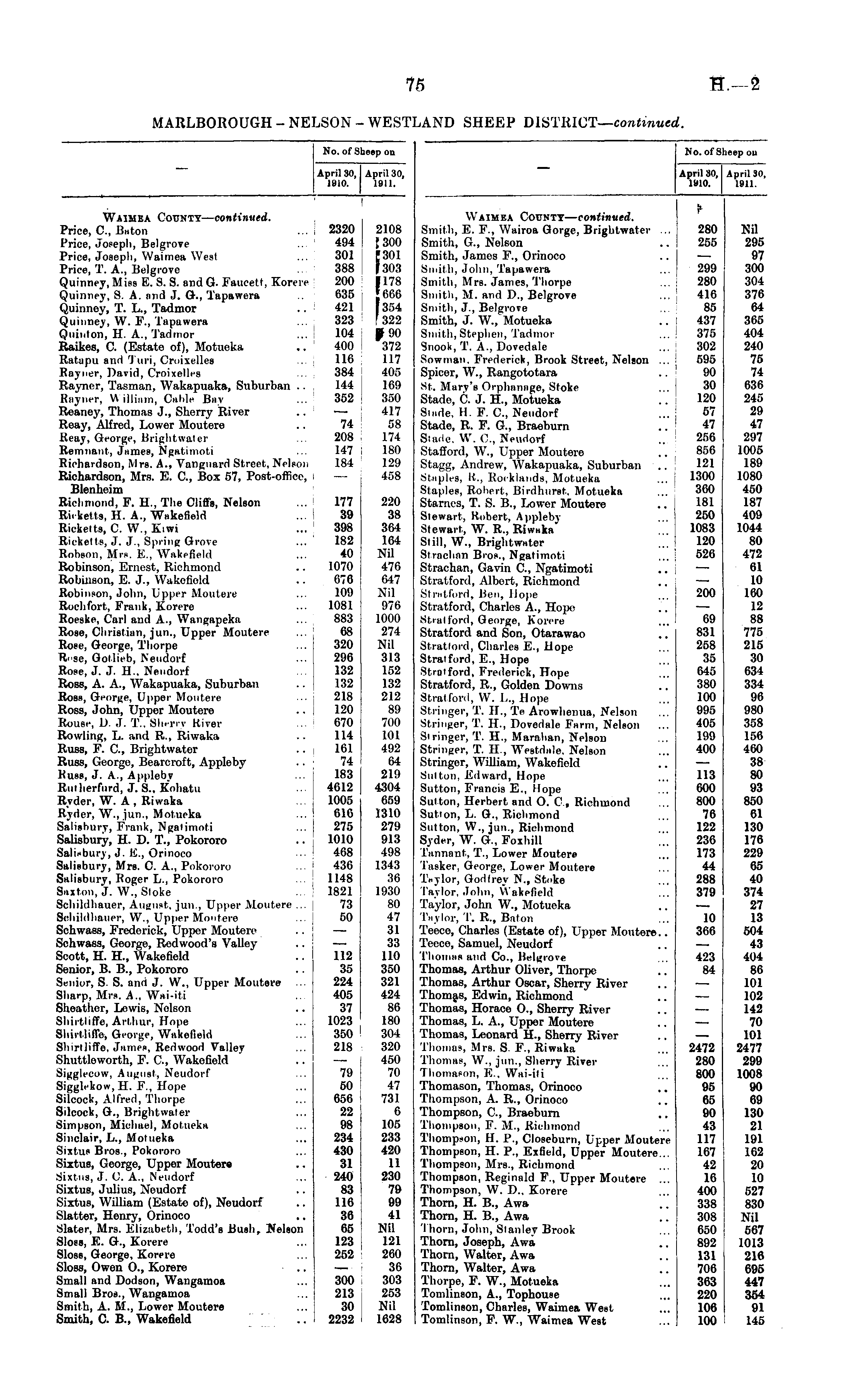No. of Sheep on April 30, April 30, 1910. 1911. Waimea County— continued. Price, G, Baton ... 2320 Price, Joseph, Belgrove ... 494 Price, Joseph, Waimea West ... 301 Price, T. A., Belgrove 388 Quinney, Miss E. 8. S. and G. Faucett, Korere 200 Quinney, 8. A. and J. G., Tapawera 635 Quinney, T. L., Tadmor .. 421 Quinney, W. F., Tapawera 323 Quinton, H. A., Tadmor ... j 104 Raikes, C. (Estate of), Motueka .. 400 Rntnpu and '1 uri, Croixelles ... 116 Rayner, David, Croixelles ... 384 Rayner, Tasman, Wakapuaka, Suburban .. 144 Rayner, William, Cable Bay ... 352 Reaney, Thomas J., Sherry River .. — Reay, Alfred, Lower Moutere .. 74 Reay, George, Brightwater ... 208 Remnant, James, Ngatimoti ... 147 Richardson, Mrs. A., Vanguard Street, Nelson 184 Richardson, Mrs. E. C, Box 57, Post-office, i — Blenheim Richmond, F. H., The Cliffs, Nelson ... 177 Rieketts, H. A., Wakefield ... 39 Rickelts, C. W., Kiwi ... 398 Rieketts, J. J, Spring Grove ... 182 Robson, Mrs. E., Wakefield ... 40 Robinson, Ernest, Richmond .. 1070 Robinson, E. J., Wakofiold .. 676 Robinson, John, Upper Moutere ... 109 Rochfort, Frank, Korere ... 1081 Roeske, Carl and A., Wangapeka . 883 Rose, Christian, jun., Upper Moutere ... ] 68 Rose, George, Thorpe ... I 320 Rese, Gotlieb, Neudorf ... 296 Rose, J. J. H., Neudorf 132 Ross, A. A., Wakapuaka, Suburban ■. 132 Ross, George, Upper Moutere 218 Ross, John, Upper Moutere .. I 120 Rouse, D. J. T\. Sherry River ... 670 Rowling, L. and R., Riwaka .. 114 Russ, F. C, Brightwater .. 161 Russ, George, Bearcroft, Appleby .. 74 Russ, J. A., Applebv ... 183 Rutherfurd, J. S., Kohatu 4612 Ryder, W. A , Riwaka ... 1005 Ryder, W., jun., Motueka ... 616 Salisbury, Frank, Ngatimoti ... 275 Salisbury, H. D. T., Pokororo .. 1010 Salisbury, J. E., Orinoco 468 Salisbury, Mrs. C. A., Pokororo ... j 436 Salisbury, Roger L., Pokororo 1148 Saxton, J. W., Stoke 1821 Schildhauer, August, jun., Upper Moutere ... j 73 Sehildhauev, W., Upper Moutere ... 50 Schwass, Frederick, Upper Moutere .. — Schwass, George, Redwood's Valley .. — Scott, H. H., Wakefield .. 112 Senior, B. B., Pokororo ■ . 35 Senior, S. S. ami J. W., Upper Moutere ... 224 Sharp, Mrs. A., Wai-iti 405 Sheather, Lewis, Nelson .. 37 Shirtliffe, Arthur, Hope ... 1023 Shirtliffe, George, Wakefield ... 350 Shirtliffe, James, Redwood Valley ... 218 Shuttleworth, F. C, Wakefield .. — Sigglecow, August, Neudorf ... 79 Sigglekow, H. F., Hope ... 50 Silcock, Alfred, Thorpe ... 656 Silcock, G., Brightwater ... 22 Simpson, Michael, Motueka ... 98 Sinclair, L., Motueka ... 234 Sixtus Bros., Pokororo ... 430 Sixtus, George, Upper Moutere .. 31 Sixtus, J. C. A., Neudorf ... 240 Sixtus, Julius, Neudorf .. 83 Sixtus, William (Estate of), Neudorf .. 116 Slatter, Henry, Orinoco .. 36 Slater, Mrs. Elizabeth, Todd's Bush, Nelson 65 Sloss, E. G., Korere ... 123 Sloss, George, Korere ... 252 Sloss, Owen O., Korere .. — Small and Dodson, Wangamoa ... 300 Small Bros., Wangamoa ... 213 Smith, A. M., Lower Moutere ... 30 Smith, G B., Wakefield .. 2232 2108 J300 !301 J 303 1178 •666 [354 1322 poo 372 117 405 169 350 417 58 174 180 129 458 220 38 364 164 Nil 476 647 Nil 976 1000 274 NU 313 152 132 212 89 700 101 492 64 219 4304 659 1310 279 913 498 1343 36 1930 80 47 31 33 110 350 321 424 86 180 304 320 450 70 47 731 6 105 233 420 11 230 79 99 41 Nil 121 260 36 303 253 Nil 1628