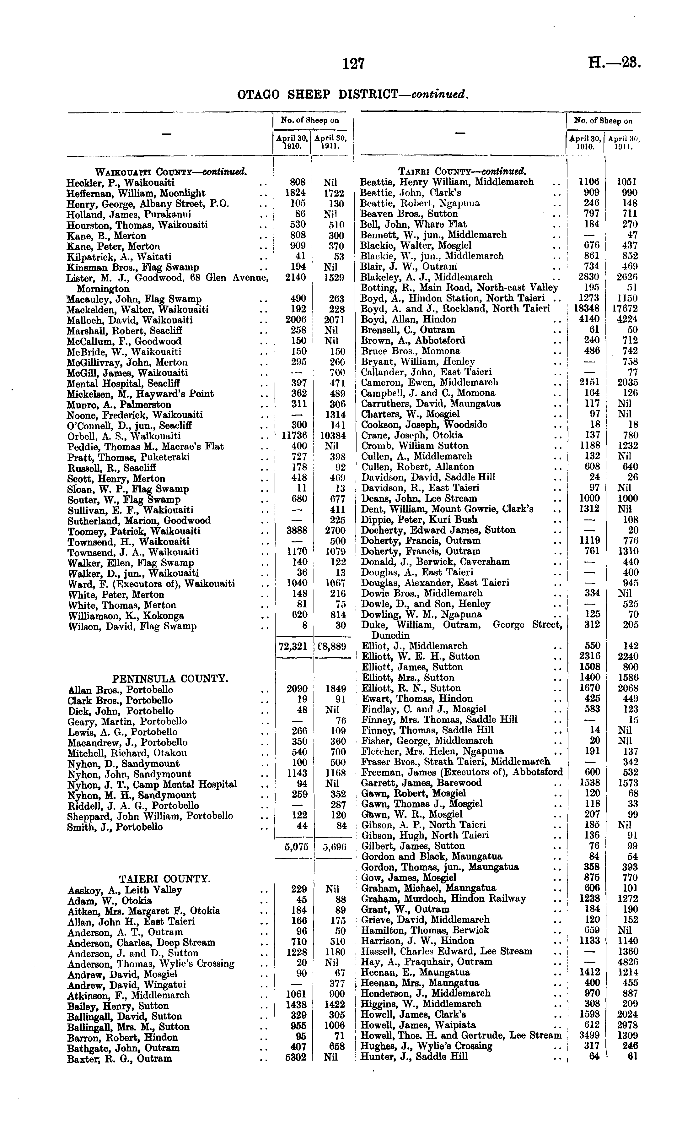 No. of Sheep on April 30, | 1910. April 311, 1911. Taieri County— continued. Beattie, Henry WilUam, Middlemareh Beattie, John, Clark's Beattie, Robert, Ngapuna Beaven Bros., Sutton Bell, John, Whare Flat Bennett, W., jun., Middlemareh Blackie, Walter, Mosgiel Blackic, W., jun., Middlemareh Blair, J. W., Outram Blakcley, A. J., Middlemareh Botting, R., Main Road, North-cast Valley Boyd, A., Hindon Station, North Taieri .. Boyd. A. anil J., Rockland, North Taieri Boyd, Allan, Hindon Brensell, G, Outram Brown, A., Abbotsford Bruce Bros., Momona Bryant, WiUiam, Henley Callander, John, East Taieri Cameron, Ewen, Middlemareh CampbeU, J. and G, Momona Carruthers, David, Maungatua Charters, W., Mosgiel Cookson, Joseph, Woodside Crane, Joseph, Otokia Cromb, WilUam Sutton Cullen, A., Middlemareh Cullen, Robert, AUanton Davidson, David, Saddle Hill Davidson, R., East Taieri Deans, John. Lee Stream Deut, WilUam, Mount Gowrie, Clark's Dippie, Peter, Kuri Bush Docherty, Edward James, Sutton Doherty, Francis, Outram Doherty, Francis, Outram Donald, J., Berwick, Caversham Douglas, A., East Taieri Douglas, Alexander, East Taieri Dowie Bros., Middlemareh Dowle, D., and Son, Henloy Dowling, W. M., Ngapuna Duke, William, Outram, George Street, Dunedin Elliot, J., Middlemareh EUiott, W. E. H., Sutton Elliott, James, Sutton ElUott, Airs., Sutton EUiott, R. N, Sutton Ewart, Thomas, Hindon Findlay, C. and J., Mosgiol Finney, Mrs. Thomas, Saddle Hill Finney, Thomas, Saddle Hill Fisher, George, Middlemareh Fletcher, Mrs. Helen, Ngapuna Fraser Bros., Strath Taieri, Middlemareh Freeman, James (Executors of), Abbotsford Garrett, James, Barewood Gawn, Robert, Mosgiel Gawn, Thomas J., Mosgiel Gfcwn, W. R., Mosgiel Gibson, A. P., North Taieri Gibson, Hugh, North Taieri GUbert, James, Sutton Gordon and Black, Maungatua Gordon, Thomas, jun., Maungatua Gow, James, Mosgiel Graham, Michael, Maungatua Graham, Murdoch, Hindon Railway Grant, W., Outram Grieve, David, Middlemareh HamUton, Thomas, Berwick Harrison, J. W., Hindon Hassell, Charles Edward, Lee Stream Hay, A., Fraquhair, Outram Heenan, E., Maungatua Heenan, Mrs., Maungatua Henderson, J., Middlemareh Higgins, W., Middlemareh Howell, James, Clark's HoweU, James, Waipiata HoweU, Thos. H. and Gertrude, Lee Stream Hughes, J., WyUe's Crossing Hunter, J., Saddle HUI 1100 909 246 797 184 676 861 734 2830 195 1273 18348 4140 61 240 486 2151 164 117 97 18 137 1188 132 608 24 97 1000 1312 1051 990 148 711 270 47 437 852 469 2626 51 1150 17672 4224 50 712 742 758 77 2035 126 Nil Nil 18 780 1232 Nil 640 26 Xil 1000 Nil 108 20 770 1310 440 400 945 Nil 525 70 205 1119 761 334 125 312 550 2316 1508 1400 1670 425 583 142 2240 800 1580 2068 449 123 15 Nil Nil 137 342 532 1573 68 33 99 Nil 91 99 54 393 770 101 1272 190 152 Nil 1140 1300 4826 1214 455 887 209 2024 2978 1309 246 * 61 14 20 191 600 1538 120 118 207 185 136 76 84 358 875 606 1238 184 120 659 1133 1412 400 970 308 1598 612 3499 317 64