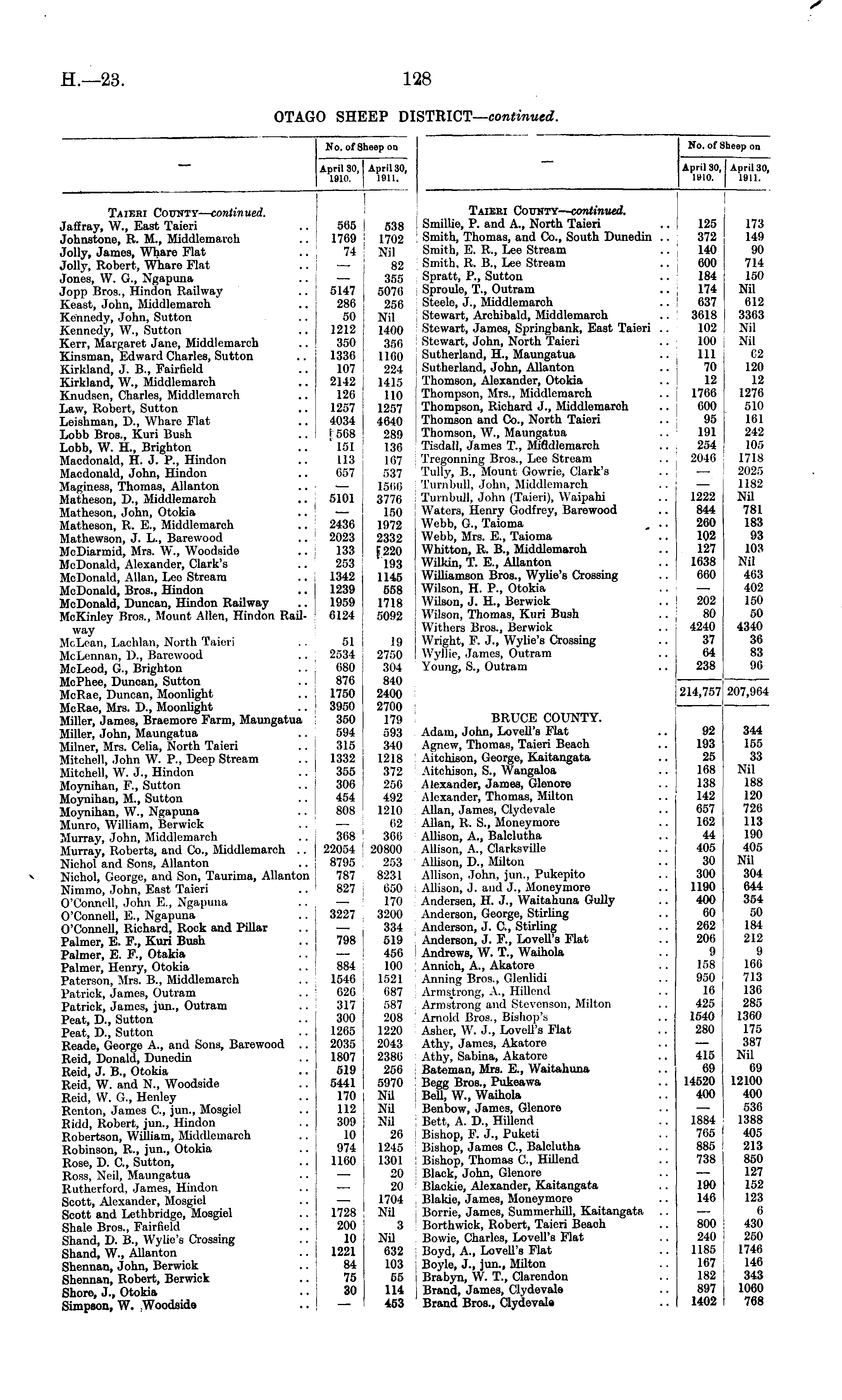 No. of Sheep on April 30, April 30, 1910. 1911. Taieri County— continued. Jaffray, W., East Taieri Johnstone, R. M., Middlemareh Jolly, James, Wharo Flat Jolly, Robert, Whare Flat Jones, W. G., Ngapuna Jopp Bros., Hindon Railway Keast, John, Middlemareh Kennedy, John, Sutton Kennedy, W., Sutton Kerr, Margaret Jane, Middlemareh Kinsman, Edward Charles, Sutton .. j Kirkland, J. B., Fairfield Kirkland, W., Middlemareh Knudsen, Charles, Middlemareh Law, Robert, Sutton Leishman, D., Whare Flat Lobb Bros., Kuri Bush Lobb, W. H., Brighton Macdonald, H. J. P., Hindon Macdonald, John, Hindon Maginess, Thomas, Allanton Matheson, D., Middlemareh Matheson, John, Otokia Matheson, R. E., Middlemareh Mathewson, J. L., Barewood McDiarmid, Mrs. W., Woodside McDonald, Alexander, Clark's McDonald, Allan, Leo Stream McDonald, Bros., Hindon McDonald, Duncan, Hindon Railway McKinley Bros., Mount Allen, Hindon RaUway McLean, Lachlan, North Taieri McLennan, D., Barewood McLeod, G., Brighton McPhee, Duncan, Sutton McRae, Duncan, Moonlight McRae, Mrs. D., Moonlight Miller, James, Braemore Farm, Maungatua Miller, John, Maungatua Milner, Mrs. Celia, North Taieri Mitchell, John W. P., Deep Stream Mitchell, W. J., Hindon Moynihan, F., Sutton Moynihan, M., Sutton Moynihan, W., Ngapuna Munro, William, Berwick Murray, John, Middlemareh Murray, Roberts, and Co., Middlemareh .. ! Nichol and Sons, Allanton Nichol, George, and Son, Taurima, Allanton Nimmo, John, East Taieri O'Conncll, .Inhn E., Ngapuna O'Connell, E., Ngapuna O'Connell, Richard, Rock and PiUar Palmer, E. F., Kuri Bush Palmer, E. F., Otakia Palmer, Henry, Otokia Paterson, Mrs. B., Middlemareh Patrick, James, Outram .. j Patrick, James, jun., Outram Peat, D., Sutton Peat, D., Sutton Reade, George A., and Sons, Barewood .. Reid, Donald, Dunedin Reid, J. B., Otokia Reid, W. and N., Woodside Reid, W. G., Henley Ronton, James C, jun., Mosgiel Ridd, Robert, jun., Hindon Robertson, WUliam, Middlemareh Robinson, R., jun., Otokia Rose, D. G, Sutton, Ross, Neil, Maungatua Rutherford, James, Hindon Scott, Alexander, Mosgiel Scott and Lethbridge, Mosgiel Shale Bros., Fairfield Shand, D. B., Wylie's Crossing Shand, W., Allanton Shennan, John, Berwick Shennan, Robert, Berwick Shore, J., Otokia Simpson, W. Woodside 565 1769 74 5147 286 50 1212 350 ; 1336 107 2142 126 1257 4034 1568 151 113 657 5101 2436 2023 133 253 1342 1239 1959 6124 51 2534 680 876 1750 3950 350 594 315 1332 355 306 454 808 368 i 22054 j 8795 787 827 3227 798 884 1546 620 317 300 1265 2035 1807 519 5441 170 112 309 10 974 1160 1728 200 10 1221 84 75 30 538 1702 Nil 82 355 5076 256 Nil 1400 356 1160 224 1415 110 1257 4640 289 136 167 537 1566 3776 150 1972 2332 [220 193 1145 558 1718 5092 19 2750 304 840 2400 2700 179 593 340 1218 372 256 492 1210 62 366 20800 253 8231 650 170 3200 334 519 456 100 1521 687 587 208 1220 2043 2380 256 5970 NU NU NU 26 1245 1301 20 20 1704 Nil 3 NU 632 103 55 114 453