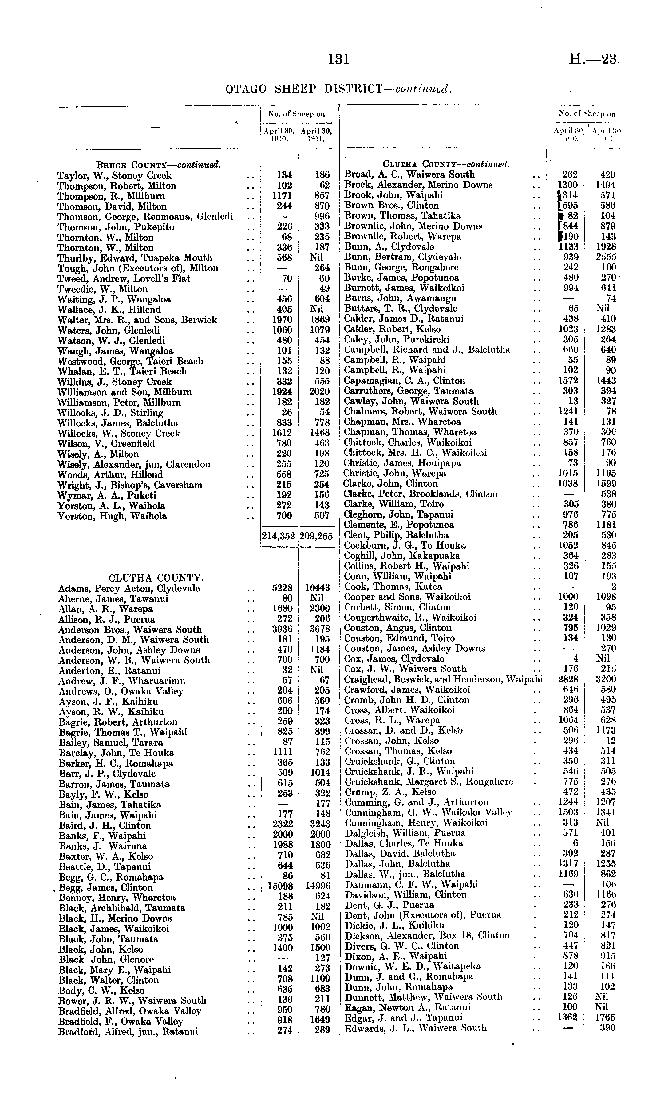 No. of Sheep on A p 11 - 1911. Clutha County— continued. Broad, A. C, Waiwera South .. 262 420 Brock, Alexander, Merino Downs .. 1300 1494 Brook, John, Waipahi .. 1314 571 Brown Bros., Clinton .. |_595 586 Brown, Thomas, Tahatika . . s 82 104 Brownlie, John, Merino Downs .. F844 879 Brownlie, Robert, Warcpa .. |190 143 Bunn, A., Clydevale .. 1133 1928 Bunn, Bertram, Clydevale . . 939 2555 Bunn, George, Rongahero . . 242 100 Burke, James, Popotunoa .. 480 270 Burnett, James, Waikoikoi .. 994 641 Burns, John, Awamangu — 74 Buttars, T. R., Clydevale .. 65 Xil Calder, James D., Ratanui . . 438 : 410 Calder, Robert, Kelso .. 1023 ■ 1283 Caley, John, Purekircki .. 305 264 Campbell, Richard and J„ Balclutha . . 660 040 CampbeU, R., Waipahi .. 55 89 Campbell, R., Waipahi .. 102 90 Capamagian, C. A., Clinton .. 1572 1443 Carruthers, George, Taumata .. 303 394 Cawley, John, Waiwera South . . 13 327 Chalmers, Robert, Waiwera South .. 1241 78 Chapman, Mrs., VVharetoa 141 131 Chapman, Thomas, Wharetoa .. 370 306 Chittock, Charles, Waikoikoi .. 857 760 Chittock, Mrs. H. C, Waikoikoi .. 158 170 Christie, James, Houipapa . . 73 90 Christie, John, Warcpa .. 1015 1195 Clarke, John, Clinton .. 1638 1599 Clarke, Peter, Brooklands, Clinton ■ . — 538 Clarke, WiUiam, Toiro .. 305 380 Cleghorn, John, Tapanui .. 976 775 Clements, E., Popotunoa . . 786 1181 Clent, Philip, Balclutha .. 205 530 Cockburn, J. G., Te Houka . . 1052 845 CoghUl, John, Kakapuaka .. 364 283 Collins, Robert H., Waipahi .. 326 155 Conn, WiUiam, Waipahi .. 107 193 Cook, Thomas, Katea .. —■ 2 Cooper and Sons, Waikoikoi .. 1000 1098 Corbett, Simon, Clinton .. 120 95 Couperthwaitc, R., Waikoikoi .. 324 358 Couston, Angus, Clinton .. 795 1029 Couston, Edmund, Toiro .. 134 130 Couston, James, Ashley Downs .. —■ 270 Cox, James, Clydevaio .. 4 Nil Cox, J. W., Waiwora South . . 176 215 Craighead, Beswick, and Henderson, Waipahi 2828 3200 Crawford, James, Waikoikoi .. 646 580 Cromb, John H. D., Clinton .. 296 495 Cross, Albert, Waikoikoi .. 861 537 Cross, R, L., Warepa .. 1064 628 Crossan, D. and D., Kelsb . . 506 1173 (Irossan, John, Kelso . . 296 12 Crossan, Thomas, Kelso .. 434 514 Cruickshank, G., Clinton .. 350 311 Cruickshank, J. R., Waipahi . . 546 505 Cruickshank, Margaret S., Rongahere .. 775 i 276 Crump, Z. A., K.dso .. 472 j 435 C.iimming, G. and J., Arthurton .. 1244 1207 Cunningham, G. W.. Waikaka Valley .. 1503 1341 Cunningham, Henry, Waikoikoi .. 313 Nil Dalglcish, William, Puerua . . 571 401 Dallas, Charles, Te Houka . . 6 150 Dallas, David, Balclutha .. 392 287 Dallas, John, Balclutha .. 1317 1255 Dallas, W., jun., Balclutha .. 1169 862 Daumann, G F. VV., Waipahi .. — 106 Davidson, William. Clinton .. 636 llliii Dent, G. J., Puerua . . 233 276 Dent, John (Executors of), Puerua . . 212 271 Dickie, J. L., Kaihiku 120 147 Dickson, Alexander, Box 18, Clinton . . 704 817 Divers, G. VV. C, Clinton .. 447 821 Dixon, A. E., Waipahi . . 878 915 Downie, W. E. I)., Waitapeka .. 120 166 Dunn, J. and G., Romahapa .. Ill HI Dunn, John, Romahapa .. 133 102 Dunnett, Matthew, Waiwera South .. 126 Nil Eagan, Newton A., Ratanui .. 100 Nil Edgar, J. and J., Tapanui . 1362 1765 Edwards, J. L., Waiwera South .. — 390