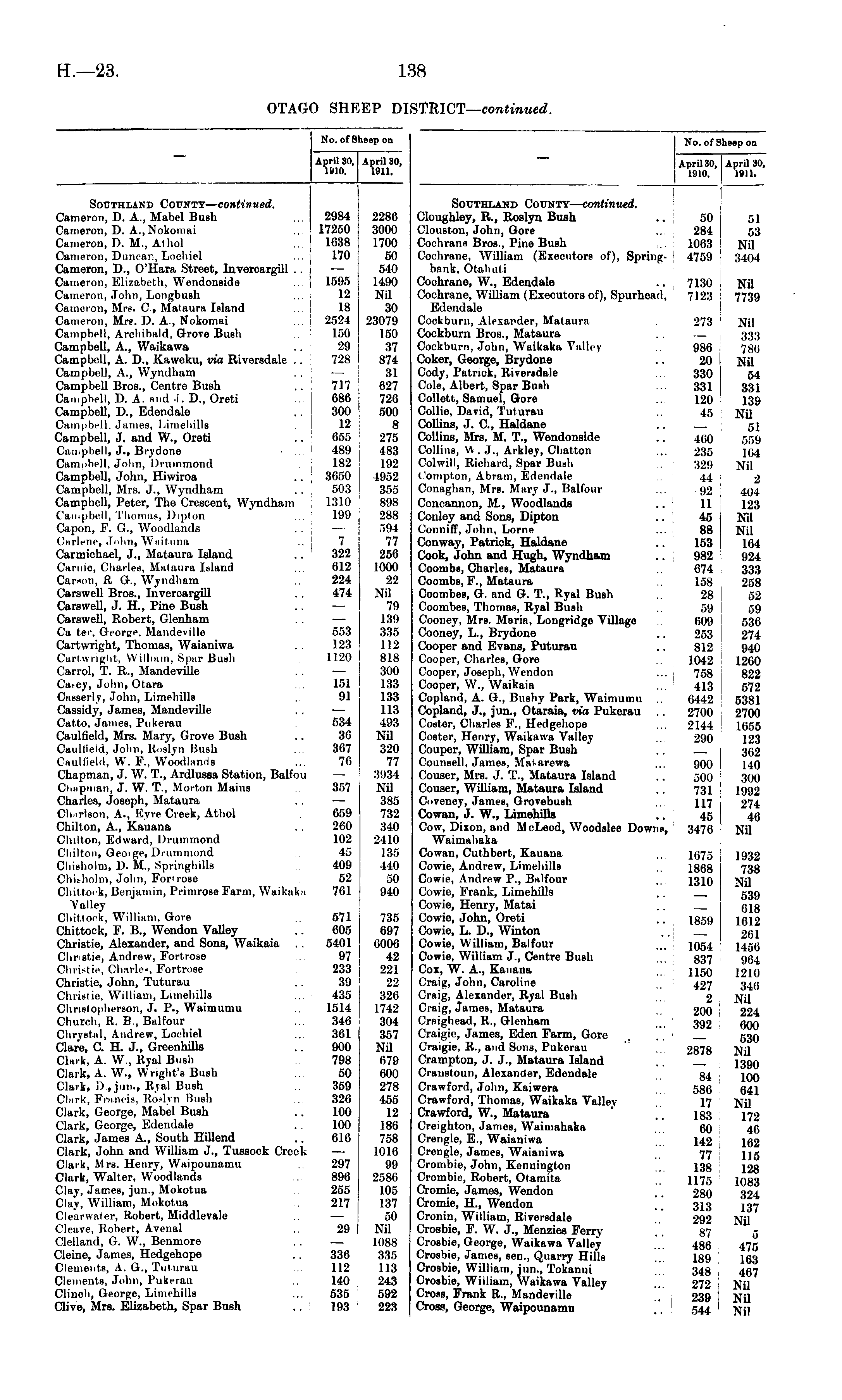 No. of leep oa April 30, 1910. April 30, 1911. Southland County— continued. Cameron, D. A., Mabel Bush ... 2984 Cameron, D. A., Nokomai ... 17250 Cameron, D. M., Athol ... 1638 Cameron, Duncan, Lochiel ... 170 Cameron, D., O'Hara Street, InvercargUl .. — Cameron, Elizabeth, Wendonside ... 1595 Cameron, John, Longbush 12 Cameron, Mrs. C, Mataura Island ... 18 Cameron, Mrs. D. A., Nokomai 2524 Campbell, Archibald, Grove Bush 150 Campbell, A., Waikawa . . 29 Campbell, A. D., Kaweku, via Riversdale .. 728 Campbell, A., Wyndham .. — CampbeU Bros., Centre Bush .. 717 Campbell, D. A. mid .I. D., Oreti ... 686 CampbeU, D., Edendale .. 300 CampbeU. Jiimes, Limehills 12 Campbell, J. and W., Oreti . . 655 Campbell, J., Brydone ... ' 489 Camiitx'll. John, Drummond 182 CampbeU, John, Hiwiroa .. 3650 Campbell, Mrs. J., Wyndham .. 503 Campbell, Peter, The Crescent, Wyndham ; 1310 Campbell, Thomas, Dipton ... | 199 Capon, F. G., Woodlands .. — Ctirlene, John, Waituna 7 Carmichael, J., Mataura Island .. ' 322 Carnie, Charles, Malaura Island 612 Carson, R G., Wyndham 224 Carswell Bros., InvercargUl . . 474 CarsweU, J. H., Pino Bush .. — CarsweU, Robert, Glenham .. — Ca ter, George. Mandeville 553 Cartwright, Thomas, Waianiwa .. 123 Cartwright, William, Spur Bush 1120 Carrol, T. R., MandevUle .. — Catey, John, Otara ... 151 Oasserly, John, Limehills 91 Cassidy, James, MandeviUe .. — Catto, James, Pukerau 534 Caulfield, Mrs. Mary, Grove Bush .. 36 Caullield, John, Roslyn Bush ... 367 Oaulfleld, VV. F., Woodbines ... 76 Chapman, J. W. T., Ardlussa Station, Balfou — Chapman, J. W. T., Morton Mains 357 I Charles, Joseph, Mataura — Clmrlson, A., Eyre Creek, Athol 659 Chilton, A., Kauana .. 260 Chilton, Edward, Drummond 102 Chilton, George, Drummond 45 Chisholm, D. M., Springhills ... 409 Chisholm, John, Fori rose 52 Chittock, Benjamin, Primrose Farm, Waikuku 761 I Valley Chittock, William, Gore 571 Chittock, F. B., Wendon VaUey .. 605 Christie, Alexander, and Sons, Waikaia .. 5401 Christie, Andrew, Fortrose ... 97 Christie, Charles Fortrose 233 Christie, John, Tuturau .. 39 Christie, WiUiam, Limehills ... 435 Chnstopherson, J. P., Waimumu 1514 Church, R. B, Balfour ... 346 Chrystiil, Andrew, Lochiel ... 361 Clare, ft H. J., GreenhUls .. 900 Clark, A. W, Ryal Bush 798 Clark, A. W., Wright's Bush 50 Clark, D,jun., Ryal Bush 359 Olark, Francis, Roslyn Bush 326 Clark, George, Mabel Bush .. 100 Clark, George, Edendale .. 100 Clark, James A., South HiUend .. 616 Clark, John and WiUiam J., Tussock Creek — Clark, Mrs. Henry, Waipounamu 297 Clark, Walter, Woodlands ... 896 Clay, James, jun., Mokotua 255 Clay, William, Mokotua 217 Clearwater, Robert, Middlevale — Cleave, Robert, Avenal ,. 29 Clelland, G. W., Benmore .. _ Cleine, James, Hedgehope .. 336 Clements, A. G., Tuturau ... 112 Clements, John, Pukerau 140 Clinch, George, Limehills ... 635 Clive, Mrs. EUzabeth, Spar Bush . . 193 2286 3000 1700 50 540 1490 Nil 30 23079 150 37 874 31 627 726 500 8 275 483 192 4952 355 898 288 594 77 256 1000 22 Nil 79 139 335 112 818 300 133 133 113 493 NU 320 77 3034 NU 385 732 340 2410 135 440 50 940 735 697 6006 42 221 22 326 1742 304 357 NU 679 600 278 455 12 186 758 1016 99 2586 105 137 50 NU 1088 335 113 243 592 223