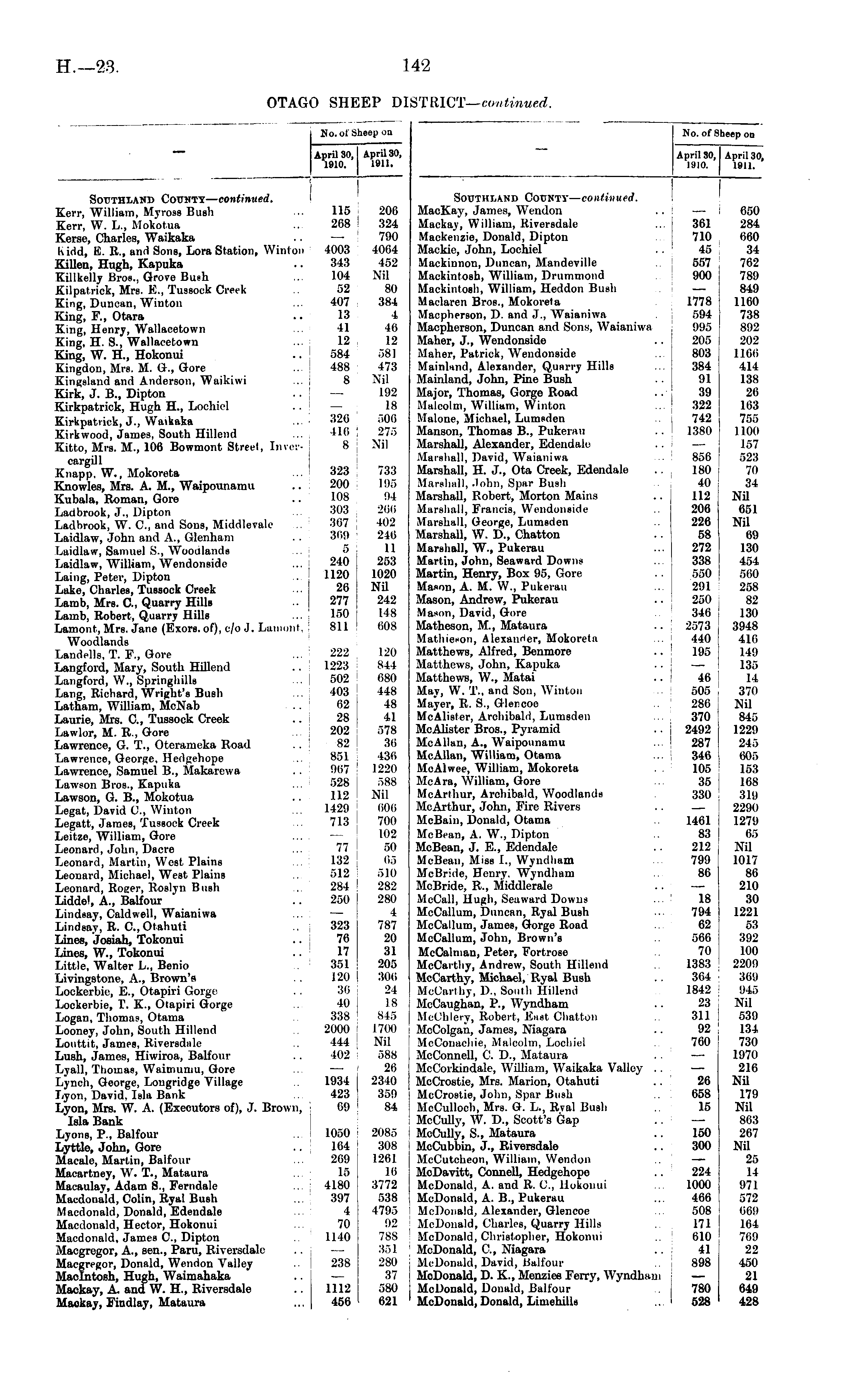 No. of Sheep on April 30, April 30, 1910. 1911. Southland Oottstt—continued. MacKay, James, Wendon . . — Mackay, William, Riversdale ... 361 Mackenzie, Donald, Dipton 710 Mackie, John, Lochiel . . 45 Mackinnon, Duncan, Mandeville .. 557 Mackintosh, William, Drummond 900 Mackintosh, William, Heddon Bush — Maclaren Bros., Mokoreta 1778 Macpherson, D. and J., Waianiwa 594 Macpherson, Duncan and Sons, Waianiwa 995 Maher, J., Wendonside . . 205 Maher, Patrick, Wendonside . 803 Mainland, Alexander, Quarry Hills ... 384 Mainland, John, Pine Bush .. 91 Major, Thomas, Gorge Road .. 39 Malcolm, William, Winton 322 Malone, Michael, Lumsden 742 Manson, Thomas B., Pukerau . 1380 MarshaU, Alexander, Edendale Marshall, David, Waianiwa 856 Marshall, H. J., Ota Creek, Edendale ... 180 Marshall, John, Spar Bush 40 MarshaU, Robert, Morton Mains 112 Marshall, Francis, Wendonside 206 Marshall, George, Lumsden .. 226 Marshall, VV. D., Chatton .. 58 Marshall, W., Pukerau ... 272 Martin, John, Seaward Downs ... 338 Martin, Henry, Box 96, Gore 550 Mason, A. M. W., Pukerau ... 291 Mason, Andrew, Pukerau . . 250 Mason, David, Gore 346 Matheson, M., Mataura .. 2573 Mathieson, Alexander, Mokoreta ... I 440 Matthews, Alfred, Benmore .. 195 Matthews, John, Kapuka .. j — Matthews, W., Matai .. 46 May, W. T., and Sou, Winton 505 Mayer, R. S., Glercoe 286 McAlister, Archibald, Lumsden 370 McAUster Bros., Pyramid . . 2492 McAllan, A., Waipounamu ... 287 McAUan, William, Otama ... 346 McAlwee, William, Mokoreta 105 McAra, William, Gore 35 McArthur, Archibald, Woodlands 330 McArthur, John, Fire Rivers .. — McBain, Donald, Otama 1461 McBean, A. W., Dipton 83 McBean, J. E., Edendale .. 212 McBean, Miss I., Wyndham 799 McBride, Henry, Wyndham . 86 McBride, R., Middlerale . . — McCall, Hugh, Seaward Downs 18 McCallum, Duncan, Ryal Bush . 794 McCallum, James, Gorge Road 62 McCallum, John, Brown's 566 McCalman, Peter, Fortrose 70 McCarthy, Andrew, South HiUend 1383 McCarthy, Michael, Ryal Bush .. 364 McCarthy, D.. South Hilh-mi 1842 MeCaughan, P., Wyndham .. 23 McChlery, Robert, East Chatton 311 McColgan, James, Niagara .. 92 McConachie, Malcolm, Lochiel 760 McConnell, ft D., Mataura . — McCorkindale, WiUiam, Waikaka Valley .. — McCrostie, Mrs. Marion, Otahuti . . 26 McCrostie, John, Spar Bush .. 058 McCulloch, Mrs. G. L., Ryal Bush 15 McCully, W. D., Scott's Gap .. — McCuUy, S., Mataura .. 150 McCubbin, J., Riversdale .. 300 McCutcheon, William, Wendon — McDavitt, ConneU, Hedgehope .. 224 McDonald, A. and R. C, Hokonui 1000 McDonald, A. B., Pukerau ... 466 McDonald, Alexander, Glencoe 508 McDonald, Charles, Quarry Hills 171 McDonald, Christopher, Hokonui 610 McDonald, ft, Niagara .. j 41 McDonald, David, Balfour 898 MoDonald, D. K., Menzies Ferry, Wyndham ; — McDonald, Donald, Balfour ... 780 McDonald, Donald, Limehills .. 528 650 284 660 34 762 789 849 1160 738 892 202 1166 414 138 26 163 755 1100 157 523 70 34 NU 651 Nil 69 130 454 500 258 82 130 3948 416 149 135 14 370 Nil 845 1229 245 605 153 168 319 2290 1279 65 Nil 1017 86 210 30 1221 53 392 100 2209 369 945 Nil 539 134 730 1970 216 NU 179 Nil 863 267 Nil 25 14 971 572 669 164 769 22 450 21 649 428