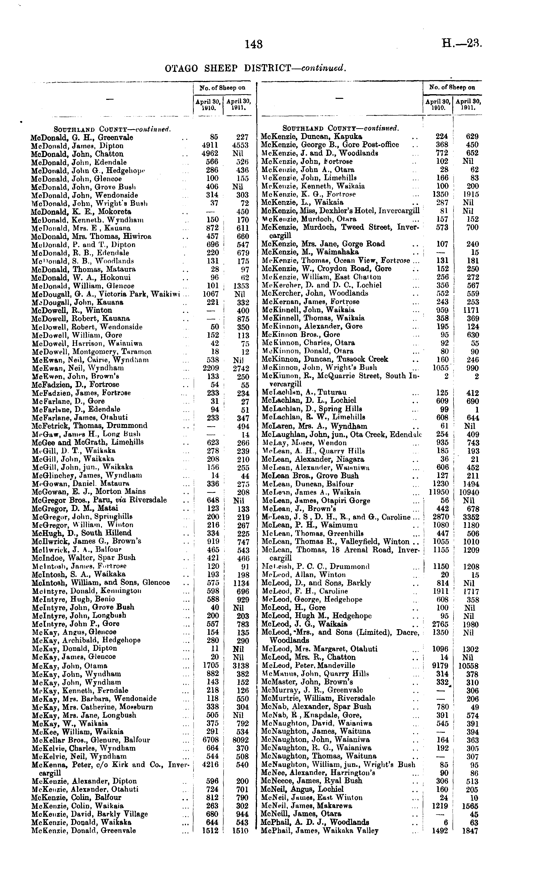 No. of Sheep on — April 30, April 30, 1910. 1911. Southland County— continued. McDonald, G. H., Greenvale .. 85 227 McDonald, James, Dipton 4911 4553 McDonald, John, Chatton .. 4962 Nil McDonald, John, Edendale 566 526 McDonald, John G, Hedgehop.' ... 286 436 McDonald, John, Gleneoe 100 155 McDonald, John, Grove Bush 400 NU McDonald, John, Wendonside 314 303 McDonald, John, Wright's Busli 37 72 MoDonald, K. E., Mokoreta .. — 450 McDonald, Kenneth. Wvndham 150 170 McDonald, Mrs. E , Kauana 872 611 McDonald, Mrs. Thomas, Hivriroa .. 457 660 McDonald, P. and T., Dipton 696 547 McDonald, R. B., Edendale 220 679 McDonald, S. B., Woodlands 131 175 McDonald, Thomas, Mataura .. 28 07 McDonald, VV. A., Hokonui .. 96 62 McDonald, William, Gleneoe ... 101 ( 1353 McDougall, G. A., Victoria Park, Waikiwi 1067 Nil McDougall, John, Kauana 221 332 McDoweU, R., Winton — 400 McDoweU, Robert, Kauana — • 875 McDowell, Robert, Wendonside 50 350 McDowell, William, Gore 152 113 McDowell, Harrison, Waianiwa 42 75 McDowell, Montgomery, Taramoa 18 12 McEwan, Neil, Cairie, Wyncl.'inm ... 538 Nil McEwan, Neil, Wyndham ... 2209 2742 McEwen, John, Brown's 133 250 McFadzien, D., Fortrose 54 55 McFadzien, James, Fortrose . 233 234 McFarlane, D., Gore 31 27 McFarlune, D., Edendale 94 51 McFarlane, James, Otahuti 233 347 McFetrick, Thomas, Drummond — 494 MiGaw, James H., Long bush —• 14 McGee and McGrath, Limehills . . 623 266 McGill, D. T, Waikaka 278 239 McGill, John, Waikaka 208 210 McGill, John, jun., Waikaka 156 255 McGlinchey, James, Wyndham . 14 44 Mi-Gowan, Daniel Mataura ... 336 275 McGowan, E. J., Morton Mains — 208 McGregor Bros., Paru, via Riversdale .. 648 Nil McGregor, D. M., Matai 123 ; 133 McGregor, John, Springhills 200 219 McGregor, William, Winton 216 267 McHugh, D., South HUlend . . 334 225 McUwrick, James G., Brown's . . 919 747 Mollwrick, J. A., Balfour 465 543 Mclndoe, Walter, Spar Bush . . 421 466 MclntoBb, James, Furtrose 120 j 91 Mcintosh, S. A., Waikaka 193 , 198 Mcintosh, WiUiam, and Sons, Gleneoe .. 575 1134 Mclntyre, Donald, Kennington ... 598 696 Mclntyre, Hugh, Benio ... 588 929 Mclntyre, John, Grove Bush 40 Nil Mclntyre, John, Longbush 200 203 Mclntyre, John P., Gore ... 557 783 McKay, Anzus, Gleneoe ... 154 135 McKay, Archibald, Hedgehope ... 280 290 McKay, Donald, Dipton ... 11 Nil McKay, James, Gleneoe ... 20 Nil McKay, John, Olama ... 1705 3138 McKay, John, Wyndham ... 882 382 McKay, John, Wyndham ... 143 I 152 McKay, Kenneth, Ferndale ... 218 j 126 McKay, Mrs. Barbara, Wendonside 118 550 McKay, Mrs. Catherine, Mossburn 338 304 McKay, Mrs. Jane, Longbush ... j 505 | Nil McKay, W., Waikaia 375 792 McKee, William, Waikaia 291 534 McKellar Bros., Glenure, Balfour ... j 6708 j 8092 McKelvie, Charles, Wyndham 664 370 McKelvie, Neil, Wyndham ... 544 508 McKenna, Peter, c/o Kirk and Co., Inver- 4210 540 cargill McKenzie, Alexander, Dipton 590 200 McKenzie, Alexander, Otahuti . ; 724 1 701 McKenzie, Colin, Balfour .. 812 790 McKenzie, Colin, Waikaia ... 263 302 McKenzie, David, Barkly Village ... 680, 944 McKenzie, Donald, Waikaka ... 644 543 McKenzie, Donald, Greenvale ... 1512 ! 1510