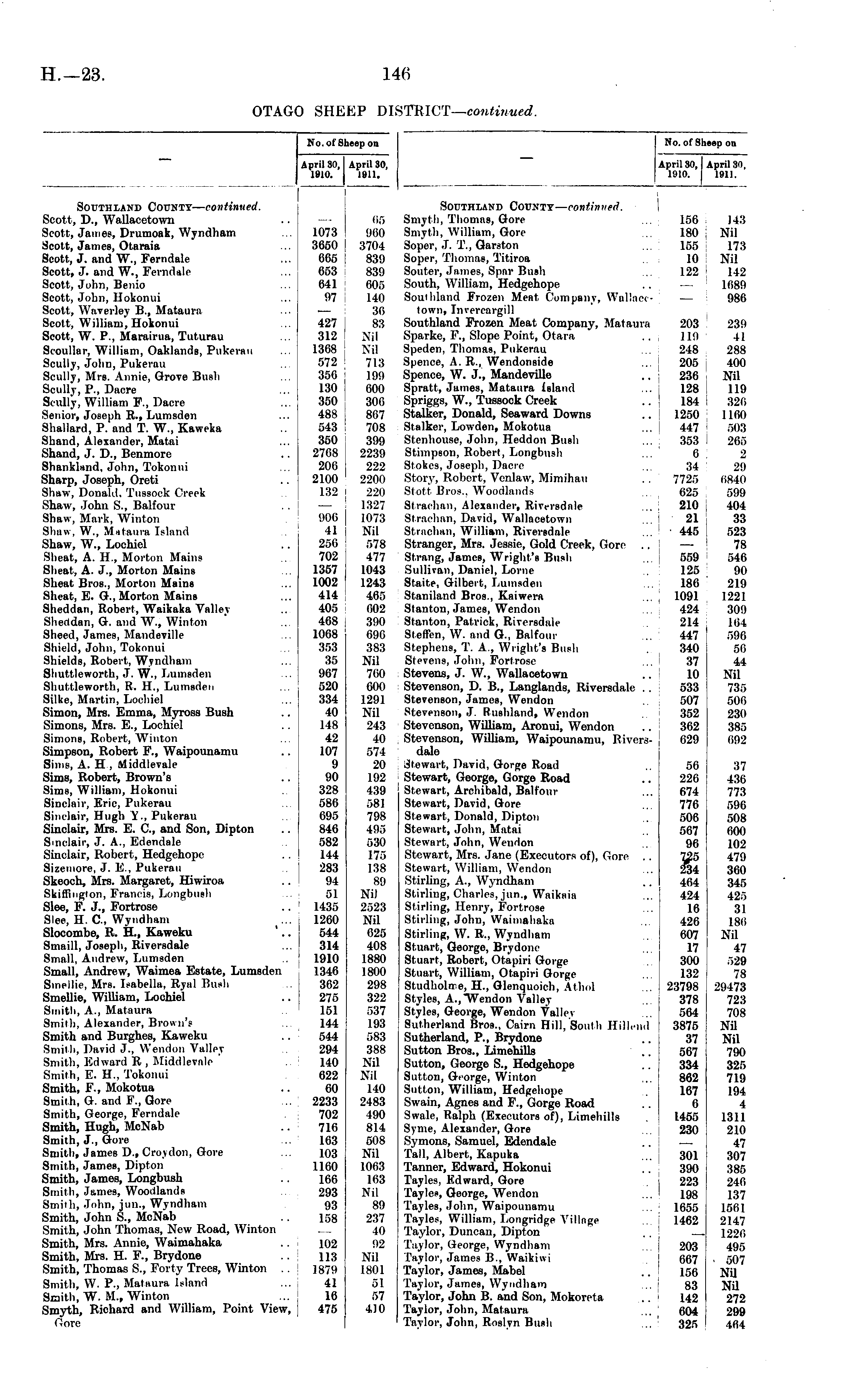 No. of Sheep on April SO, April 30, 1910. 1911. Southland County— continued. Smyth, Thomas, Gore Smyth, William, Gore Soper, J. T., Garston Soper, Thomas, Titiroa Souter, James, Spar Bush South, William, Hedgehope Southland Frozen Meat, Company, Wallacetown, Invercargill Southland Frozen Meat Company, Mataura Sparke, F., Slope Point, Otara Speden, Thomas, Pukerau Spence, A. R., Wendonside Spence, W. J., MandeviUe Spratt, James, Mataura Island Spriggs, W., Tussock Creek Stalker, Donald, Seaward Downs Stalker, Lowden, Mokotua Stenhouse, John, Heddon Bush Stimpson, Robert, Longbush Stokes, Joseph, Dacre Story, Robert, Venlaw, Mimihau Stott Bros., Woodlands Strachan, Alexander, Riversdale Strachan, David, Wallacetown Strachan, William, Riversdale Stranger, Mrs. Jessie, Gold Creek, Gore . . Strang, James, Wright's Bush Sullivan, Daniel, Lome Staite, Gilbert, Lumsden Staniland BroB., Kaiwera Stanton, James, Wendon Stanton, Patrick, Riversdale Steffen, W. and G., Balfour Stephens, T. A., Wright's Bush Stevens, John, Fortrose Stevens, J. W., Wallacetown Stevenson, D. B., Langlands, Riversdale .. Stevenson, James, Wendon Stevenson, J. Rushland, Wendon Stevenson, William, Aronui, Wendon .. i Stevenson, WiUiam, Waipounamu, Riversdale 156 143 180 Nil 155 173 10 Nil 122 142 16S9 986 203 239 119 41 248 288 205 400 236 Nil 128 119 184 320 1250 1160 447 ."ill!! 353 265 6 2 34 29 7725 6840 625 599 210 404 21 33 445 528 — 78 559 546 125 90 186 219 1091 1221 424 309 214 164 447 506 340 56 37 44 10 Nil 533 735 507 506 352 230 362 385 629 692 Stewart, David, Gorge Road Stewart, George, Gorge Road Stewart, Archibald, Balfour Stewart, David, Gore Stewart, Donald, Dipton Stewart, John, Matai Stewart, John, Wendon Stewart, Mrs. Jane (Executors of), Gore .. Stewart, William, Wendon StirUng, A., Wyndham Stirling, Charles, jun., Waikaia Stirling, Henry, Fortrose Stirling, John, Waimahiikii Stirling, VV. R., Wyndham Stuart, George, Brydone Stuart, Robert, Otapiri Gorge Stuart, William, Otapiri Gorge Studholme, H., Glenquoich, Athol Styles, A.,"Wendon Valley Styles, George, Wendon Vallev Sutherland Bros., Cairn Hill, South HiUend Sutherland, P., Brydone Sutton Bros., Limehills Sutton, George S., Hedgehope Sutton, George, Winton Sutton, William, Hedgehope Swain, Agnes and F., Gorge Road Swale, Ralph (Executors of), Limehills Syme, Alexander, Gore Symons, Samuel, Edendale Tall, Albert, Kapuka Tanner, Edward, Hokonui Tayles, Edward, Gore Tayles, George, Wendon Tayles, John, Waipounamu Tayles, William, Longridge Village Taylor, Duncan, Dipton Taylor, George, Wyndham Taylor, James B., Waikiwi Taylor, James, Mabel Taylor, James, Wyndham Taylor, John B. and Son, Mokoreta Taylor, John, Mataura Taylor, John, Roslyn Bush 56 37 226 436 674 773 776 596 506 508 567 600 96 102 7_25 479 234 360 464 345 424 425 16 31 426 186 607 Nil 17 47 300 529 132 78 23798 29473 378 723 564 708 3875 Nil 37 Nil 567 790 334 325 862 719 167 194 6 4 1455 1311 230 210 — 47 301 307 390 385 223 246 198 137 1655 1561 1462 2147 — 1226 203 495 667 • 507 156 NU 83 Nil 142 272 604 j 299 325 I 464