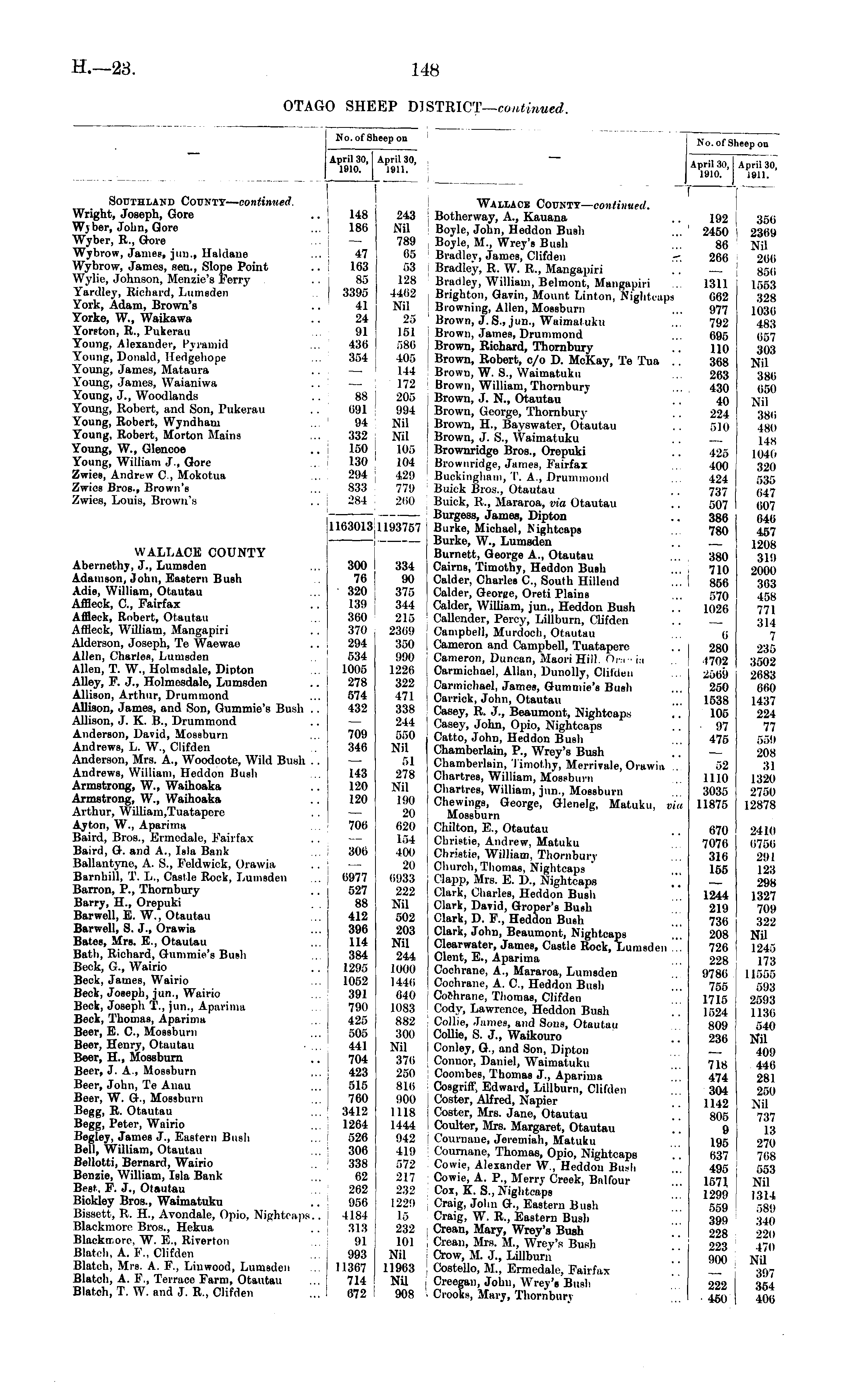 No. of Sheep on April 30, April 30, 1910. 1911. t Southland County — continued. Wright, Joseph, Gore .. 148 W} ber, John, Gore 186 Wyber, R., Gore ... — Wybrow, James, jun., Haldane ... 47 Wybrow, James, sen., Slope Point .. 163 Wylie, Johnson, Menzie's Ferry . . 85 Yardley, Richard, Lumsden . 3395 York, Adam, Brown's .. 41 Yorke, W., Waikawa .. 24 Yorston, R., Pukerau 91 Young, Alexander, Pyramid .., 436 Young, Donald, Hedgehope 354 Young, James, Mataura .. — Young, James, Waianiwa .. — Young, J., Woodlands .. 88 Young, Robert, and Son, Pukerau . . 691 Young, Robert, Wyndham 94 Young, Robert, Morton Mains ... 332 Young, W., Gleneoe .. 150 Young, William J, Gore 130 Zwies, Andrew C, Mokotua ... 294 Zwies Bros., Brown's ... 833 Zwies, Louis, Brown's ., 284 243 Nil 789 or, 53 128 4462 NU 25 151 586 405 144 172 205 001 Nil Nil 105 104 429 779 260 1163013 1193757 WALLACE COUNTY Abernethy, J., Lumsden 300 Adamson, John, Eastern Bush 76 Adie, William, Otautau ... 320 Affleck, ft, Fairfax .. 139 Affleck, Robert, Otautau ... 360 Affleck, William, Mangapiri .. 370 Alderson, Joseph, Te Waewao .. 294 Allen, Charles, Lumsden 534 Allen, T. W., Holmsdale, Dipton ... 1005 Alley, F. J., Holmesdale, Lumsden .. 278 Allison, Arthur, Drummond ... 574 Allison, James, and Son, Gummie's Bush .. 432 Allison, J. K. B., Drummond .. — Anderson, David, Mossburn ... 709 Andrews, L. W., Clifden 346 Anderson, Mrs. A., Woodcotc, Wild Bush .. — Andrews, William, Heddon Bush ... 143 Armstrong, W., Waihoaka .. 120 Armstrong, VV., Waihoaka .. 120 Arthur, William.Tuatapcre .. —■ Ayton, W., Aparima 706 Baird, Bros., Ermedale, Fairfax Baird, G. and A., Isla Bank ... 306 Ballantyne, A. S., Feldwick, Orawia . . —■ Barnhill, T. L., Castle Rock, Lumsden 6977 Barron, P., Thornbury .. 527 Barry, H., Orepuki . . 88 Barwell, E. W., Otautau ... 412 Barwcll, S. J., Orawia ... 396 Bates, Mrs. E., Otautau ... 114 Bath, Richard, Gummie's Bush 384 Beck, G., Wairio ., 1295 Beck, James, Wairio ... 1052 Beck, Joseph, jun., Wairio 391 Beck, Joseph T., jun., Aparima 790 Beck, Thomas, Aparima 425 Beer, E. ft, Mossburn ... 505 Beer, Henry, Otautau 441 Beer, H., Mossburn .. 704 Beer, J. A, Mossburn ... 423 Beer, John, Te Anau ... 515 Beer, W. G., Mossburn 760 Begg, R. Otautau ... 3412 Begg, Peter, Wairio ... 1264 Begley, James J., Eastern Bush 526 Bell, William, Otautau ... 306 Bellotti, Bernard, Wairio 338 Benzie, William, Isla Bank ,., 62 Best, F. J., Otautau 262 Biokley Bros., Waimatuku .. | 956 Bissett, R. H., Avondale, Opio, Nightcaps.. 4184 Blackmore Bros., Hekua 313 Blackrr.orc, W. E., Riverton 91 Blatch, A. V.. Clifden 993 Blatch, Mrs. A. F., Linwood, Lumsden ... 11367 Blatch, A. F., Terrace Farm, Otautau ... j 714 Blatch, T. W. and J. R., Clifden 672 334 90 375 344 215 2369 350 ooo 1226 322 171 338 244 550 Nil 51 278 Nil 190 20 620 154 400 20 6033 222 Nil 502 203 Nil 244 1000 1446 640 1083 882 300 NU 376 250 810 900 1118 1444 942 419 572 217 232 1220 15 232 101 Nil 11963 Nil 908