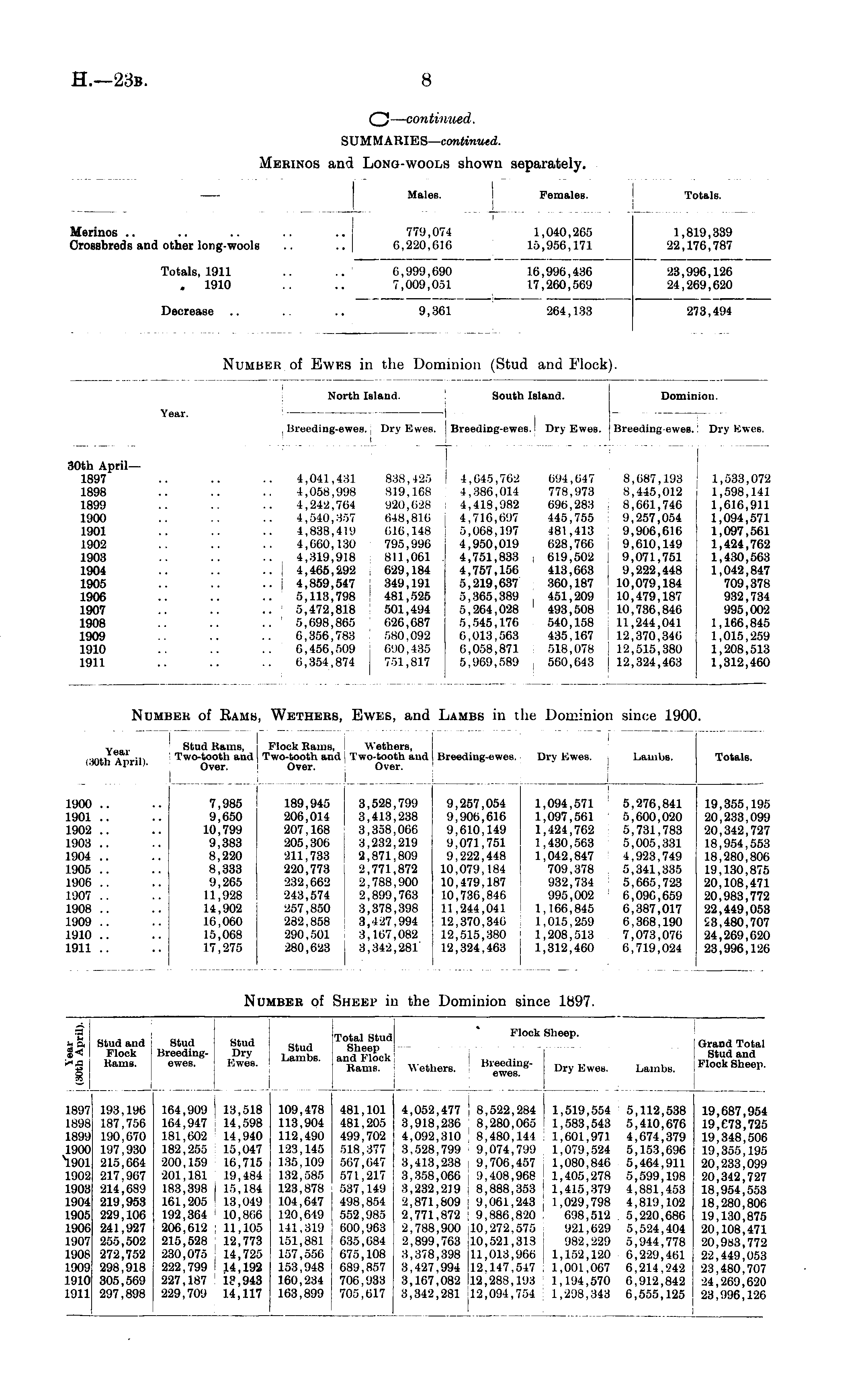 (30th April). Stud Hams, Two-tooth and Over. Flock Earns, Two-tooth and Over. Wethers, Two-tooth and Over. lii-eeding-ewes. Dry Ewes. Lambs. Totals. 1900 .. 1901 .. 1902 .. 1903 .. 1904 .. 1905 .. 1906 .. 1907 .. 1908 .. 1909 .. 1910 .. 1911 .. 7,985 9,650 10,799 9,383 8,220 8,333 9,265 11,928 14,902 16,060 15,068 17,275 189,945 206,014 207,168 205,306 •211,733 220,773 232,662 243,574 257,850 282.858 290.501 280,623 3,528,799 3,413,238 8,858,066 3,232,219 2,871,809 2,771,872 2,788,900 2,899,763 8,878,898 8,427,994 3,167,082 3,342,281 9,257,054 9,900,616 9,610,149 9,071,751 9,222,448 10,079,184 10,479,187 10,736,846 11,244,041 12,370,340 12,515,380 12,324,463 1,094,571 1,097,501 1,424,762 1,430,563 1,042,847 709,378 932,734 995,002 1,166,845 1,015,259 1,208,513 1,312,460 5,276,841 5,600,020 5,731,783 5,005,331 4,923,749 5,341,335 5,665,723 6,090,659 6,387,017 6,368,190 7,073,070 6,719,024 19,355,195 20,233,099 20,342,727 18,954,553 18,280,806 19,130,875 20,108,471 20,983,772 22,449,053 53,480,707 24,269,620 23,996,126