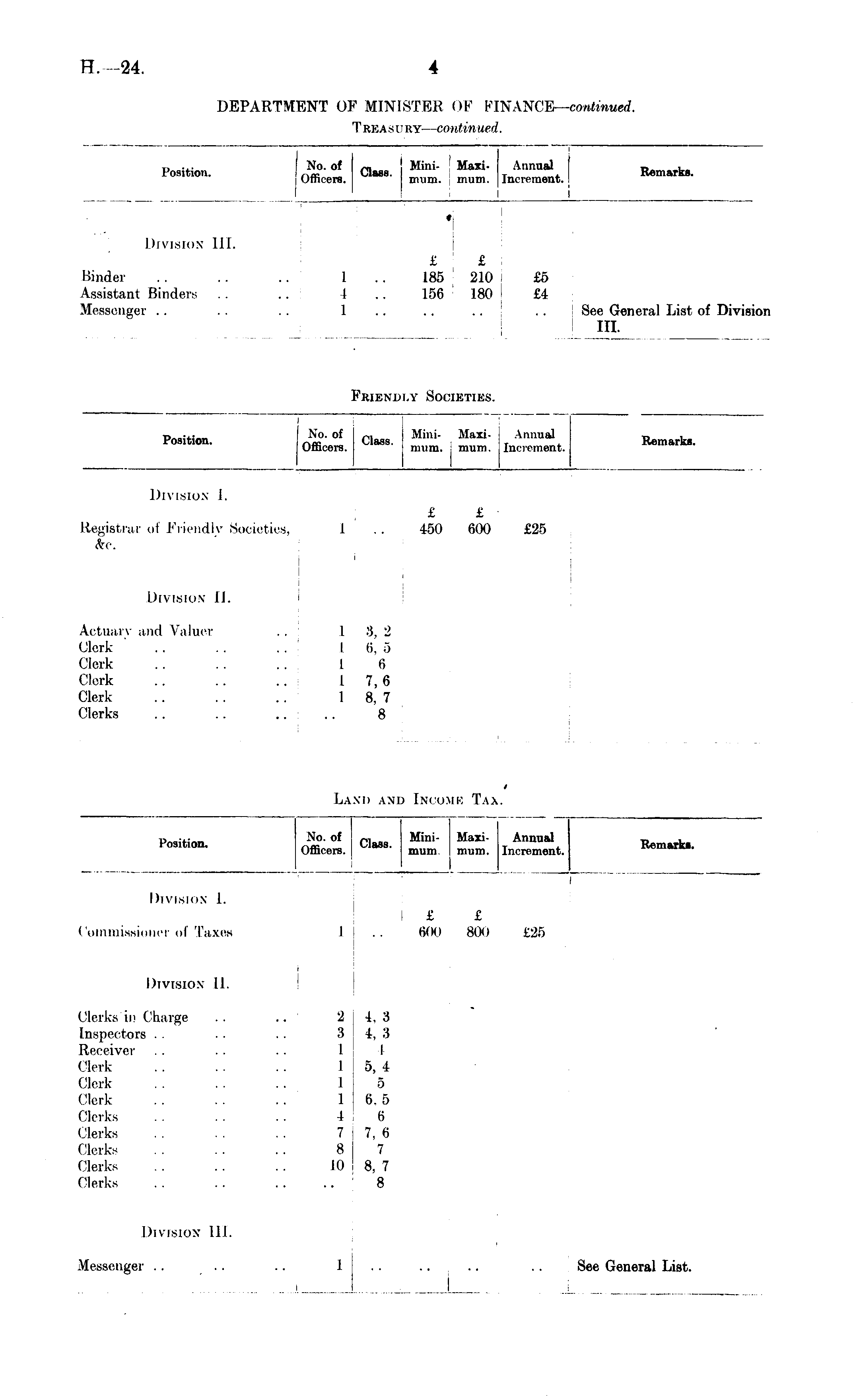 Position. No. of p. j Mini- Maxi- Annual l Officers. ' mum. ! mum. Increment.! I i Remarks. * * » Division 111. Binder Assistant Binders Messenger .. £ £ 1 .. 185 210 I .. 156 180 1 £5 £4 See General List of Division Friendly Societies. Position. No. of r\ass Mini- Maxi- ; Annual Officers. mum. j mum. I Increment. Remarks. Division I. Registrar of Friendly Societies. fcc. £ £ ' 1 .. 450 600 £25 Dl\ tSION I I. Ariiicnv and Valuer Clerk ' .. .. Clerk ; Clerk Clerk Clerks 1 3, 2 I 6, 5 I 6 I 7,6 1 8, 7 8 / Land and Income Tax.. Position. No. of Officers. Class M' ni - Maxi- Annual mum I mum. Increment. I Remark*. Division I. (Commissioner of Tuxes I £ £ 600 800 £25 Division 11. i Clerk.-, in Charge Inspectors Receiver Clerk Clerk Clerk Clerk, i Jlerks Clerks Clerks Clerks 2 4, 3 3 4, 3 I I 1 5, 4 1 ■"> 1 6. 5 I 6 7 7, 6 8 7 10 8, 7 8 Division III. Messenger . . _ . . 1 "• I " See General List.