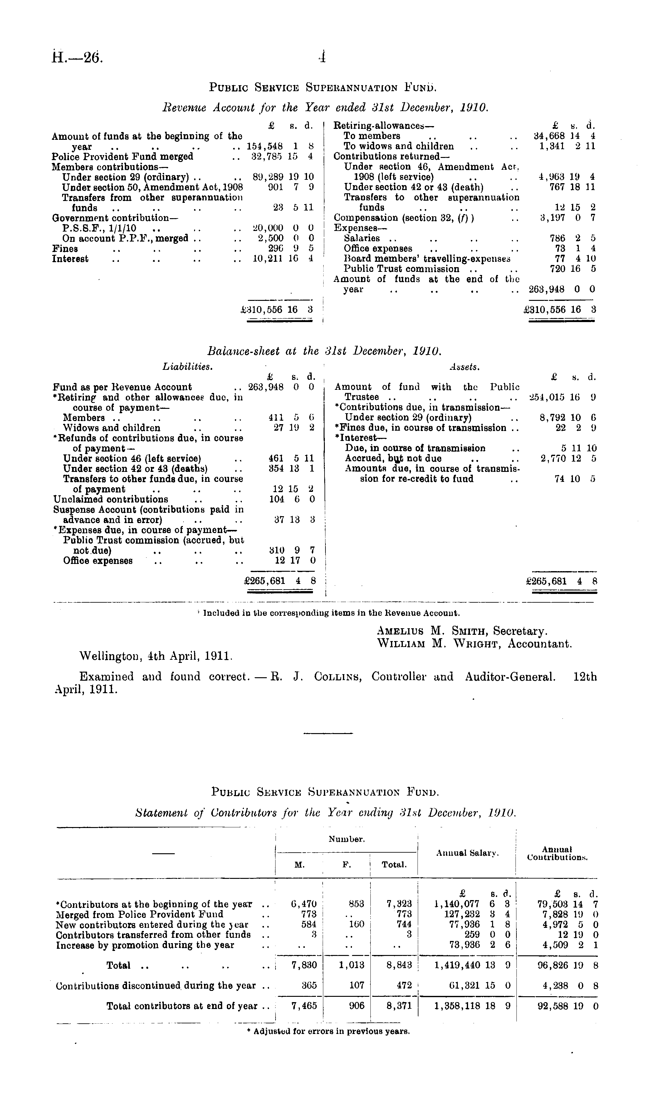 Amelius M. Smith, Secretary. William M. Wright, Accountant. Wellington, 4th April, 1911. Examined and found correct.—E. J. Collins, Controller and Auditor-General. 12th April, 1911.