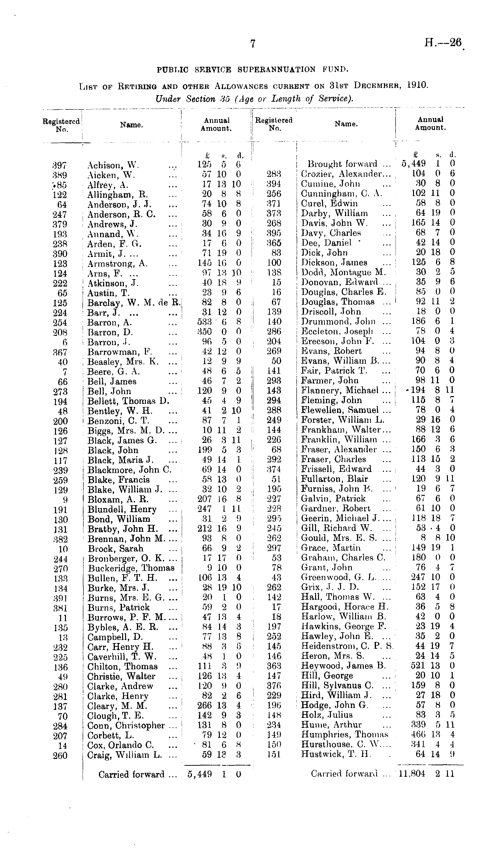 PUBLIC SERVICE SUPERANNUATION FUND. List of Retiring and other Allowances current on 31st December, 1910. Under Section 35 (Age or Length of Service).