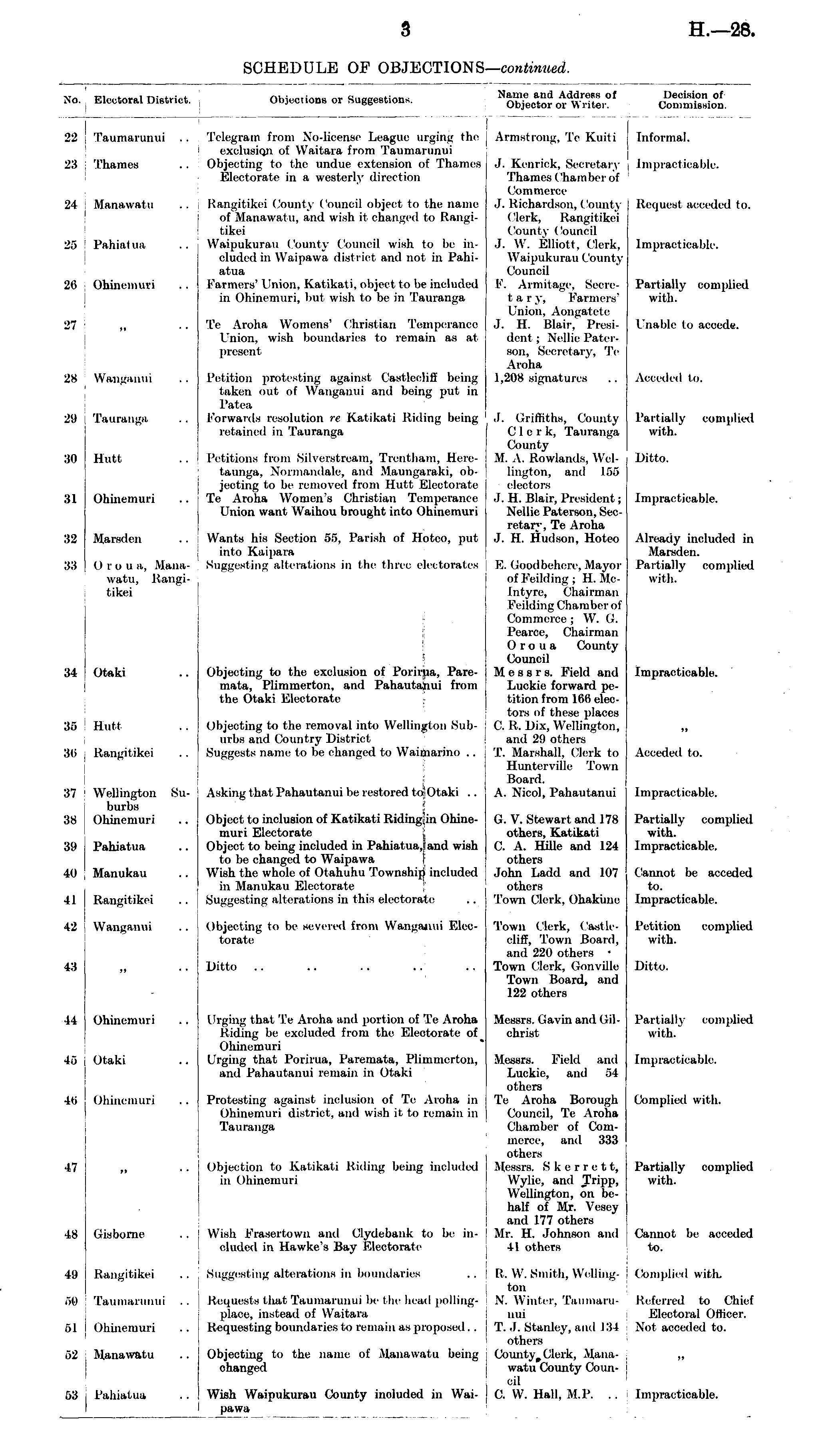 No. Electoral District. Object ioD8 or Suggestions. Name and Address of Objector or Writer. Decision of Commission. 22 Taiimarunui .. Telegram from No-license League urging the exolusiqn of Waitara from Taumarunui Objecting to the undue extension of Thames Electorate in a westerly direction Armstrong, Te Kuiti Informal. 23 Thames .1. Kniriek. Secretary Thames < Chamber of Commerce J. Richardson, County Clerk, Rangitikei County ('oiineil .1. W. Elliott, Clerk. Waipukurau County Council I , '. Armitage, Secretary, Farmers' Union, Aongatete J. H. Blair, Picsidi'ut ; Nellie Paterson, Secretary, Te Aroha 1,208 signatures [mpraotioabie. ■Ji Manawatu Rangitikei County Council object to the name of Manawatu. and wish ii changed to Rangit ikei Waipukurau County Council wish to lie included inWaipawa district and not in Pahiatua Request acoeded to. ■i:> Pahiat ua [mpraoticable. L'li Ohinemuri Farmers' Union, Katikati, object to be included in Ohinemuri, liut wish to be in Tauranga Partially oomplied with. :27 ,» • • IV \ioli.i Woinens' Christian Tejnperance I'nion. wish boundaries to remain as at present Unable to accede. Wanganui Petition protesting against Castleckff being taken out of Wanganui and being put in Patea Forwards resolution re Katikati Riding being retained in Tauranga Acceded to. 28 29 Tauranga J. Griffiths, County Clerk, Tauranga County M. A. Rowlands. Wellington, and 155 electors J.H.Blair, President; Nellie Patereon, Seolelan . Tβ Aroha .1. H. Hudson, Soteo Partially oomplied with. 30 Hiitt Petitions from Silverstream, Treutlia.ni. Eeretaunga, Nonnandale, and Maungaraki, objecting to be removed from Butt Electorate 'IV Aioha Women's Christian Temperance Union want Waihou brought into Ohinemuri Ditto. :ii Ohinemuri Impracticable. :•,■-> Marsderj Wants his Section 55, Parish of Boteo, put into Kaipara Suggesting alterations in the three electorates Already included in Marsden. Partially oomplied with. 33 Otiiua, Manawatu, Kangitikei E. Goodbehere, Mayor ofFeilding : H. MoIntyre. Chairman I'eilding Chamber of Commerce; W. ('•. Pearoe, Chairman Orotu County Council Messrs. Field and Luckir forward petition from I'ili eleetors of these places C. R. Dix, Wellington, and 29 others T. Marshall, Clerk to Huntcrville Town Board. A. Nicol, Pahautanui Otaki Objecting \<> the exclusion of Porirjia, Paremata, Plimmerton, and Pahautanui from the Otaki Electorate Impracticable. lit Hutl Objecting to the removal into Wellington Suhurlis and Country District Suggests name to be changed to Waimarino . . >» 35 :tii Rangitikei Acceded to. :t7 Wellington Suburbs Ohinemuri Asking that Pahautanui lie restored to Otaki .. ■ Object to inclusion of Katikati Riding in Ohinemuri Electorate Object to being included in Pahiat ua. and wish to be changed to Waipawa Wish the whole of Otahuhu Township included in Manukau Electorate i ing alterations in this electors te Impracticable. :ss :t'.i Pahiat u a G.V.Stewart and 17* others, Katikati C. A. Hille and 124 others John Ladd and 107 others Town Clerk, Ohakune Partially complied with. Impracticable. in Manukau ( annot be acceded to. Impracticable. ii Rangitikei 12 Wanganui Objecting to be severed from Wangajuti Electorate Town Clerk, Castlecliff, Town Board, and 220 others • Town Clerk, Qonville Town Board, and 122 others Petition complied with. 13 Ditto .. Ditto. II Ohinemuri Urging that Te Aroha and portion of Te Aroha Riding be excluded from the Electorate of Ohinemuri Urging that Porirua, Paremata, Plimmertoii, and Pahautanui remain in Otaki Messrs. < lavin and (iilchrist Partially oomplied with. 15 Otaki Messrs. Field and Luckie, and 54 others Te Aroha Borough Council, Te Aroha Chamber of Commerce, and 333 others Messrs. S k e r r e 11, Wylie. and Tripp, Wellington, on behalf of Hγ. Vesey and 177 others Mr. H. Johnson and 41 others Impracticable. Lβ Ohinemuri Protesting against inclusion of Te Aroha in Ohinemuri district, and wish it to remain in Tauranga Oomplied with. (7 »> • • Objection to Katikati Hiding being included in Ohinemuri Partially complied with. is Gisborne Wish Frasertown and Clydebank to be included in Eawke's Bay F.lrctoratc Cannot be aooeded to. in li; ii ikei .. , Suggesting alterations in boundaries R, W. Smith. Willington \. Winter, Taumarunui T. J. Stanley, and 134 others Clerk, Manawatu County Council 0. W. Hall, M.P. .. (lomplied with. Bβ Taumarunui . . Requests that Taumarunui be i he head pollingplace, instead of Waitara Requesting boundaries t<) remain as proposed . . Referred to Chief Electoral Officer. Not acceded to. ;,i Ohinemuri 52 Hauawatu Objecting to the name of Manawatu being changed Pahiatua Wish Waipukurau County inoluded in Waipawa [mpraotioabie. :,:',