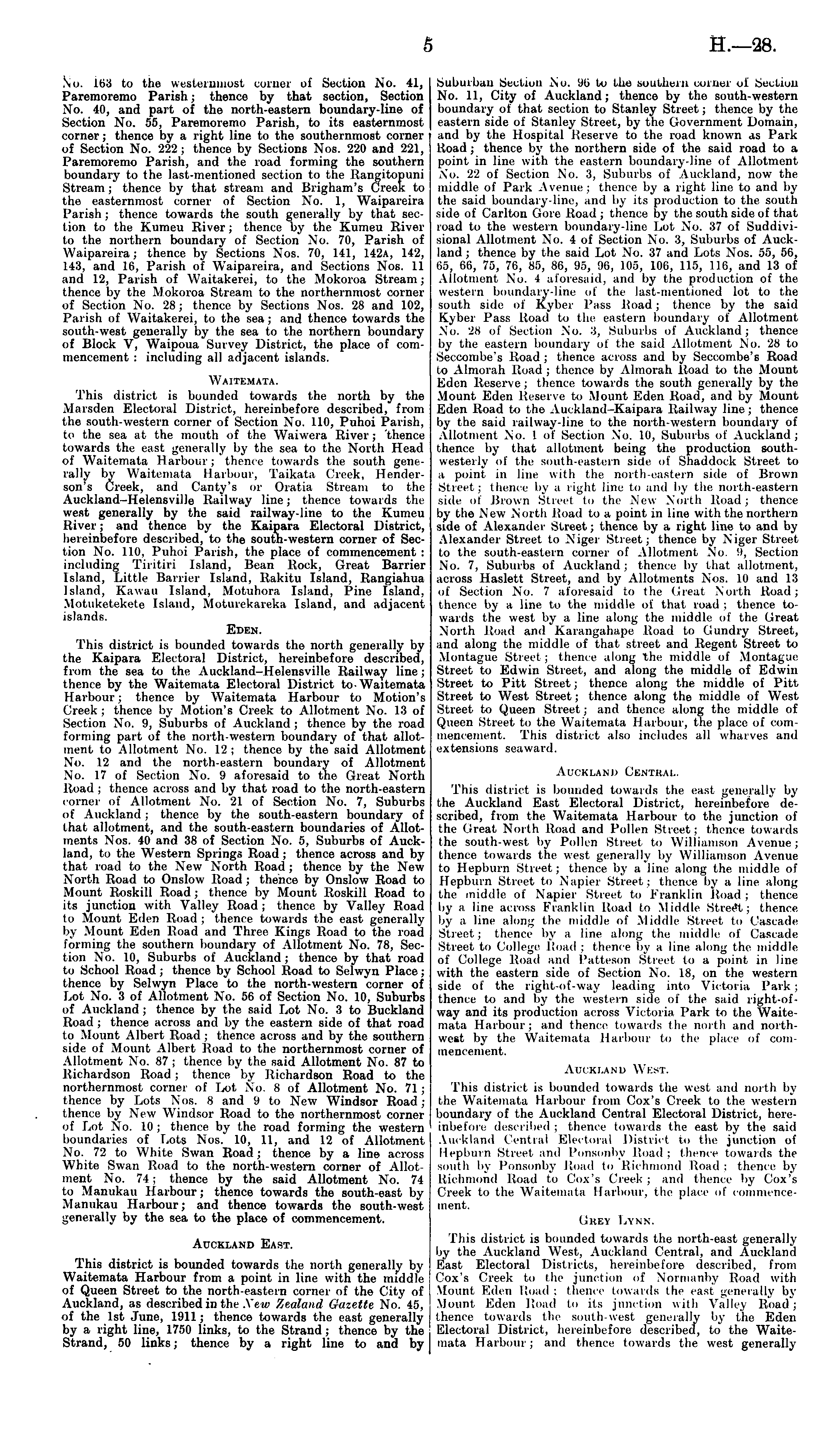 No. 163 to the westernmost corner of Section No. 41, Paremoremo Parish; thence by that section, Section No. 40, and part of the north-eastern boundary-line of Section No. 55, Paremoremo Parish, to its easternmost corner; thence by a right line to the southernmost corner of Section No. 222; thence by Sections Nos. 220 and 221, Paremoremo Parish, and the road forming the southern boundary to the last-mentioned section to the Kangitopuni Stream ; thence by that stream and Brigham's Creek to the easternmost corner of Section No. 1, Waipareira Parish; thence towards the south generally by that seclion to the Kumeu River; thence by the Kumeu River to the northern boundary of Section No. 70, Parish of Waipareira; thence by Sections Nos. 70, 141, 142 a, 142, 113. and 16, Parish of Waipareira, and Sections Nos. 11 and 12, Parish of Waitakerei, to the Mokoroa Stream; thence by the Mokoroa Stream to the northernmost corner of Section No. 28; thence by Sections Nos. 28 and 102, Parish of Waitakerei, to the sea; and thence towards the south-west generally by the sea to the northern boundary of Block V, Waipoua Survey District, the place of commencement : including all adjacent islands. Waitemata. This district is bounded towards the north by the Maisden Electoral District, hereinbefore described, from the south-western corner of Section No. 110, Puhoi Parish, to the sea at the month of the Waiwera River; thence towards the east generally by the sea to the North Head of Waitemata Harbour; thence towards the south generally by Waiteniata Harbour, Taikata Creek, Henderson's Creek, and Canty's or Oratia Stream to the Auckland—Helensville Kailway line; thence towards the west generally by the said railway-line to the Kumeu River; and thence by the Kaipara Electoral District, hereinbefore described, to the south-western corner of Section No. 110, Puhoi Parish, the place of commencement : including Tiritiri Island, Bean Rock, Great Barrier Island, Little Barrier Island, Rakitu Island, Rangiahua Island, Kawau Island, Motuhora Island, Pine Island, Motuketekete Island, Moturekareka Island, and adjacent islands. Eden. Phis district is bounded towards the north generally by the Kaipara Electoral District, hereinbefore described, from the sea to the Auckland-Helensville Railway line; thence by the Waiteniata Electoral District to Waitemata Harbour; thence by Waiteniata Harbour to Motion's Creek ; thence by Motion's Creek to Allotment No. 13 of Section No. 9, Suburbs of Auckland ; thence by the road forming part of the north-western boundary of that allotment to Allotment No. 12; thence by the said Allotment No. 12 and the north-eastern boundary of Allotment No. 17 of Section No. 9 aforesaid to the Great North Koad ; thence across and by that road to the north-eastern corner of Allotment No. 21 of Section No. 7, Suburbs of Auckland : thence by the south-eastern boundary of that allotment, and the south-eastern boundaries of Allotments Nos. 40 and 38 of Section No. 5, Suburbs of Auckland, to the Western Springs Road ; thence across and by that road to the New North Road; thence by the New North Road to Onslow Road; thence by Onslow Road to Mount Roskill Road; thence by Mount Roskill Road to its junction with Valley Road; thence by Valley Road to Mount Eden Road ; thence towards the east generally by Mount Eden Road and Three Kings Road to the road forming the southern boundary of Allotment No. 78, Sec--1 ion No. 10, Suburbs of Auckland ; thence by that road to School Road ; thence by School Road to Selwyn Place; thence by Selwyn Place to the north-western corner of Lot No. 3 of Allotment No. 56 of Section No. 10, Suburbs of Auckland; thence by the said Lot No. 3to Buckland Road ; thence across and by the eastern side of that road lo Mount Albert Road ; thence across and by the southern side of Mount Albert Koad to the northernmost corner of Allotment No. 87 ; thence by the said Allotment No. 87 to Richardson Road ; thence by Richardson Road to the northernmost corner of Lot No. 8 of Allotment No. 71; thence by Lots Nos. 8 and 9 to New Windsor Road; thence by New Windsor Road to the northernmost corner of Lot No. 10; thence by the road forming the western boundaries of Lots Nos. 10, 11, and 12 of Allotment No. 72 to White Swan Road; thence by a line across White Swan Koad to the north-western corner of Allotment No. 71 : thence by the said Allotment No. 74 to Manukas Harbour; thence towards the south-east by Manukau Harbour; and thence towards the south-west generally by the sea to the place of commencement. Auckland East. This district is bounded towards the north generally by Waitemata Harbour from a point in line with the middle of Queen Street to the north-eastern coiner of the City of Auckland, as described in the Xew Zealand Gazette No. I"). of the Ist June, 1911; thence towards the east generally by a right line, 1750 links, to the Strand; thence by the Strand, 50 links; thence by a right line to and by