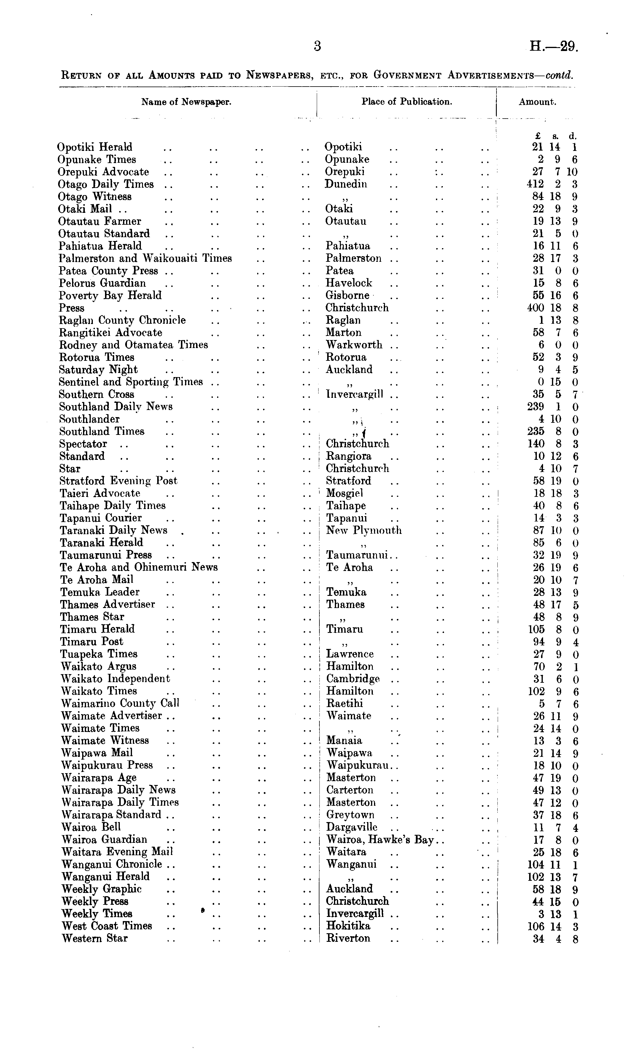Name of Newspaper. Place of Publication. Amount. Opotiki Herald Opunake Times Orepuki Advocate Otago Daily Times . . ()tago Witness Otaki Mail . . Otautau Farmer Otautau Standard Pahiatua Herald Palmerston and Waikouaiti Times Patea County Press Pelorus Guardian Poverty Bay Herald Press .. .. Raglan County Chronicle Rangitikei Advocate Rodney and Otamatea Times Rotorua Times Saturday Night Sentinel and Sporting Times . . Southern Cross Southland Daily News Southlander Southland Times Spectator Standard Star Stratford Evening Post Taieri Advocate Taihape Daily Times Tapanui Courier Taranaki Daily News Taranaki Herald Taumarunui Press Te Aroha and Ohinemuri News Te Aroha Mail Temuka Leader Thames Advertiser Thames Star Timaru Herald Timaru Post Tuapeka Times Waikato Argus Waikato Independent Waikato Times Waimarino County Call Waimate Advertiser Waimate Times Waimate Witness Waipawa Mail Waipukurau Press Wairarapa Age Wairarapa Daily News Wairarapa Daily Times Wairarapa Standard .. Wairoa Bell Wairoa Guardian Waitara Evening Mail Wanganui Chronicle Wanganui Herald Weekly Graphic Weekly Press Weekly Times .. * .. West Coast Times Western Star Opotiki Opunake Orepuki Dunedin .. Otaki Otautau Pahiatua Palmerston Patea Havelock Gisborne Christchurch Raglan Marton Warkworth Rotorua Auckland ,, Invercargill . . ,, „ i Christchurch Rangiora Christchurch Stratford Mosgiel Taihape Tapanui New Plymouth Taumarunui.. Te Aroha Temuka Thames .. ii Timaru ,, Lawrence Hamilton Cambridge Hamilton Raetihi Waimate I Manaia Waipawa Waipukurau Masterton Carterton Masterton Greytown Dargaville .. j Wairoa, Hawke's Bay.. Waitara Wanganui • ■ ,i .. j Auckland Christchurch Invercargill Hokitika .. i Riverton ■ - " - - £ s. d. 21 14 1 2 9 6 27 7 10 412 2 3 84 18 9 22 9 3 19 13 9 21 5 0 16 11 6 28 17 3 31 0 0 15 8 6 55 16 6 400 18 8 1 13 8 58 7 6 6 0 0 52 3 9 9 4 5 0 15 0 35 5 7 239 1 0 4 10 0 235 8 0 140 8 3 10 12 6 4 10 7 58 19 0 18 18 3 io 8 6 14 3 3 87 10 o 85 6 0 32 in 9 26 19 6 20 10 7 28 13 9 48 17 5 48 8 9 105 8 0 94 9 4 27 9 0 70 2 1 31 6 0 102 9 6 5 7 6 26 11 9 24 14 0 13 3 6 21 14 9 18 10 0 47 19 0 49 13 0 47 12 0 37 18 6 11 7 4 17 8 0 25 18 6 104 11 1 102 13 7 58 18 9 44 15 0 3 13 1 106 14 3 34 4 8