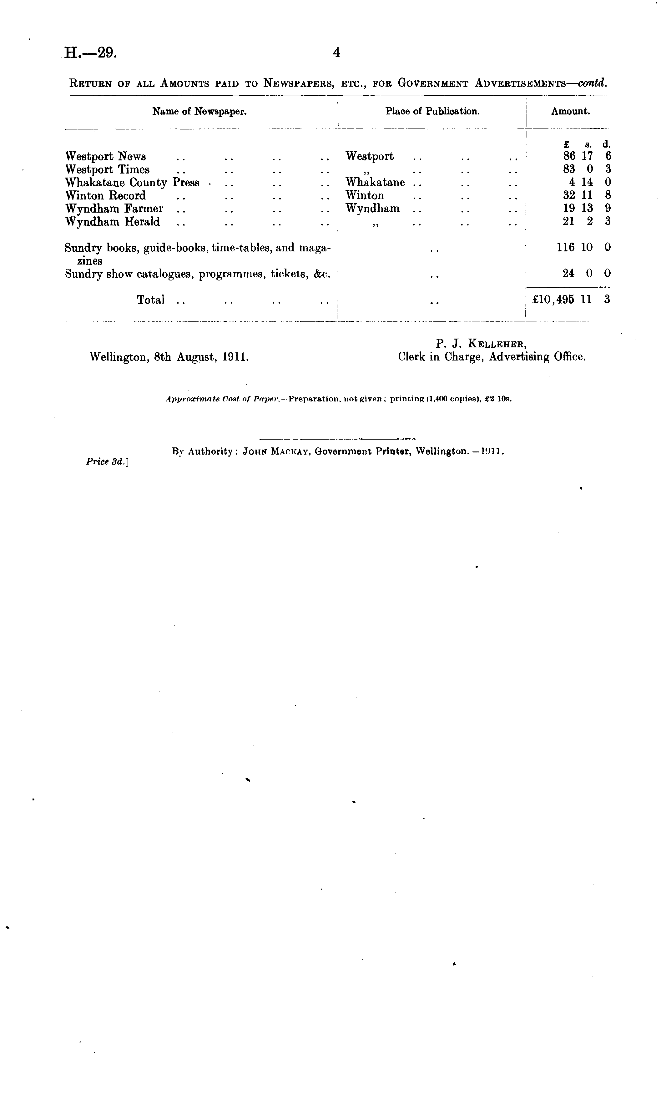 P. J. Kelleher, Wellington, Bth August, 1911. Clerk in Charge, Advertising Office. Approximate Ooet of Paper.- Preparation, not given ; printing (1,-iOO copies), t'2 10s.