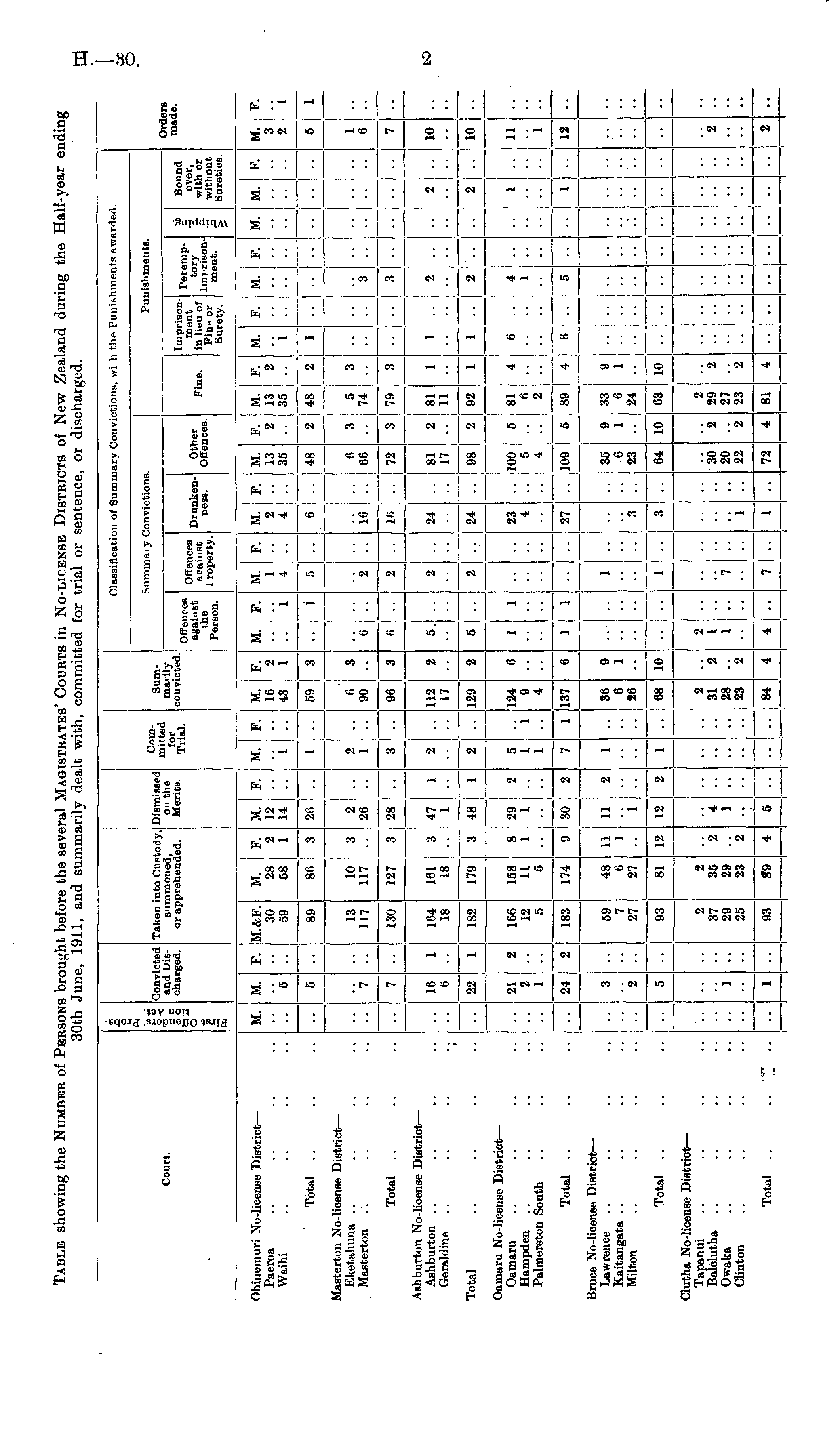 Table showing the Number of Persons brought before the several Magistrates' Courts in No-license Districts of New Zealand during the Half-year ending 30th June, 1911, and summarily dealt with, committed for trial or sentence, or discharged.