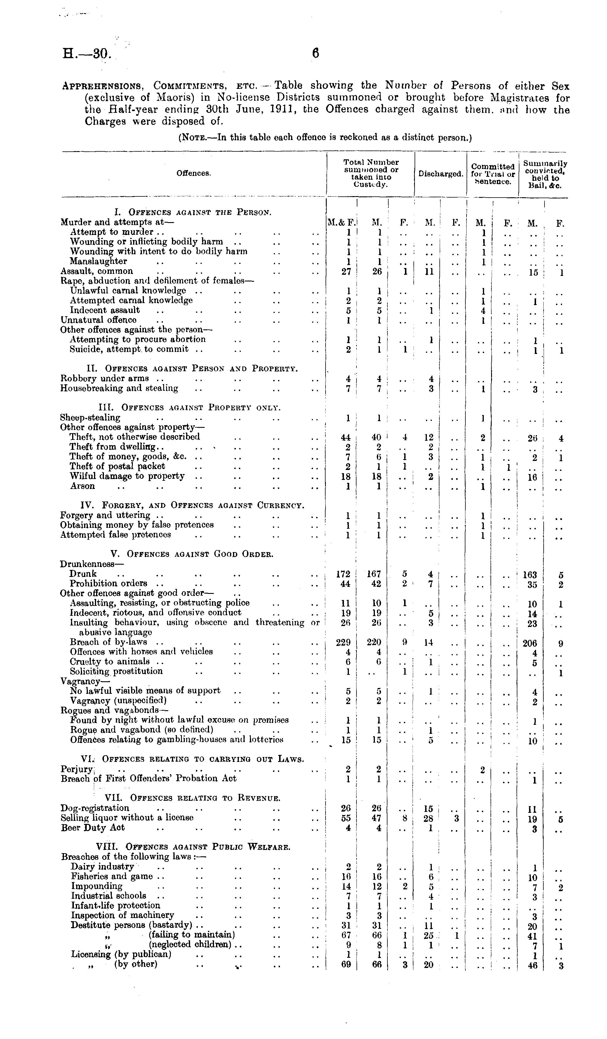 Apprehensions, Commitments, etc.-Table showing the Number of Persons of either Sex (exclusive of Maoris) in No-license Districts summoned or brought before Magistrates for the Half-year ending 30th June, 1911, the Offences charged against them, and how the Charges were disposed of.