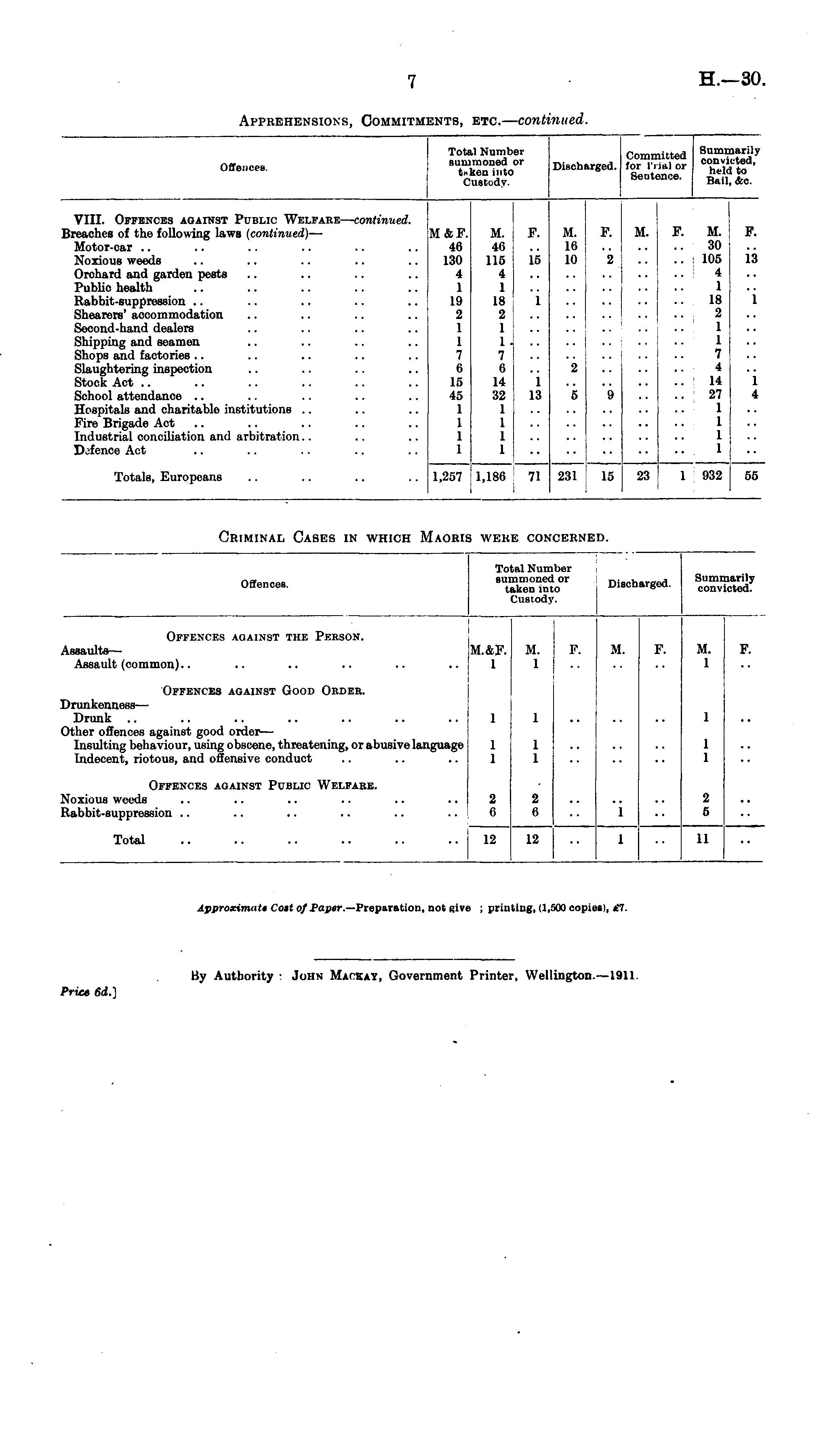 Offences. Total Number summoned or tnken into Custody. Diechi irged. Oomn for Ii Seuti nitted nil or ence. Sumn convi helc Bail, aarily cted, 1 to , &c. VIII. Offences against Public Welfare— continued. (reaches of the following laws (continued) — Motor-car Noxious weeds Orchard and garden pests Public health Rabbit-suppression Shearers' accommodation Second-hand dealers Shipping and seamen Shops and factories Slaughtering inspection Stock Act School attendance Hospitals and charitable institutions Fire Brigade Act Industrial conciliation and arbitration.. Defence Act M & F. 46 130 4 1 19 2 1 1 7 6 15 45 1 1 1 1 M. 46 115 4 1 18 2 1 1 7 6 14 32 1 1 1 1 F. 15 i M. 16 10 F. 2 M. F. M. 30 .. 105 4 1 18 2 1 1 7 4 14 27 1 1 1 1 V. 13 2 1 4 i 13 5 9 Totals, Europeans 1,257 71 231 15 1 932 1,186 23 66