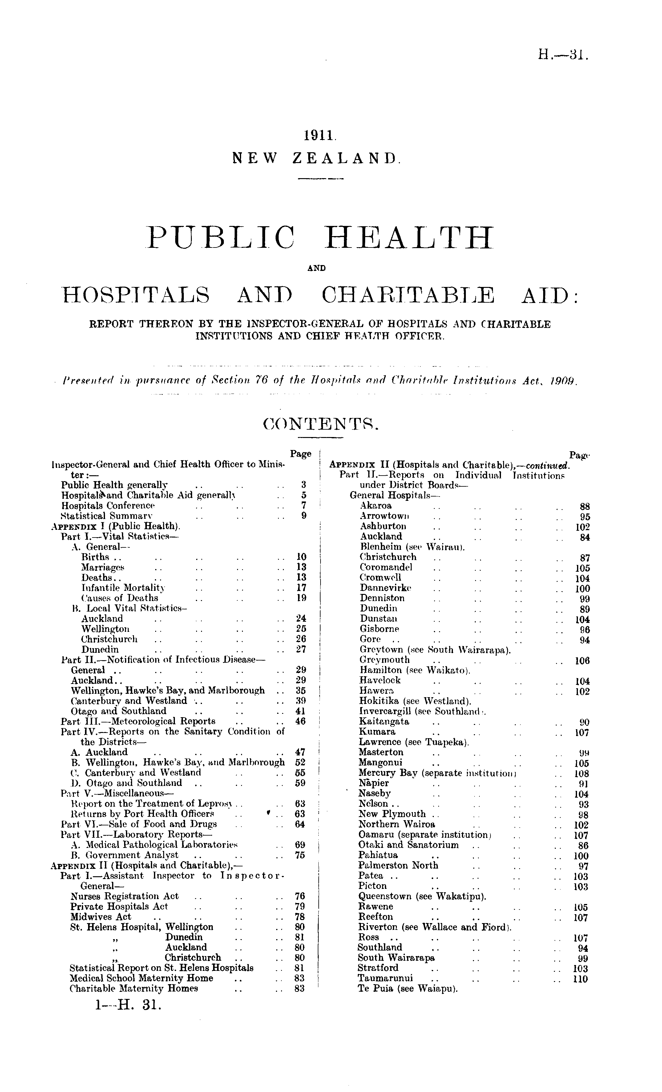 PUBLIC HEALTH AND HOSPITALS AND CHARITABLE AID: REPORT THEREON BY THE INSPECTOR-GENERAL OF HOSPITALS AND CHARITABLE INSTITUTIONS AND CHIEF HEALTH OFFICER.