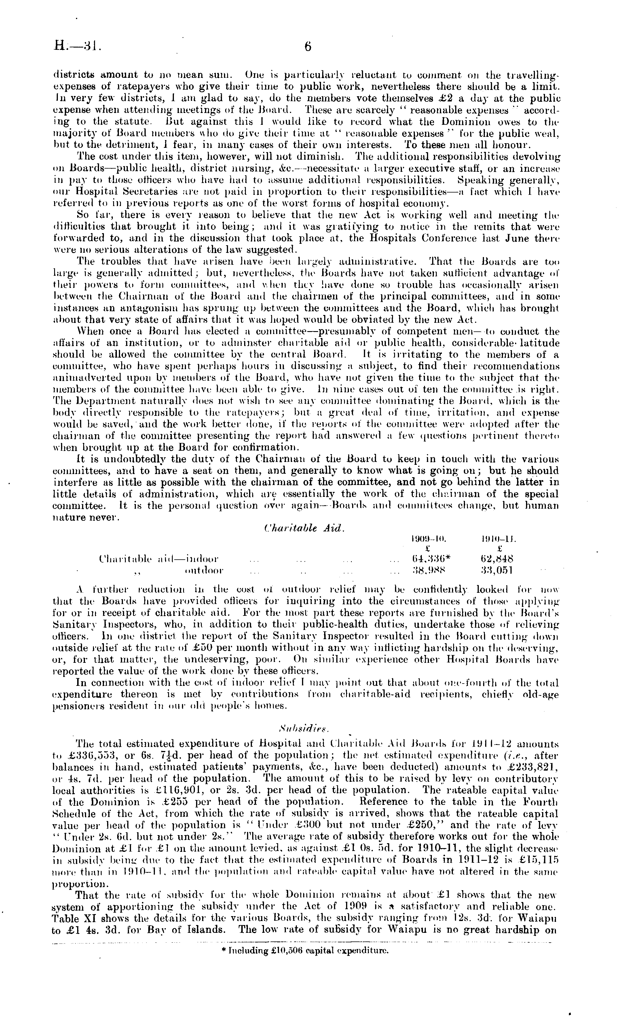 districts amount to no mean sum. One is particularly reluctant to comment on the travellingexpenses of ratepayers who give their time to public work, nevertheless there should be a limit. In very few districts, I am glad to say, do the members vote themselves £2 a day at the public expense when attending meetings of the Board. These are scarcely " reasonable expense's " accord ing to the statute But against this I would like to record what the Dominion owes to the majority of Hoard members who do give their lime at " reasonable expenses " for the public weal, hut to the detriment, I fear, in many cases of their own interests. To these men all honour. The cost under this item, however, will not diminish. The additional responsibilities devolving on Hoards public health, district nursing, &c; necessitate a larger executive staff, or an increase in pay io those officers who have itad to assume additional responsibilities. Speaking generally, our Hospital Secretaries He not paid in proportion to their responsibilities —a fact which I have referred to in previous repoi ts as one of the worst forma of hospital economy. So far. there is every reason to believe that the new Act is working well and meet ino the difficulties that brought it into being; ami it was gratifying to notice in the remits that were forwarded to, and in the discussion that took place at, the Hospitals Conference fast June there were no serious alterations of the law suggested. The troubles that have arisen have ,i-en Largely administrative. That the Boards are too large is generally admitted; but, nevertheless, the Hoards have not taken sufficient advantage of their powers to form committees, and when they have done so trouble has occasionally arisen between the Chairman of the Board and the chairmen of the principal committees, and in some instances an antagonism has sprung up between the committees and the Hoard, which has brought about that very state of affairs that it was hoped would be obviated by the new Act. When once a Hoard has elected a committee —presumably of competent men to conduct the affairs of an institution, or to adminster charitable aid or public health, considerable-latitude should be allowed the committee by the central Board. It is irritating to the members of a committee, who have spent perhaps hours in discussing a subject, to find their recommendations animadverted upon by members of the Hoard, who have not given the time to the subject thitt the members of the committee have been able to give. In nine cases out of (en Ihe committee is right. The Department naturally does not wish to see any committee dominating the Hoard, which is the body directly responsible to the ratepayers; but a great deal of time, irritation, and expense would be saved, and the work better done, if the reports of the commit lee were adopted after the chairman of the committee presenting the report had answered a few questions pertinent thereto when brought up tit the Hoard fin confirmation. It is undoubtedly the duty of the Chairman of the Hoard to keep in touch with the various committees, and to have a seat on them, and generally to know what is going on ; but he should interfere as little as possible with the chairman of the committee, and not go behind the latter in little details of administration, which are essentially the work of the chairman of the special committee. It is the personal question over again Hoards and coi ittees change, hut human nature never. ' 'haritable Aid. 1909-10. 1910-11. C E Charitable aid—indoor ... ... ... ... 64,336* (12.MS outdoor ... ... ... 38,988 33,081 A further reduction in the cost oj outdoor relief may hi- confidently looked for now that the Hoards have provided officers for inquiring into the circumstances of those applying for or in receipt of charitable aid. For the most part these reports are furnished b\ the Board's Sanitary Inspectors, who, in addition to theit public-health duties, undertake those of relieving officers. In one district the report of the Sanitary Inspector resulted in the Hoard cutting down outside relief at the rate of £50 per month without in any way inflicting hardship on the deserving. or, for that matter, the undeserving, poor. On similar experience other Hospital Hoards have reported the value of tin.' work done by these officers. In connect urn with the Cost of indoor relief 1 may point out that about one-fourth of the total expenditure thereon is met by contributions from charitable-aid recipients, chiefly old-age pensioners resident in our old people's homes. Subsidies. The total estimated expenditure of Hospital ami Charitable Aid Hoards for 1911-12 amounts to £336,553, or (is 71 <I. pei- head of the population; the net estimated expenditure (i.e., after balances in hand, estimated patients' payments, <fcc, have been deducted) amounts to £233,821, or Is. 7d. per head of the population. The ai lilt of this to b ( ' raised by levy on contributory local authorities is £116,901, or 2s. 3d. per bead of the population. The rateable capital value of the Dominion is £255 per bead of the population. Reference to the table in the fourth Schedule of the Act. from which the rate of subsidy is arrived, shows that the rateable capital value per head of tin- population is " Under £.'IOO but not under £250," and the rate of levy " ruder 2s. (id. but not under 25." The average rate' of subsidy therefore works out for the whole Dominion at £1 for £1 on tin- amount levied, as against £1 Os. sd. lor 1910-11. the Blight decrease ill subsidy being dm- io the fact that the estimated expenditure of Hoards in 1911-12 is £15.115 more than in 191(1- 11. and the population and rateable capital value have not altered in the same proportion. That the rate of subsidy for the whole Dominion remains at about £l shows that the new system of apportioning the subsidy under the Act of 1909 is a satisfactory and reliable oik. fable XI shows the details for the variou