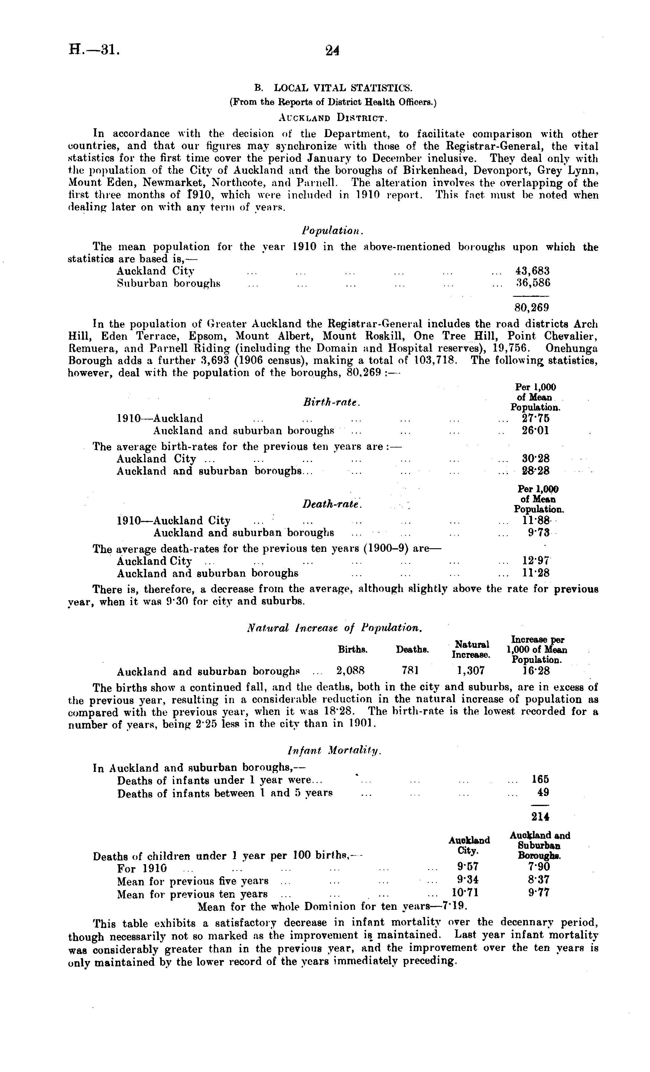 B. LOCAL VITAL STATISTICS. (From the Reports of District Health Officers.) Auckland District. In accordance with the decision of the Department, to facilitate comparison with other countries, and that our figures may synchronize with those of the Registrar-General, the vital statistics for the first time cover the period January to December inclusive. They deal only with the population of the City of Auckland and the boroughs of Birkenhead, Devonport, Grey Lynn, Mount Eden, Newmarket, Northcote, and Parnell. The alteration involves the overlapping of the first three months of T9lO, which were included in 1910 report. This fact must be noted when dealing later on with any term of years. Population. The mean population for the year 1910 in the above-mentioned boroughs upon which the statistics are based is,— Auckland City ... ... ... ... ... ... 43,683 Suburban boroughs ... ... ... ... ... ... 36,586 80,269 In the population of Greater Auckland the Registrar-General includes the road districts Arch Hill, Eden Terrace, Epsom, Mount Albert, Mount Roskill, One Tree Hill, Point Chevalier, Remuera, and Parnell Riding (including the Domain and Hospital reserves), 19,756. Onehunga Borough adds a further 3,693 (1906 census), making a total of 103,718. The following statistics, however, deal with the population of the boroughs, 80,269 : — Per 1,000 p °^ n 1910—Auckland ... ... ... ... ... ... 27*75 Auckland and suburban boroughs ... ... ... 26*01 The average birth-rates for the previous ten vears are : — Auckland City ... ... ... ... ... ... ... 30*28 Auckland and suburban boroughs... ... ... ... ... 28*28 Per 1,000 Death-rate. v °l^T Population. 1910—Auckland City ... ... ... ... ... ... 11*88 Auckland and suburban boroughs .. ... ... ... 9*73 The average death-rates for the previous ten years (1900-9) are — Auckland City .. ... ... ... ... ... ... 12*97 Auckland and suburban boroughs ... ... ... ... 11*28 There is, therefore, a decrease from the average, although slightly above the rate for previous vear, when it was 9'30 for city and suburbs. Natural Increase of Population. v, t „-i Increase per Births. Deaths. ™™rai i 0 00 of Mean Increase. V, , .. Population. Auckland and suburban boroughs ... 2,088 781 1,307 16*28 The births show a continued fall, and the deaths, both in the city and suburbs, are in excess of the previous year, resulting in a considerable reduction in the natural increase of population as compared with the previous year, when it was 18'28. The birth-rate is the lowest recorded for a number of years, being 2 - 25 less in the city than in 1901. Infant Mortality. In Auckland and suburban boroughs,— Deaths of infants under 1 year were... ... ... ... ... 165 Deaths of infants between 1 and 5 years ... ... ... 49 214 Auokland Auckland and c; . Suburban Deaths of children under 1 vear per 100 births.- »" Boroughs. For 1910 957 7*90 Mean for previous five years ... ... ... 9'34 8*37 Mean for previous ten years ... ... ... 10*71 9*77 Mean for the whole Dominion for ten years—7*l9. This table exhibits a satisfactory decrease in infant mortality over the decennary period, though necessarily not so marked as the improvement is_ maintained. Last year infant mortality was considerably greater than in the previous year, and the improvement over the ten years iB only maintained by the lower record of the years immediately preceding.