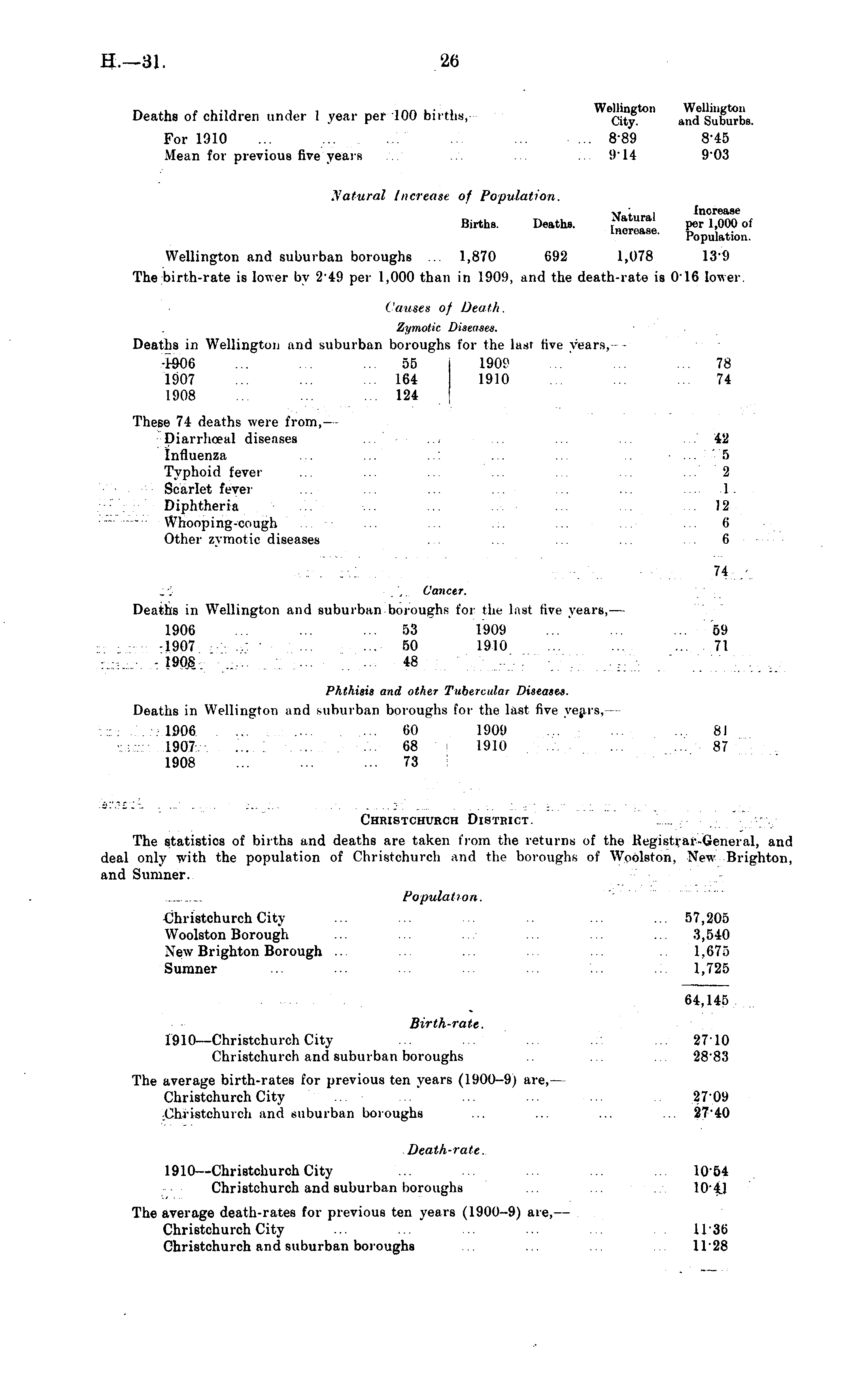 n ~ . , ~, , , .„„ ,• ~ Wellington Wellington Deaths of children under 1 year per 100 births, ci * and Suburbs. For 1910 ... ..'. ... ... B*B9 8*45 Mean for previous five years . . .914 9*03 Natural Increase of Population. v • . Increase Births. Deaths. |*»™™ per 1,000 of incioase. p 0 p U i flt i 011 . Wellington and suburban boroughs ... 1,870 692 1,078 13*9 The birth-rate is lower by 249 per 1.000 than in 1909, and the death-rate is 016 lower. ' a uses of Death. Zymotic Diseases. Deaths in Wellington and suburban boroughs for the last five years,- - -1906 ... ... ... 55 1909 ... ... ... 78 1907 ... ... ... 164 1910 ... ... ... 74 1908 ... ... ... 124 These 74 deaths were from, — Diarrhoeal diseases .. ... ... 42 Influenza ... ... ... ... 6 Typhoid fever ... ... ... ... ... ... 2 Scarlet fever ... ... ... ... . ... .... 1. Diphtheria ... ... ... ... ... 12 Whooping-cough ... ... ... ... ... ... o* Other zymotic diseases ... ... ... . . ... 6 74 ■ ".'.. Cancer. Deaths in Wellington and suburban boroughs for the last five years,— 1906 ... ... ... 53 1909 ... ... ... 59 -1907 ... ... 50 1910 ... ... 71 1908 ... 48 Phthisis and other Tubercular Diseases. Deaths in Wellington and suburban boroughs for the last five years, — 1906 ... ... 60 1909 ~. ... ... 81 1907 ... ... ... 68 1910 ... ... 87 1908 ... ... ... 73 Christchurch District. The statistics of births and deaths are taken from the returns of the Registrar-General, and deal only with the population of Christchurch and the boroughs of Woolston. New Brighton, and Sumner. Population. Christchurch City ... ... ... ... ... 57,205 Woolston Borough ... ... ... ... ... 3,540 Xew Brighton Borough ... ... ... ... ... 1,675 Sumner ... ... ... ... ... 1,725 64,145 Birth-rate. 1910—Christchurch City ... ... ... ... 2710 Christchurch and suburban boroughs ... . 28'83 The average birth-rates for previous ten years (1900-9) are,— Christchurch City ... ... ... ... ... 27'09 Christchurch and suburban boroughs ... ... ... ... 27'40 Death-rate. 1910—Christchurch City ... ... ... ... ... 1054 Christchurch and suburban boroughs ... ... 104] The average death-rates for previous ten years (1900-9) are, — Christchurch City ... ... ... ... 1136 Christchurch and suburban boroughs ... ... ... ... IT2B