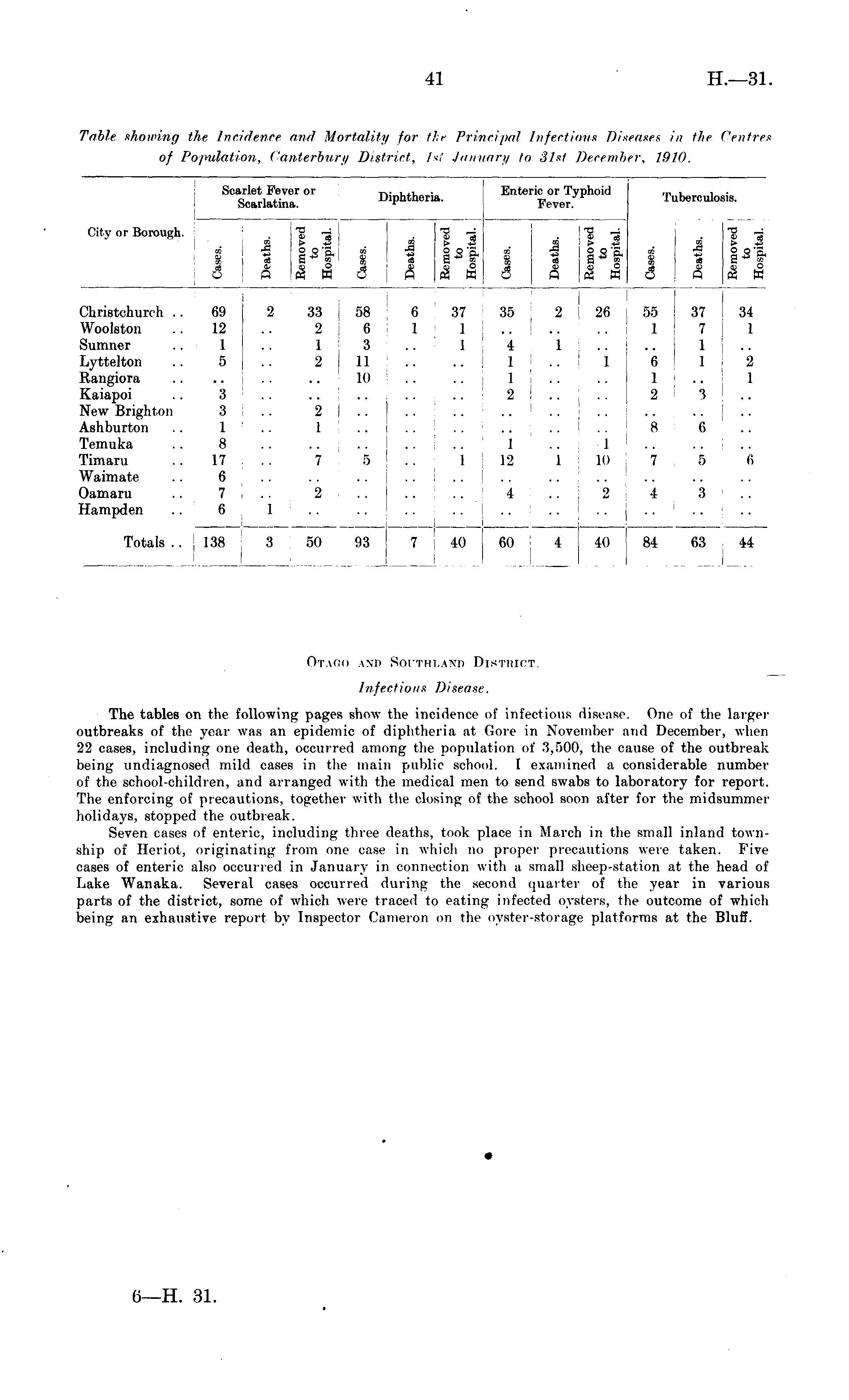 Otaqo and Southland District Infectious Disease. The tables on the following pages show the incidence of infectious disease. One of the larger outbreaks of the year was an epidemic of diphtheria at (lore in November and December, when 22 cases, including one death, occurred among the population of 3,500, the cause of the outbreak being undiagnosed mild cases in the main public school. I examined a considerable number of the school-children, and arranged with the medical men to send swabs to laboratory for report. The enforcing of precautions, together with the closing of the school soon after for the midsummer holidays, stopped the outbreak. Seven cases of enteric, including three deaths, took place in March in the small inland township of Heriot, originating from one case in which tin proper precautions were taken. Five cases of enteric also occurred in January in connection with a small sheep-station at the head of Lake Wanaka. Several cases occurred during the second quarter of the year in various parts of the district, some of which were traced to eating infected oysters, the outcome of which being an exhaustive report by Inspector Cameron mi the oyster-storage platforms at the Bluff.