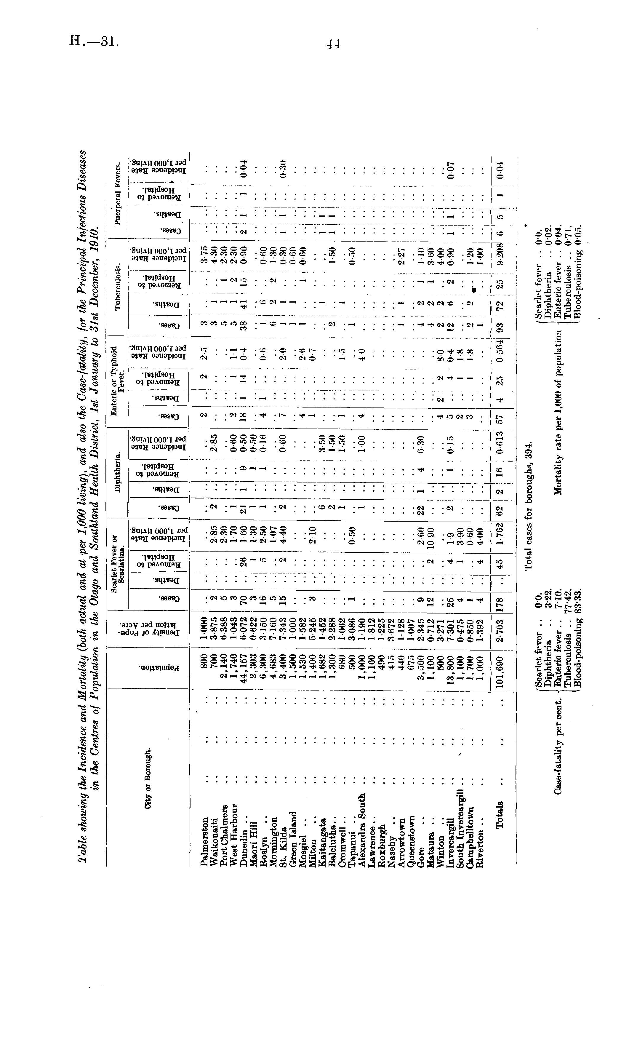 Total cases for boroughs, 394. f Scarlet fever .. o'o. I Scarlet fever .. 00. ] Diphtheria .. 322. | Diphtheria .. 002. Case-fatality per oent. - Enteric fever .. 7-10. Mortality rate per 1,000 of population i Enteric fever .. 0-04. Tuberculosis .. 77-42. Tuberculosis .. 0-71. I Blood-poisoning 8333. 'Blood-poisoning 005.