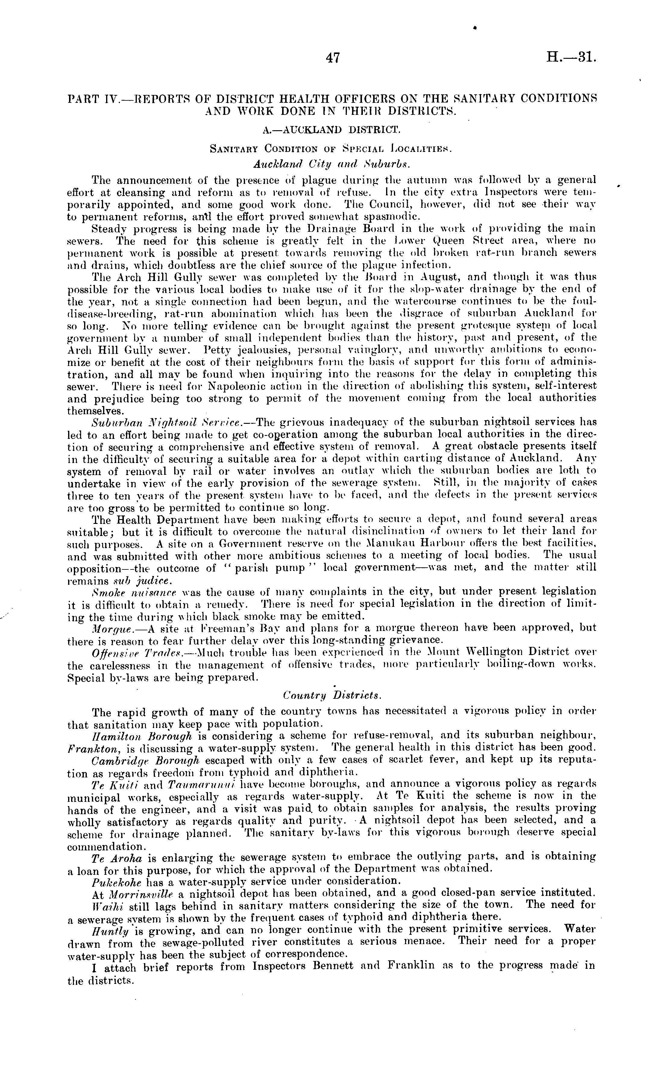 PART IV.—REPORTS OF DISTRICT HEALTH OFFICERS ON THK SANITARY CONDITIONS AND WORK DONE IX THEIR DISTRICTS. A—AUCKLAND DISTRICT. Sanitary Condition of Special Localities. Auckland City aml Suburbs. The announcement of the presence of plague during the autumn was followed by a general efforl at cleansing and reform as to removal of refuse. In the city extra Inspectors were tern porarily appointed, and some good work done. The Council, however, did not see their way to permanent reforms, and the effort proved somewhat spasi lie. Steady progress is being made by the Drainage Board in the work of providing the main sewers. The need for this scheme is greatly felt in the Lower Queen Street area, where no permanent work is possible at present towards removing the old broken rat-run branch sewers and drains, which doubtless are the chief source of the plague infection. The Arch Hill GuUy sewer was completed by the Board in August, and though it was thus possible for the various local bodies to make use of it for the slop-water drainage by the end of the year, not a single connection had been begun, and the watercourse continues to be the foul-disease-breeding, rat-run abomination which has been the disgrace of suburban Auckland for so long. No more telling evidence can be brought against the present grotesque system of local government by a number of small independent bodies than the history, past and present, of the Arch Hill Gully sewer. Petty jealousies, personal vainglory, and unworthy ambitions to economize or benefit at the cost of their neighbours form the basis of support for this form of administration, and all may be found when inquiring into tin- reasons for the delay in completing this sewer. There is need for Napoleonic action in the direction of abolishing this system, self-interest and prejudice being too strong to permit of the movement coming from the local authorities i hemselves. Suburban Nightsoil Service. The grievous inadequac) of the suburban nightsoil services has led to an effort being made to gel co-operation a tig the suburban local authorities in the direction of securing a comprehensive and effective system of removal. A great obstacle presents itself in the difficult) of securing a suitable area for a depot within carting distance of Auckland. Any system of removal by rail or water involves an outlay which the suburban bodies are loth to undertake in view of the early provision of the sewerage system. Still, in the majority of cases three to ten years of the present system have to be faced, and the defects in the present services are too gross to be permitted to continue so long. The Health Department have been making efforts to secure a depot, ami found, several areas suitable; but it is difficult to overcome the natural disinclination 'if owners to let their land for such purposes. A site on a Government reserve on the Manukau Harbour offers the best facilities, and was submitted with other more ambitious schemes to a meeting of local bodies. The usual opposition t!u outcome of " parish pump " local government —was met, and the matter still remains sub jin/ice. Smoke nuisance was the cause of many complaints in the city, but under present legislation it is difficult to obtain a remedy. There is need fur special legislation in the direction of limiting the time during which black smoke may be emitted. Morgue. A site at Freeman's Baj and plans for a morgue thereon have been approved, bin there is reason to fear further delay over 1 his long-standing grievance. Offensivt Trades. —Much trouble has been experienced in the Mount Wellington District over the carelessness in the management of offensive trades, more particularly boiling-down works. Special by-laws are being prepared. ( 'ountvij Districts. The rapid growth of many of the country towns has necessitated a vigorous policy in unlet that sanitation may keep pace with population. Hamilton Horoui/li is considering a scheme for refuse-removal, and its suburban neighbour. Frankton, is discussing a water-supply system. The general health in this district has been good. Cambridgt Borough escaped with only a few cases of scarlet fever, and kept up its reputation as regards freedom from typhoid and diphtheria. Te Kuiti and Taumai uii'ii have become boroughs, and announce a vigorous policy as regards municipal works, especially as regards water-supply. At Te Kuiti the scheme is now iii the hands of the engineer, and a visit was paid, to obtain samples for analysis, the results proving wholly satisfactory as regards quality and purity. A nightsoil depot has been selected, and a Bc heme for drainage planned. The sanitarv by-laws for this vigorous borough deserve special commendat ion. Te Aroha is enlarging the sewerage system to embrace the outlying parts, and is obtaining B l oai ] for this purpose, for which the approval of the Department was obtained. Pukekohe has a water-supply service under consideration. At Morrinsvillt a nightsoil depot has been obtained, and a g 1 closed-pan service instituted. Waihi still bigs behind in sanitary matters considering the size of the town. The need for a sewerage system is shown by the frequent cases of typhoid and diphtheria there. l/unfli/ is growing, and can no longer continue with the present primitive services. Water drawn from the sewage-polluted river constitutes a serious menace. Their need for a proper water-supply has been the subject of correspondence. 1 attach brief reports from Inspectors Bennett and Franklin as to the progress made in the districts.