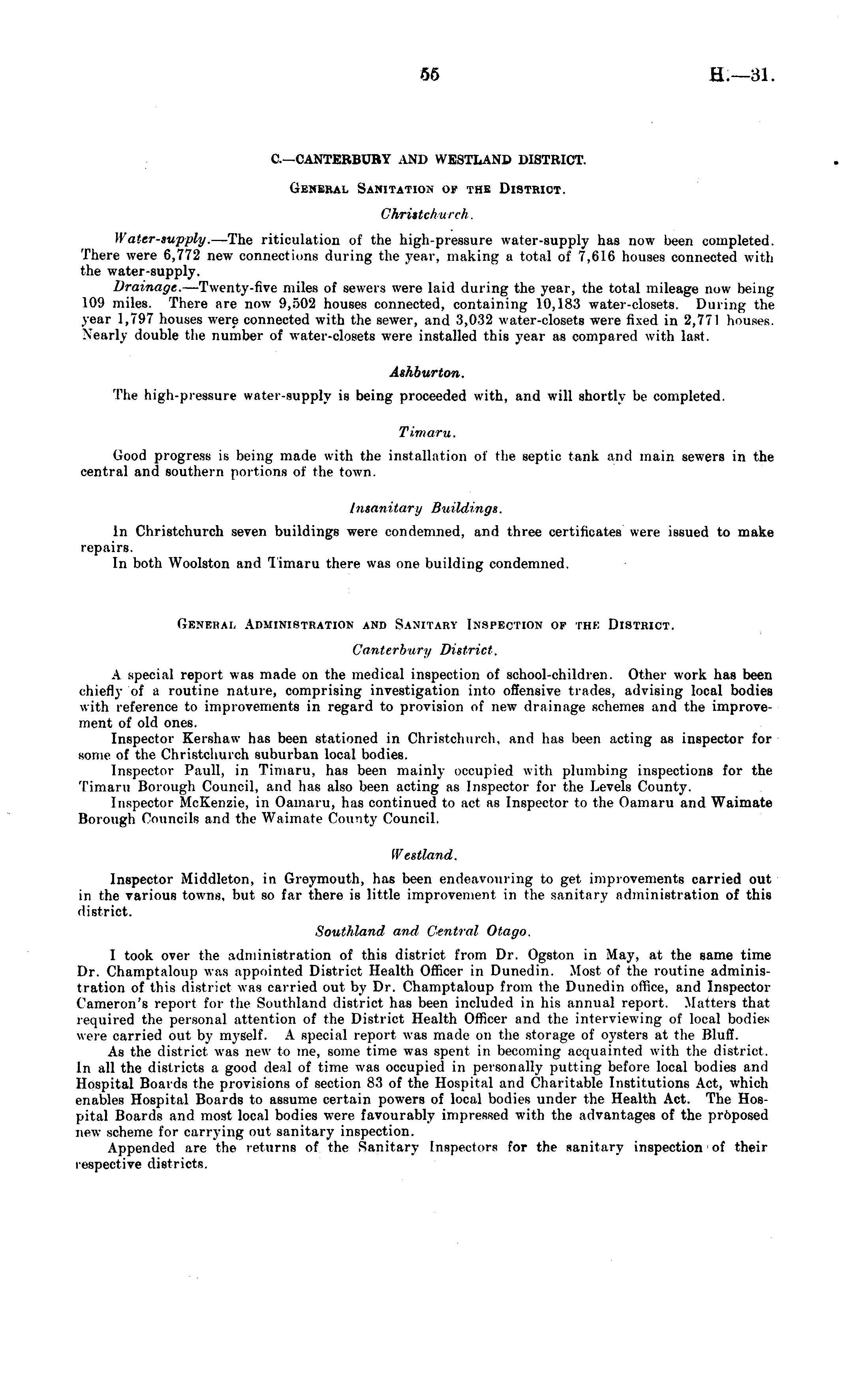 C—CANTERBURY AND WESTLAND DISTRICT. General Sanitation of the District. Christchurch. Water-supply. —The riticulation of the high-pressure water-supply has now been completed. There were 6,772 new connections during the year, making a total of 7,616 houses connected with the water-supply. Drainage. —Twenty-five miles of sewers were laid during the year, the total mileage now being 109 miles. There are now 9,502 houses connected, containing 10,183 water-closets. During the year 1,797 houses were connected with the sewer, and 3,032 water-closets were fixed in 2,771 houses. Nearly double the number of water-closets were installed this year as compared with last. Ashburton. The high-pressure water-supply is being proceeded with, and will shortly be completed. Timaru. Good progress is being made with the installation of the septic tank and main sewers in the central and southern portions of the town. Insanitary Buildings. In Christchurch seven buildings were condemned, and three certificates were issued to make repairs. In both Woolston and Timaru there was one building condemned. General Administration and Sanitary Inspection of thk District. Canterbury District. A special report was made on the medical inspection of school-children. Other work has been chiefly of a routine nature, comprising investigation into offensive trades, advising local bodies with reference to improvements in regard to provision of new drainage schemes and the improvement of old ones. Inspector Kershaw has been stationed in Christchurch, and has been acting as inspector for some of the Christchurch suburban local bodies. Inspector Paull, in Timaru, has been mainly occupied with plumbing inspections for the Timaru Borough Council, and has also been acting as Inspector for the Levels County. Inspector McKenzie, in Oamaru, has continued to act as Inspector to the Oamaru and Waimate Borough Councils and the Waimate County Council. Westland. Inspector Middleton, in Greymouth, has been endeavouring to get improvements carried out in the various towns, but so far there is little improvement in the sanitary administration of this district. Southland and Central Otago. I took over the administration of this district, from Dr. Ogston in May, at the same time Dr. Champtaloup was appointed District Health Officer in Dunedin. Most of the routine administration of this district was carried out by Dr. Champtaloup from the Dunedin office, and Inspector Cameron's report for the Southland district has been included in his annual report. Matters that required the personal attention of the District Health Officer and the interviewing of local bodies were carried out by myself. A special report was made on the storage of oysters at the Bluff. As the district was new to me, some time was spent in becoming acquainted with the district. In all the districts a good deal of time was occupied in personally putting before local bodies and Hospital Boards the provisions of section 83 of the Hospital and Charitable Institutions Act, which enables Hospital Boards to assume certain powers of local bodies under the Health Act. The Hospital Boards and most local bodies were favourably impressed with the advantages of the proposed new scheme for carrying out sanitary inspection. Appended are the returns of the Sanitary Inspectors for the sanitary inspection of their respective districts.