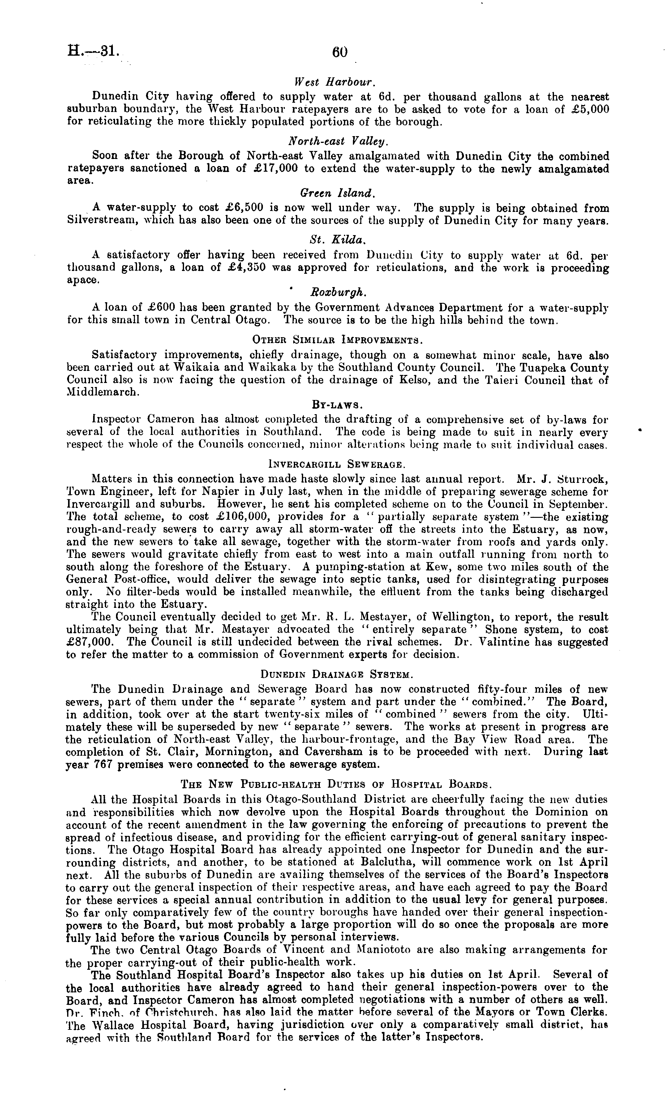 West Harbour. Dunedin City having offered to supply water at 6d. per thousand gallons at the nearest suburban boundary, the West Harbour ratepayers are to be asked to vote for a loan of £5,000 for reticulating the more thickly populated portions of the borough. North-east Valley. Soon after the Borough of North-east Valley amalgamated with Dunedin City the combined ratepayers sanctioned a loan of £17,000 to extend the water-supply to the newly amalgamated area. Green Island. A water-supply to cost £6,500 is now well under way. The supply is being obtained from Silverstream, which has also been one of the sources of the supply of Dunedin City for many years. St. Kilda. A satisfactory offer having been received from Dunedin City to supply water at 6d. per thousand gallons, a loan of £4,350 was approved for reticulations, and the work is proceeding apace. Roxburgh. A loan of £600 has been granted by the Government Advances Department for a water-supply for this small town in Central Otago. The source is to be the high hills behind the town. Other Similar Improvements. Satisfactory improvements, chiefly drainage, though on a somewhat minor scale, have also been carried out at Waikaia and Waikaka by the Southland County Council. The Tuapeka County Council also is now facing the question of the drainage of Kelso, and the Taieri Council that of Middlemarch. By-laws. inspector Cameron has almost completed the drafting of a comprehensive set of by-laws for several of the local authorities in Southland. The code is being made to suit in nearly every respect the whole of the Councils concerned, minor alterations being made to suit individual cases. Invercargill Sewerage. Matters in this connection have made haste slowly since last annual report. Mr. J. Sturrock, Town Engineer, left for Napier in July last, when in the middle of preparing sewerage scheme for Invercargill and suburbs. However, he sent his completed scheme on to the Council in September. The total scheme, to cost £106,000, provides for a "partially separate system"—the existing rough-and-ready sewers to carry away all storm-water off the streets into the Estuary, as now, and the new sewers to take all sewage, together with the storm-water from roofs and yards only. The sewers would gravitate chiefly from east to west into a main outfall running from north to south along the foreshore of the Estuary. A pumping-station at Kew, some two miles south of the General Post-office, would deliver the sewage into septic tanks, used for disintegrating purposes only. No filter-beds would be installed meanwhile, the ettluent from the tanks being discharged straight into the Estuary. The Council eventually decided to get Mr. R. L. Mestayer, of Wellington, to report, the result ultimately being that Mr. Mestayer advocated the "entirely separate" Shone system, to cost £87,000. The Council is still undecided between the rival schemes. Dr. Valintine has suggested to refer the matter to a commission of Government experts for decision. Dunedin Drainage System. The Dunedin Drainage and Sewerage Board has now constructed fifty-four miles of new sewers, part of them under the " separate " system and part under the " combined." The Board, in addition, took over at the start twenty-six miles of "combined " sewers from the city. Ultimately these will be superseded by new " separate " sewers. The works at present in progress are the reticulation of North-east Valley, the harbour-frontage, and the Bay* View Road area. The completion of St. Clair, Momington, and Caversham is to be proceeded with next. During last year 767 premises were connected to the sewerage system. The New Public-health Duties ok Hospital Boards. All the Hospital Boards in this Otago-Southland District are cheerfully facing the new duties and responsibilities which now devolve upon the Hospital Boards throughout the Dominion on account of the recent amendment in the law governing the enforcing of precautions to prevent the spread of infectious disease, and providing for the efficient carrying-out of general sanitary inspections. The Otago Hospital Board has already appointed one Inspector for Dunedin and the surrounding districts, and another, to be stationed at Balclutha, will commence work on Ist April next. All the suburbs of Dunedin are availing themselves of the services of the Board's Inspectors to carry out the general inspection of their respective areas, and have each agreed to pay the Board for these services a special annual contribution in addition to the usual levy for general purposes. So far only comparatively few of the country boroughs have handed over their general inspectionpowers to the Board, but most probably a large proportion will do so once the proposals are more fully laid before the various Councils by personal interviews. The two Central Otago Boards of Vincent and Maniototo are also making arrangements for the proper carrying-out of their public-health work. The Southland Hospital Board's Inspector also takes up his duties on Ist April. Several of the local authorities have already agreed to hand their general inspection-powers over to the Board, and Inspector Cameron has almost completed negotiations with a number of others as well. Dr. Finch, of Christchurch. has rlso laid the matter before several of the Mayors or Town Clerks. The Wallace Hospital Board, having jurisdiction over only a comparatively small district, has agreed with the Southland Board for the services of the latter's Inspectors.