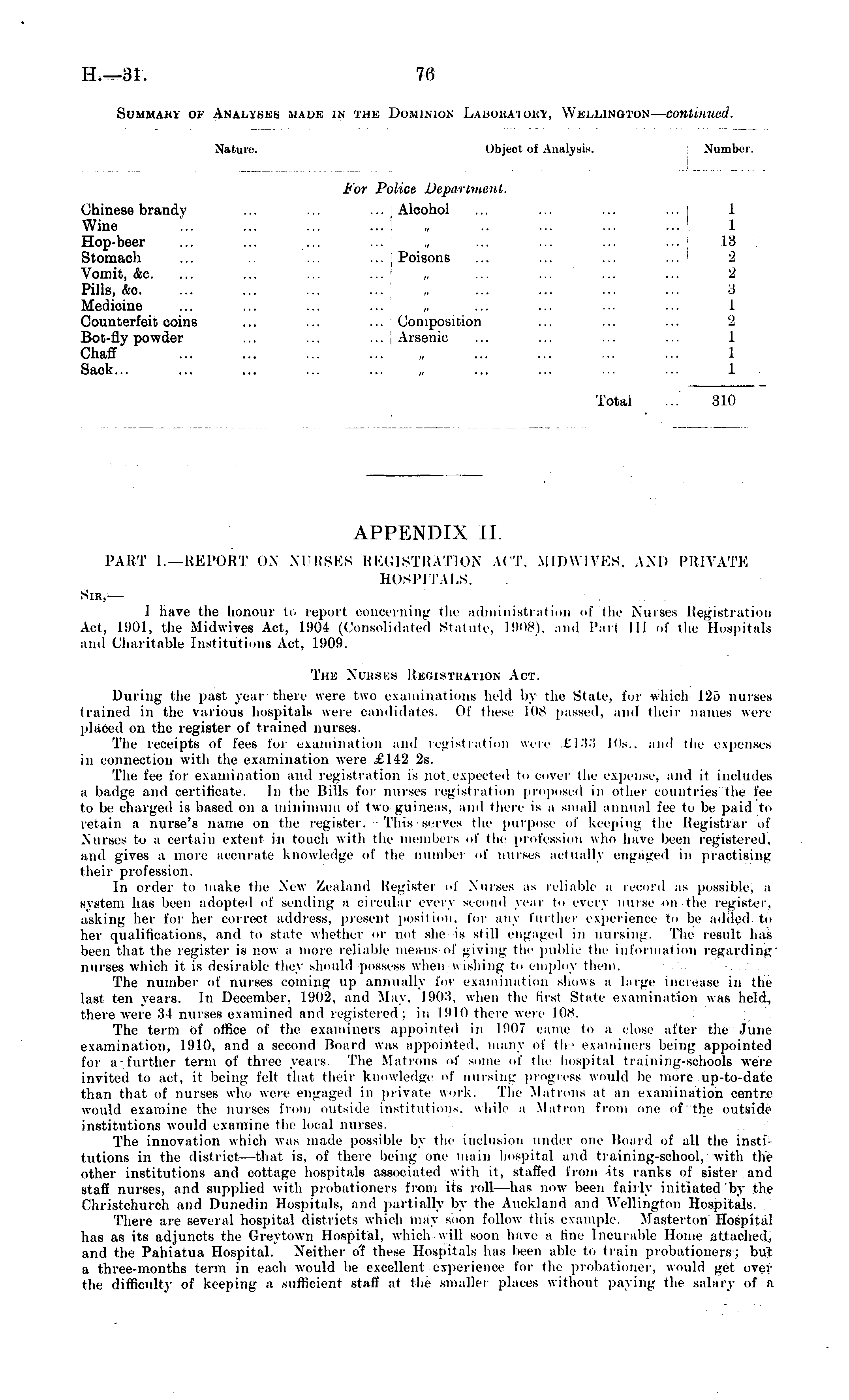 Nature. Object of Analysis. .Number. Chinese brandy Wine Hop-beer Stomach Vomit, &c Pills, &c Medicine Counterfeit coins Bot-fly powder Chaff Sack... For Police Department. ... Alcohol ... Poisons ... pf ... ... ... Composition ... ] Arsenic ... i 1 1 18 2 2 3 1 2 1 1 1 Total 310