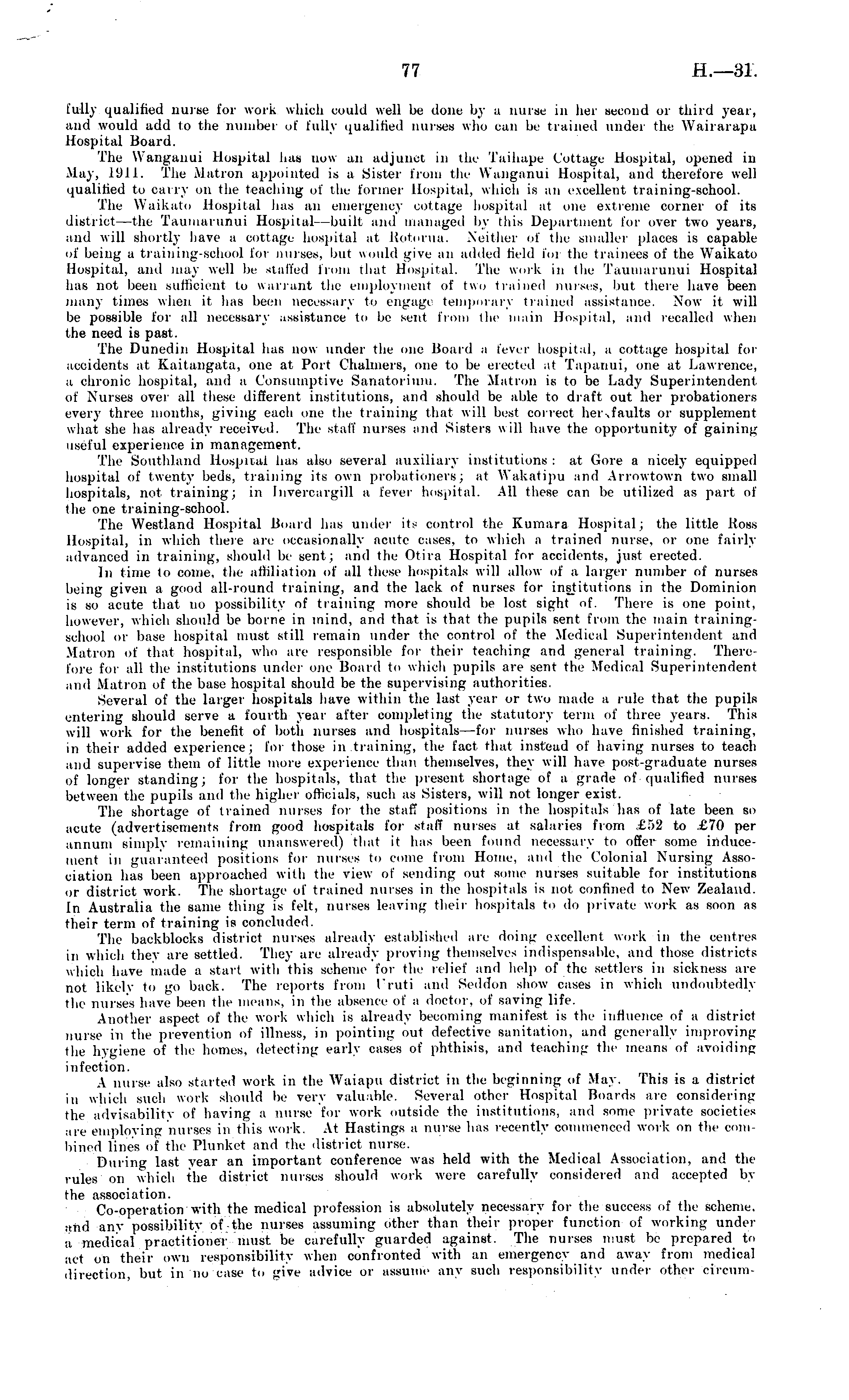 fully qualified nurse for work which could well be done by a nurse in her second or third year, and would add to the number of fully qualified nurses who can be trained under the Wairarapa Hospital Hoard. The Wanganui Hospital lias now an adjunct in the Taihape Cottage Hospital, opened in May, 1911. The Matron appointed is a Sister from the Wanganui Hospital, and therefore well qualified to carry on the teaching of I he former Hospital, which is an excellent training-school. The Waikato Hospital has an emergency cottage hospital at one extreme corner of its district —the Tauniarunui Hospital—built and managed by this Department for over two years, and will shortly have a cottage hospital at liot.orua. Neither of the smaller places is capable of being a training-school for nurses, but would give an added field foi the trainees of the Waikato Hospital, and may well lie stalled from that Hospital. The work in the Tauniarunui Hospital has not been sufficient to warrant the employment of two trained nurses, bul there have been many times when it has been necessary to engage temporary trained assistance. Now it will be possible for all necessary assistance to be sent from the main Hospital, and recalled when the need is past. The Dunedin Hospital has now under the one Hoard a fever hospital, a cottage hospital for accidents at Kaitangata, one at Purl Chalmers, one to lie erected at Tapanui. one at Lawrence, a chronic hospital, and a Consumptive Sanatorium. The Matron is to be Lady Superintendent of Nurses over all these different institutions, and should be able to draft out her probationers every three months, giving each one the training that will best correct her faults or supplement what she has already received. The staff nurses and Sisters will have the opportunity of gaining useful experience in management. The Southland Hospital has also several auxiliary institutions : at (hire a nicely equipped hospital of twenty beds, training its own probationers; at W'akatipu and Arrowtown two small hospitals, not training; in Invercargill a fever hospital. All these can lie utilized as part of the one training-school. The Westland Hospital Board has under its control the Kumara Hospital; the little Ross Hospital, in which there ale occasionally acute cases, to which a trained nurse, or one fairly advanced in training, should be sent ; and the Otira Hospital for accidents, just erected. In time to come, tin- affiliation of all these hospitals will allow of a larger number of nurses being given a good all-round training, and the lack of nurses for institutions in the Dominion is so acute that no possibility of training more should be lost sight of. There is one point, however, which should be borne in mind, and that is that the pupils sent from the main training school or base hospital must still remain under the control of the Medical Superintendent and Matron of that hospital, who are responsible for their teaching and general training. Therefore for all the institutions under one Board to which pupils are sent the Medical Superintendent and Matron of the base hospital should be the supervising authorities. Several of the larger hospitals have within the last year or two made a rule that the pupils entering should serve a fourth year after completing the statutory term of three years. This will work for the benefit of both nurses and hospitals—for nurses who have finished training, in their added experience; for those in training, the fact that instead of having nurses to teach and supervise them of little more experience than themselves, they will have post-graduate nurses of longer standing; for the hospitals, that the present shortage of a grade of qualified nurses between the pupils and the higher officials, such as Sisters, will not longer exist. The shortage of trained nurses for the staff positions in the hospitals has of late been so acute (advertisements from good hospitals for staff nurses at salaries from £52 to .£7O per annum simplv remaining unanswered) that it has been found necessary to offer some inducement in guaranteed positions for nurses to come from Home, and the Colonial Nursing Asso oiation has been approached with the view of sending out some nurses suitable for institutions or district work. The shortage of trained nurses in the hospitals is not confined to New Zealand. In Australia the same thing is felt, nurses leaving their hospitals to do private work as soon as their term of training is concluded. The backblocks district nurses already established are doing excellent work in the centres in which they are settled. They are already proving themselves indispensable, and those districts which have made a start with this scheme for the relief and help of the settlers in sickness are not likelv to go back. The reports from I'ruti and Scddon show cases in which undoubtedly the nurses have been the means, in the absence of a doctor, of saving life. Another aspect of the work which is already becoming manifest is tin- influence of a district nurse in the prevention of illness, in pointing out defective sanitation, and generally improving the hygiene of the homes, detecting early cases of phthisis, and teaching the means of avoiding infection. A nurse also started work in the Waiapu district in the beginning of May. This is a district in which such work should be very valuable. Several other Hospital Boards are considering the advisability of having a nurse for work outside the institutions, and some private societies are employing nurses in this work. At Hastings a nurse has recently commenced work on the com bined lines of the Plunket and the district nurse. During last year an important conference was held with the Medical Association, and the rules on which the district nurses should work were carefully considered and accepted by (lie association. Co-operation with the medical profession is absolutely necessary for the success of the scheme, and any possibility of 