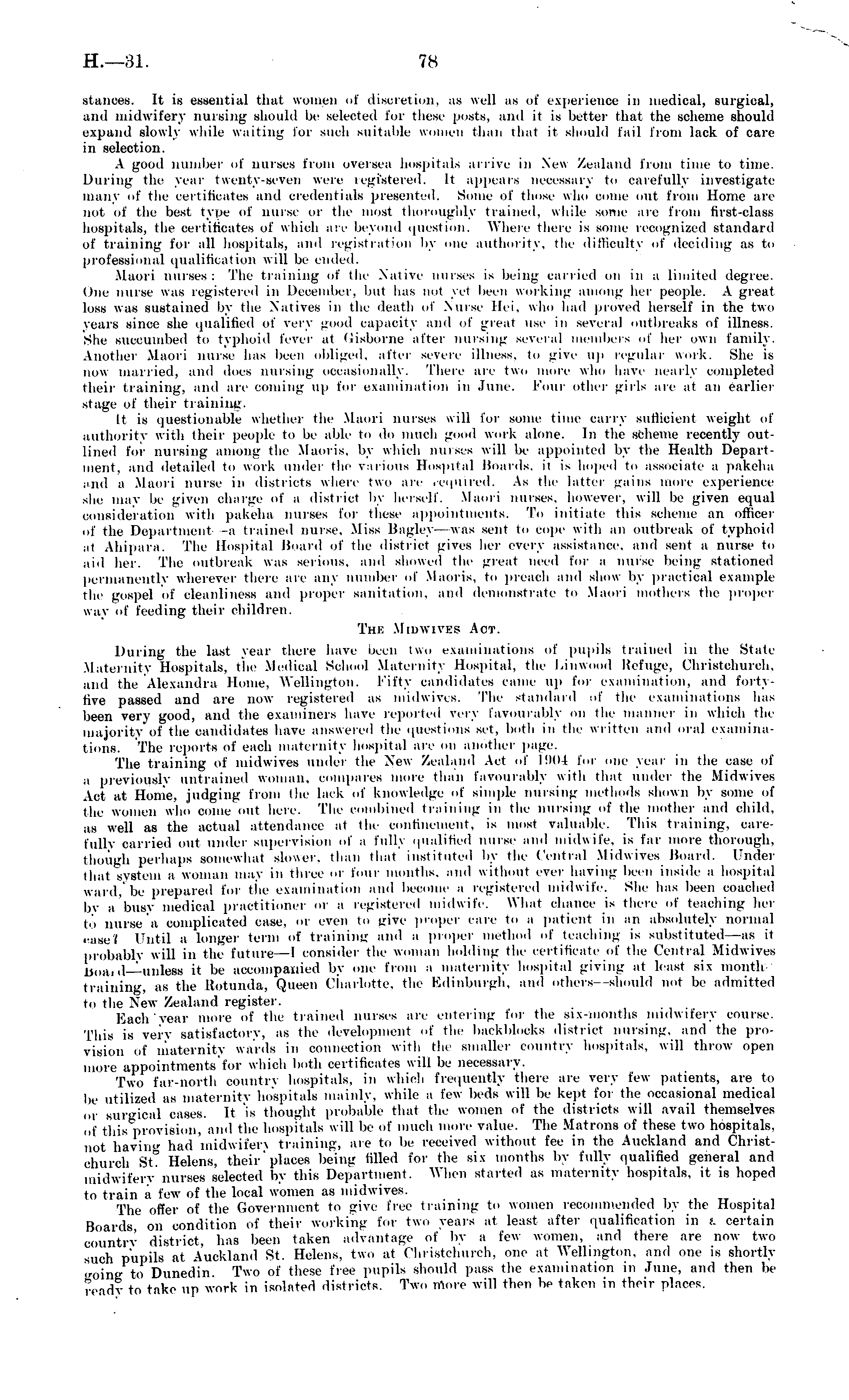 stances. It is essential that women of discretion, as well as of experience in medical, surgical, and midwifery nursing should he selected for these posts, and it is better (hat the scheme should expand slowly while waiting for such suitable women than that it should fail from lack of cartin selection. A good number of nurses from oversea hospitals arrive in New Zealand from lime to time. During the year twenty-seven were registered. It appears necessary to carefully investigate many of the certificates and credentials presented. Some of those who come out from Home are not of the best type of nurse or the most thoroughly trained, while some are from first-class hospitals, tin- certificates of which are beyond question. Where there is some recognized standard of training for all hospitals, and registration by one authority, the difficulty of deciding as to professional qualification will be ended. Maori nurses: The training of the Native nurses is being carried on in a limited degree. One nurse was registered in December, but has not yet been working among her people. A great loss was sustained by the Natives in the death of .Nurse Dei, who had proved herself in the two years since she qualified of vcvy good capacity and of great use in several outbreaks of illness. She succumbed to typhoid fever at Gisborne after nursing several members of her own family. Another Maori nurse has been obliged, after severe illness, to give up regular work. She is now married, and does nursing occasionally. There are two more who have nearly completed their training, and are coming up for examination in June. four other girls are at an earlier stage of their training. It is questionable whether the Maori nurses will for some time carry sufficient weight of authority with their people to be able to do nineh good work alone. In the scheme recently outlined for nursing among the Maoris, by which nuises will be appointed by the Health Department, and detailed to work under the various Hospital Hoards, it is hoped to associate a pakeha and a Maori nurse in districts where two are required. As the latter gains more experience she mav be given charge of a district by herself. Maori nurses, however, will be given equal consideration with pakeha nurses for these appointments. To initiate this scheme an officer of the Department a trained nurse. Miss Bagley —was sent to cope with an outbreak of typhoid at Ahipara. The Hospital Hoard of the district gives her every assistance, and sent a nurse to aid her. The outbreak was serious, and showed the great need for a nurse being stationed permanently wherever there are any number of Maoris, to preach and show by practical example the gospel of cleanliness and proper sanitation, and demonstrate to Maori mothers the proper way of feeding their children. Thk Midwives Aot. During the last year there have been two examinations of pupils trained in the State Maternity Hospitals, tin- Medical School Maternity Hospital, the Linwood Refuge, Christchurch. and the Alexandra Home. Wellington. fifty candidates came 11 j> for examination, and fortyfive passed and are now registered as midwives. The standard of the examinations has been very good, and the examiners have reported very favourably on the manner in which the majority of the candidates have answered the questions set, both in the written and oral examinations. The reports of each maternity hospital are on another page. The training of midwives under the New Zealand Act of 1904 for one year in the ease of a previously untrained woman, compares more than favourably with that under the Midwives Act at Honie, judging from the lack of knowledge of simple nursing methods shown by some of the women who come out here. The combined training in the nursing of the mother and child, as well as the actual attendance at the confinement, is most valuable. This training, care fully carried out under supervision of a fully qualified nurse and midwife, is far more thorough, though perhaps somewhat slower, than that instituted by the Central Midwives Board. Under that svsteni a woman mav in three or four months, and without ever having been inside a hospital ward," be prepared for the examination and become a registered midwife. She has been coached by a busy medical practitioner or a registered midwife. What chance is there of teaching hello nurse a complicated case, or even to give proper cave to a patient in an absolutely normal easel Until a longer term of training and a proper method of teaching is substituted—as it probably will in the future —I consider the woman holding the certificate of the Central Midwives boajd—unless it be accompanied by one from a maternity hospital giving at least six month training, as the Rotunda, Queen Charlotte, the Edinburgh, and others- -should not be admitted to the New Zealand register. Each year more of the trained nurses are entering for the six-months midwifery course. This is very satisfactory, as the development of the backblocks district nursing, and the provision of maternity wards in connection with the smaller country hospitals, will throw open more appointments for which both certificates will be necessary. Two far-north country hospitals, in which frequently there are very few patients, are to be utilized as maternity hospitals mainly, while a few beds will be kept for the occasional medical or surgical cases. It is thought probable that the women of the districts will avail themselves of this provision, and the hospitals will be of much more value. The Matrons of these two hospitals, not having had midwiferj training, ate to be received without fee in the Auckland and Christchurch St. Helens, their'places being Idled for the six months by fully qualified general and midwifery nurses selected by this Department. When started as maternity hospitals, it is hoped to train a few of the local women as midwives. The offer of the Government to give free training to women recommended by the H