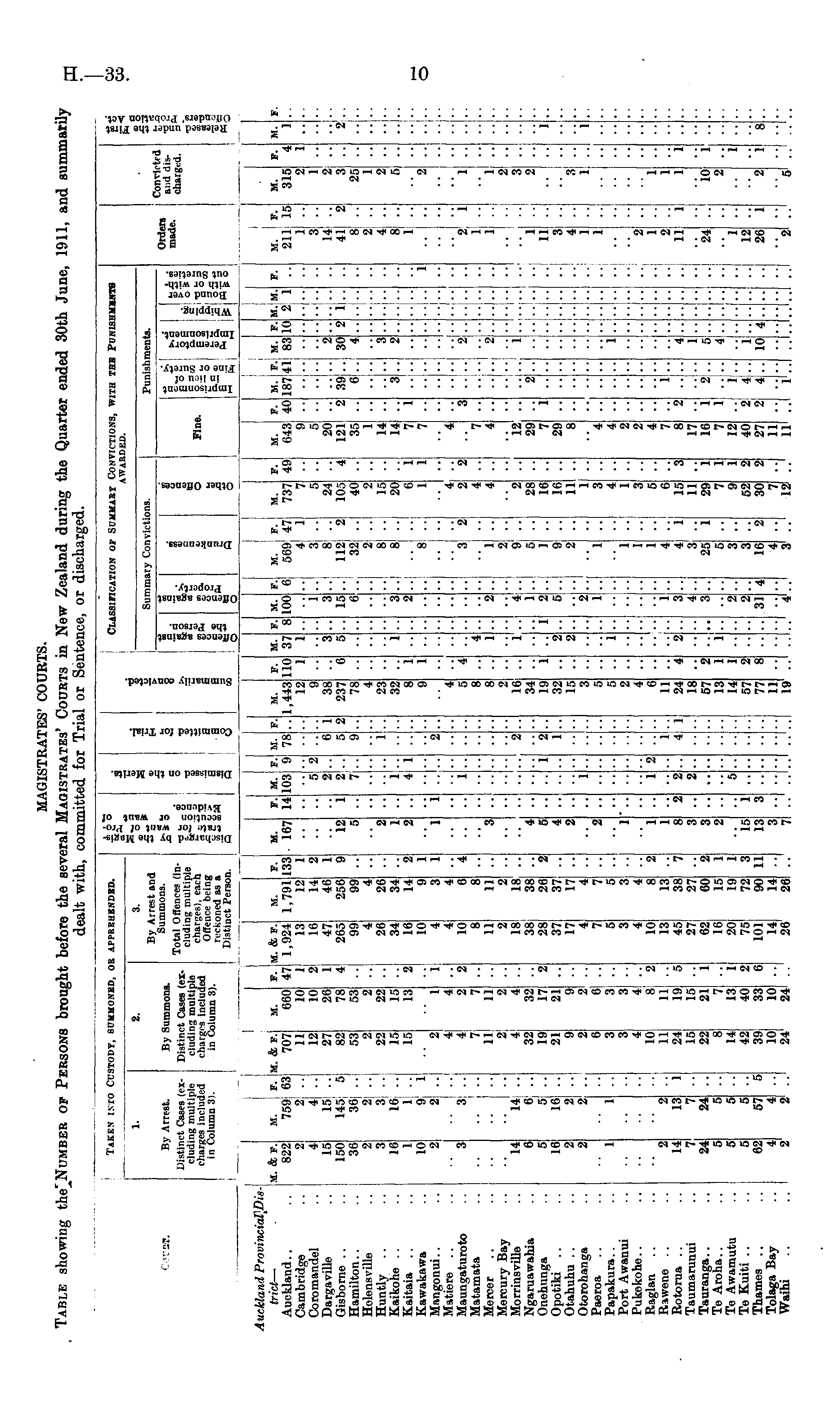 MAGISTRATES' COURTS. Table showing of Persons brought before the several Magistrates' Courts in New Zealand during the Quarter ended 30th June, 1911, and summarily dealt with, committed for Trial or Sentence, or discharged.